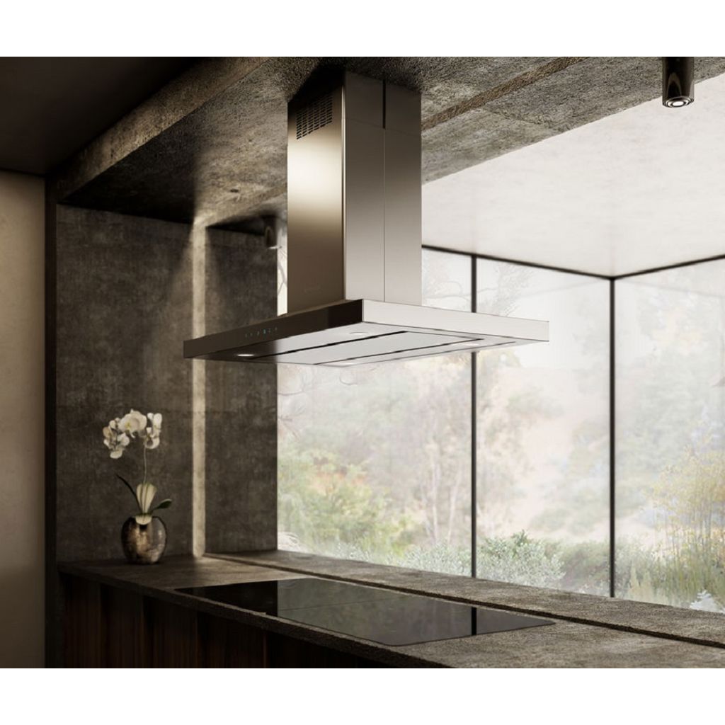 Island hood with 600 CFM internal fan, 3 stainless steel micro-hole filters, dishwasher-safe, 4 halogen lights, heat shield, electronic controls, and LCD screen