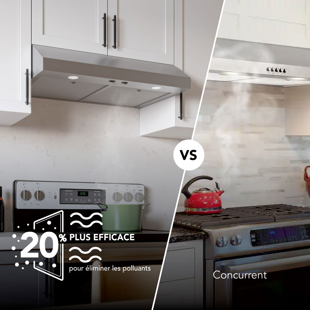 The durable hood vent is up to 20% more effective at removing pollutants than the leading competitor with power ventilation at 350 Max Blower CFM to capture and remove smoke and odors from the kitchen.