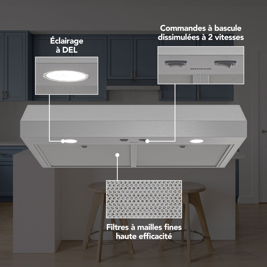 The 1-Level LED lighting and a 2-Speed hidden rocker controls make cooking a breeze. At Broan-NuTone we believe that better quality of air means better quality of life.