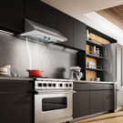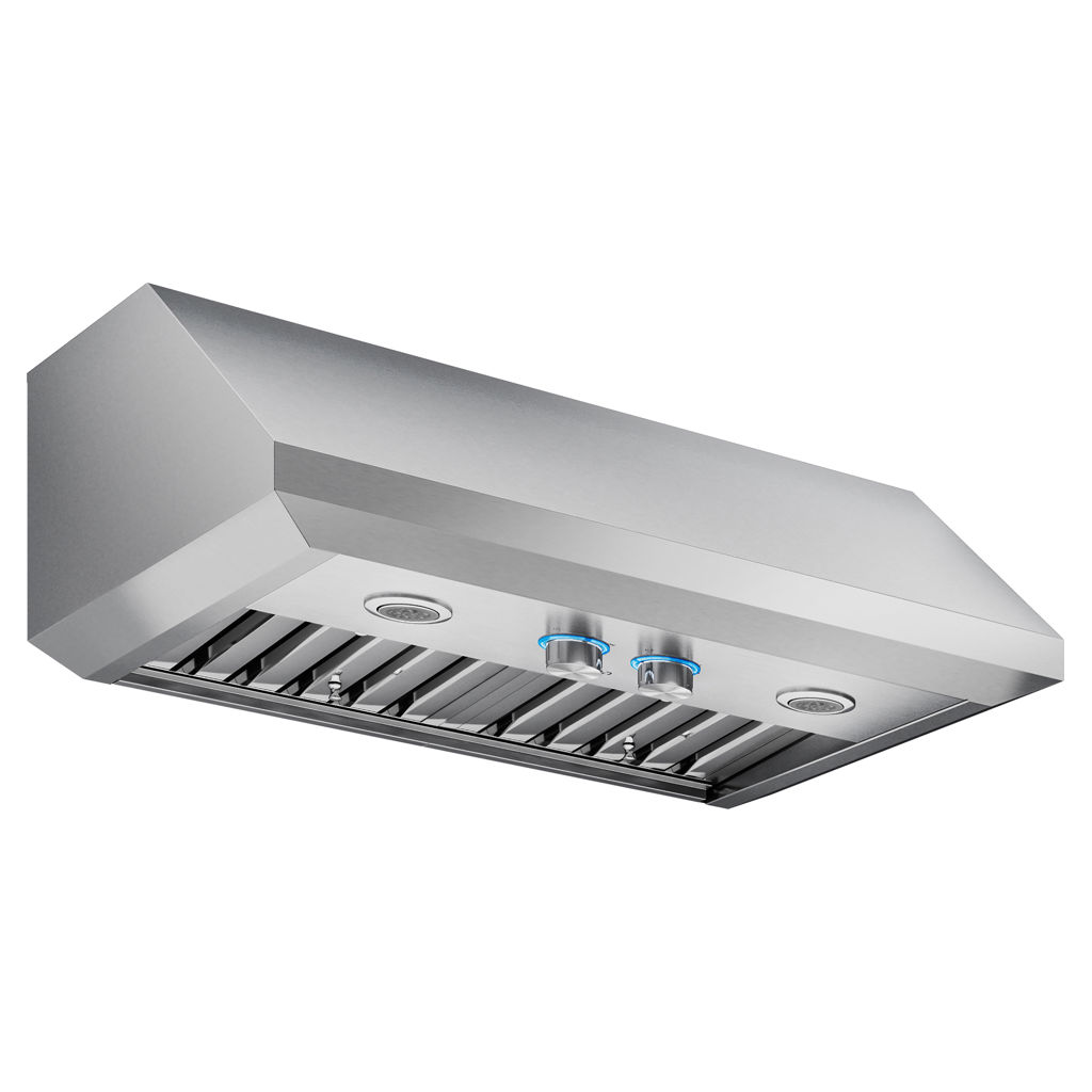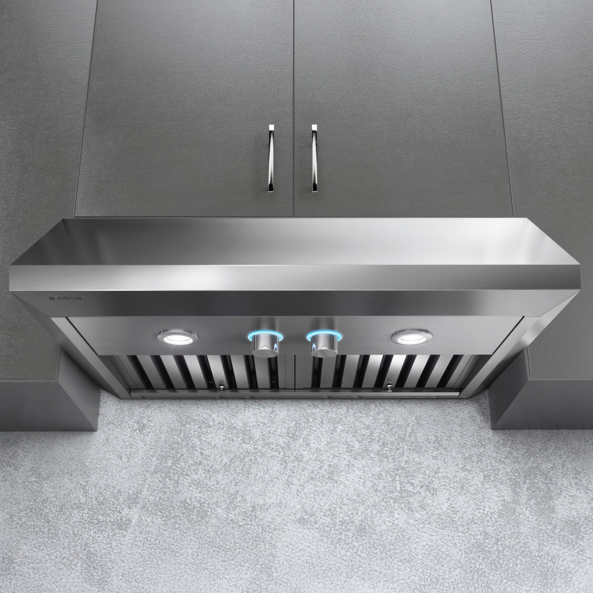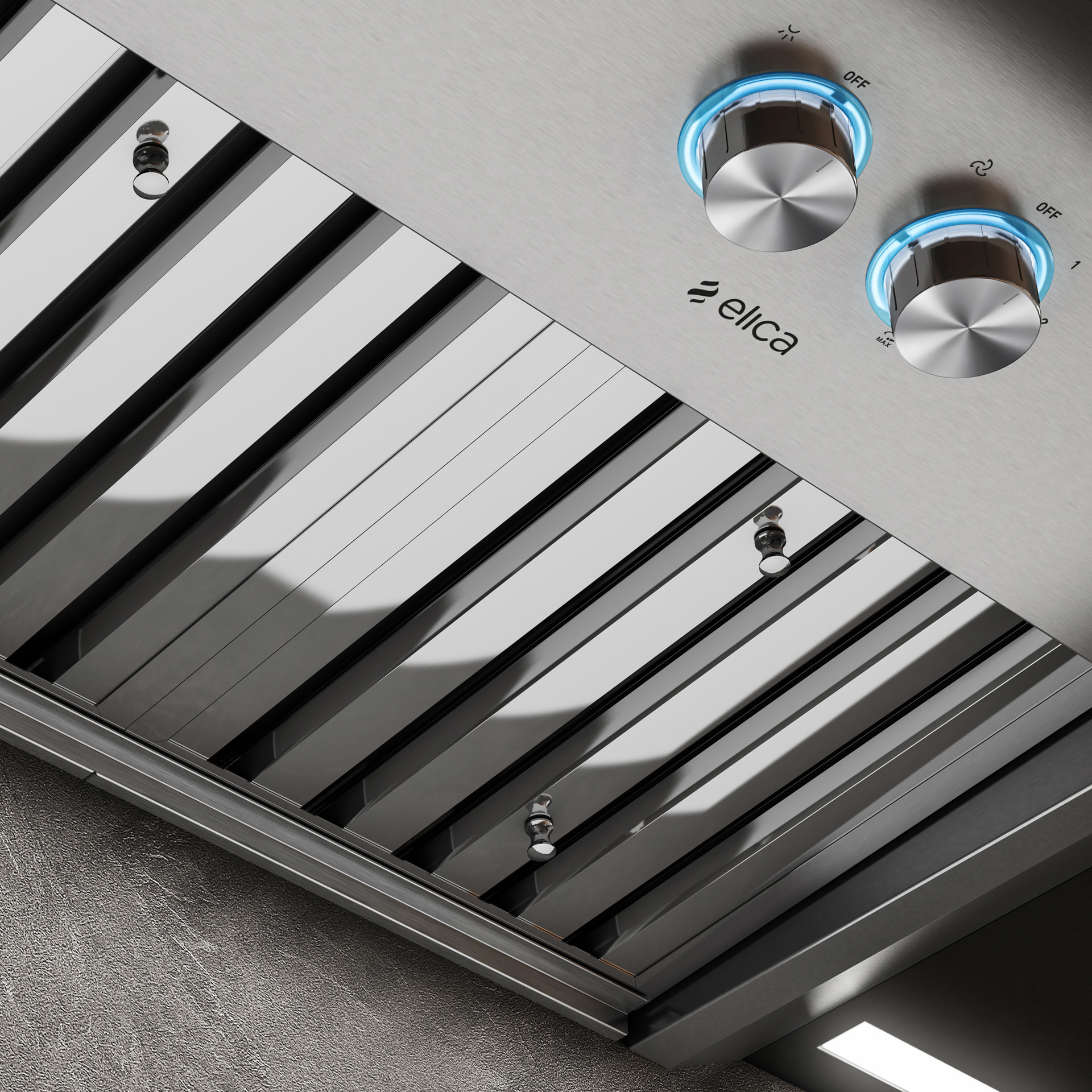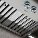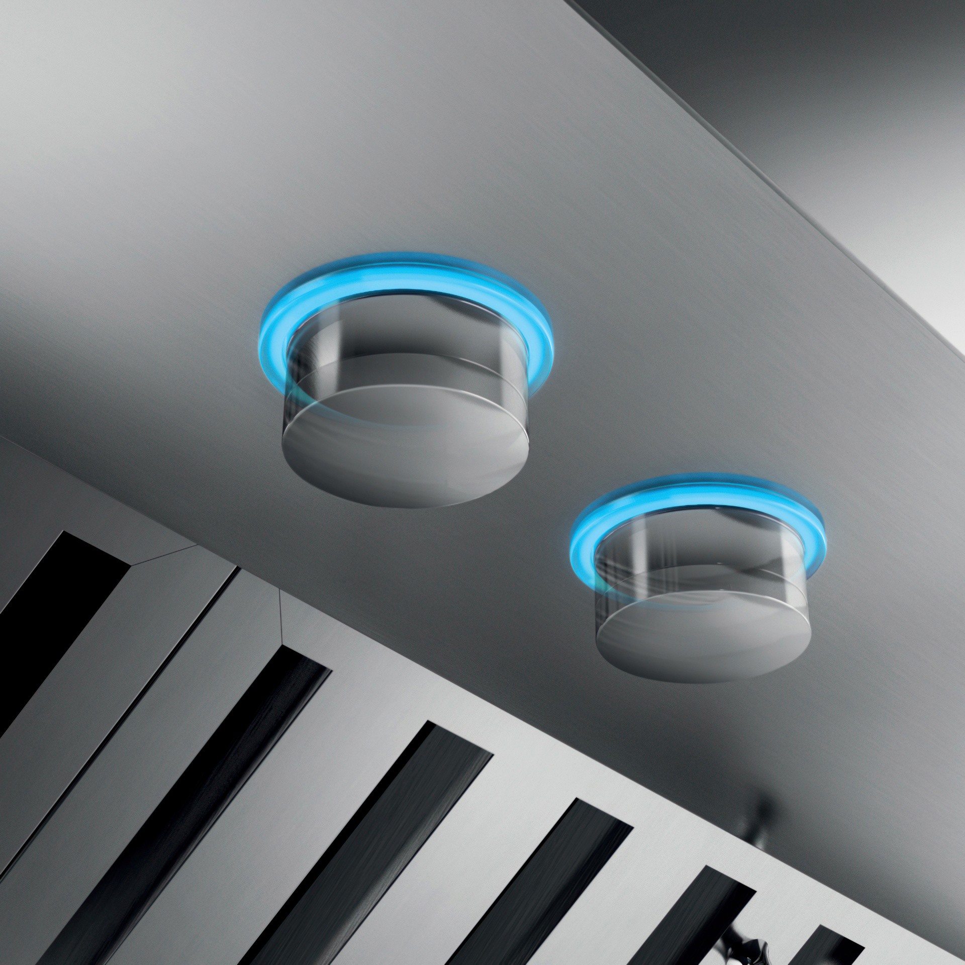 For optimal functionality, it comes equipped with durable stainless steel baffle grease filters, replaceable LED lighting, and concealed backlit metal on/off buttons for added comfort and safety.