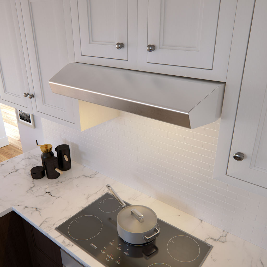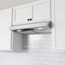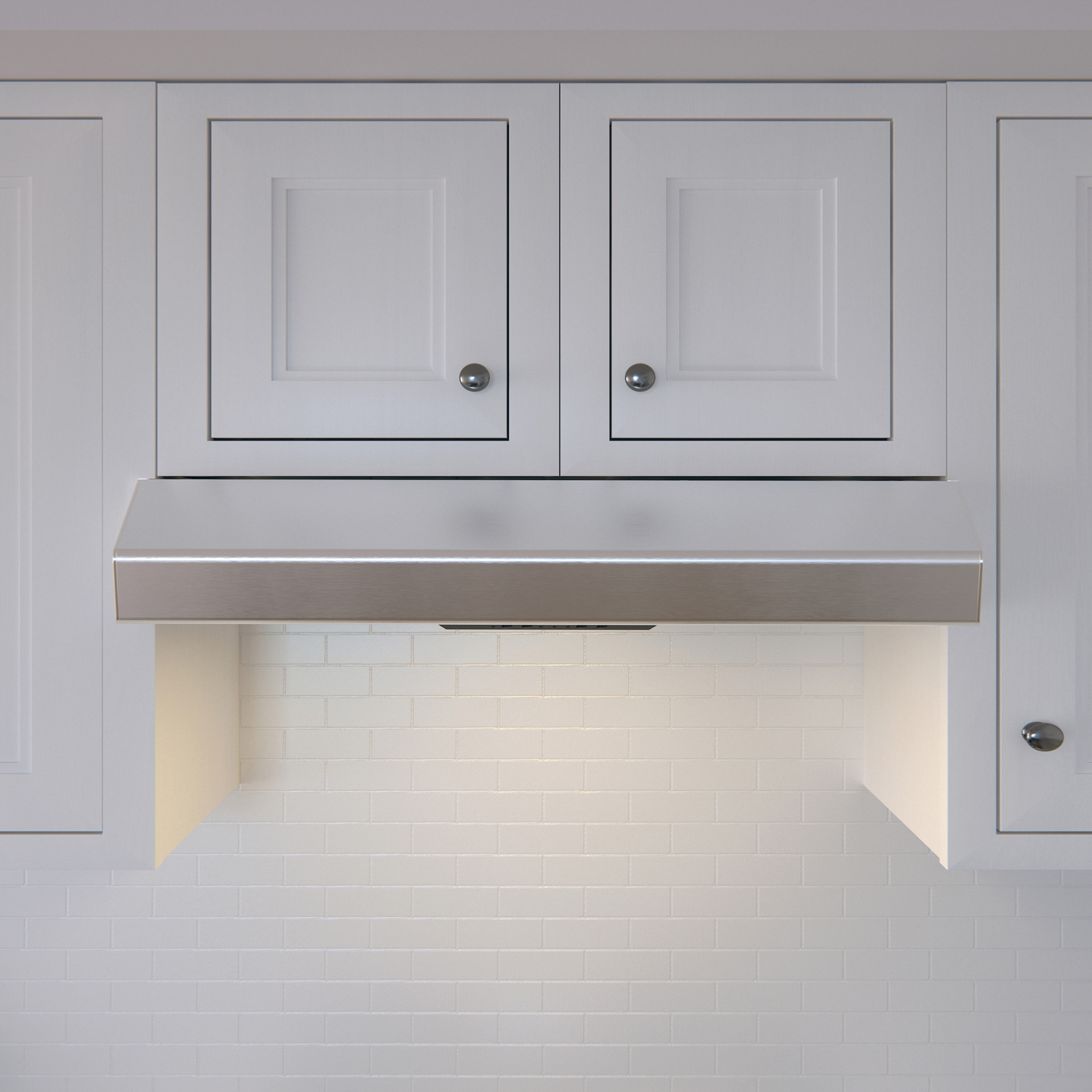 Available in stainless steel, black, and white finishes, this low-profile range hood is designed for both style and value.
