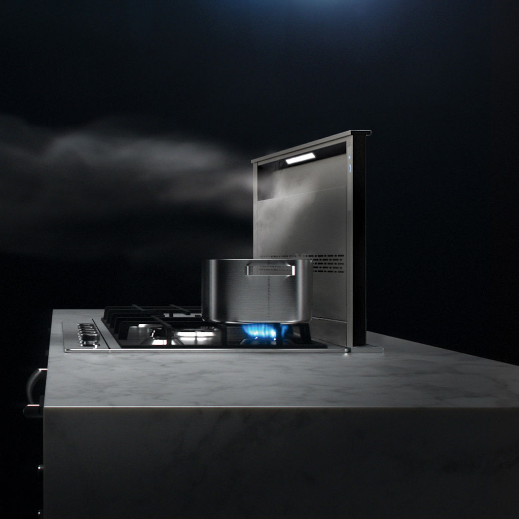 Press a button and the Cattura quickly rises to a height of 18 inches to strongly reach even the front burners. The self-closing cap completely hides the downdraft from view, leaving your countertop clear and uncluttered.