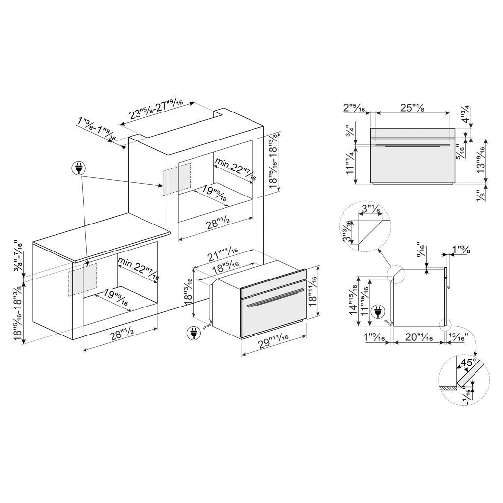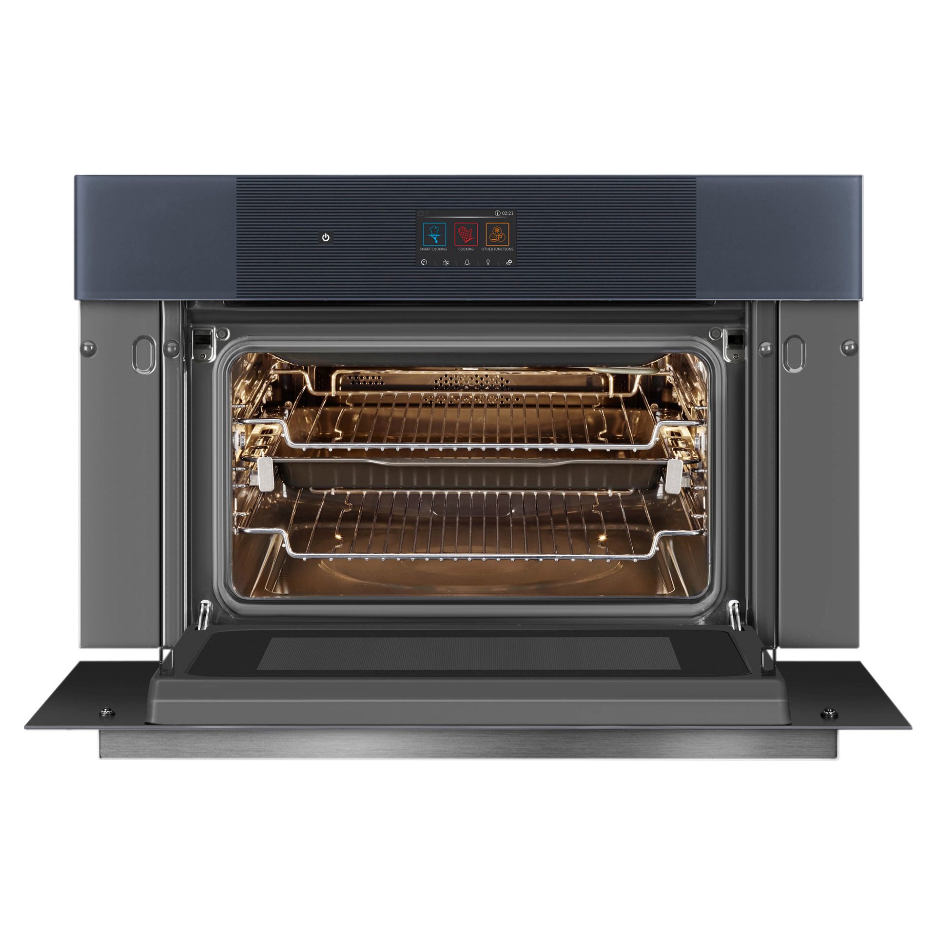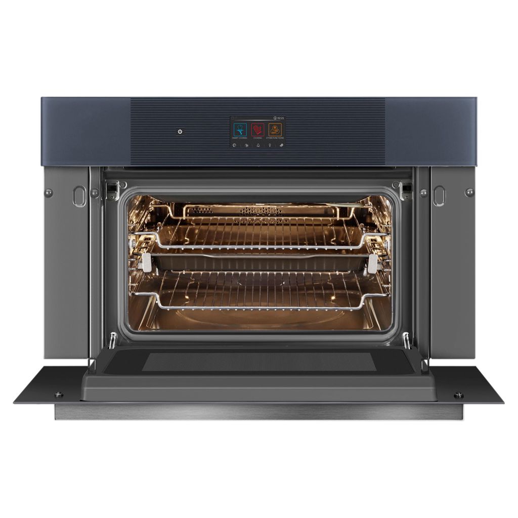 The oven is equipped with an advanced soft-close door feature, allowing it to close smoothly and silently.