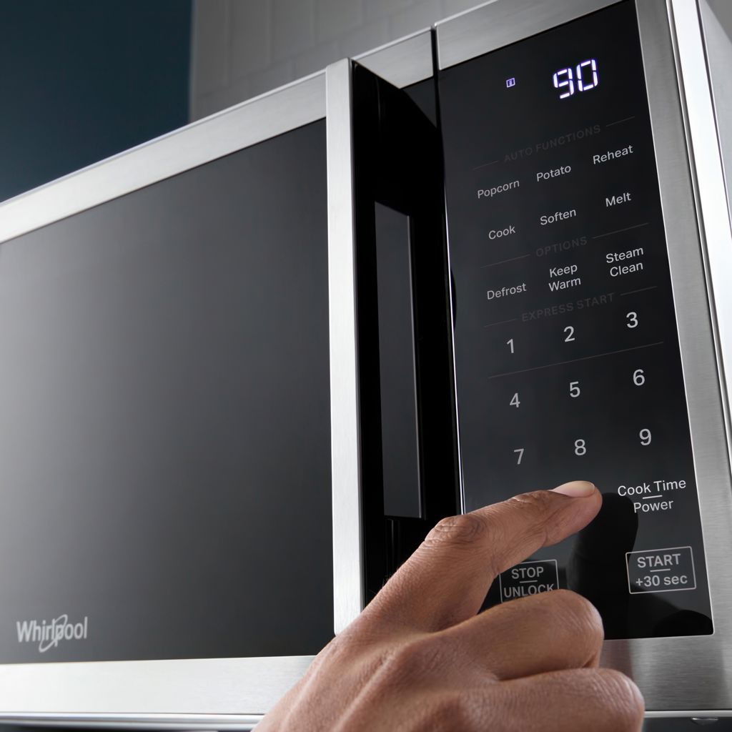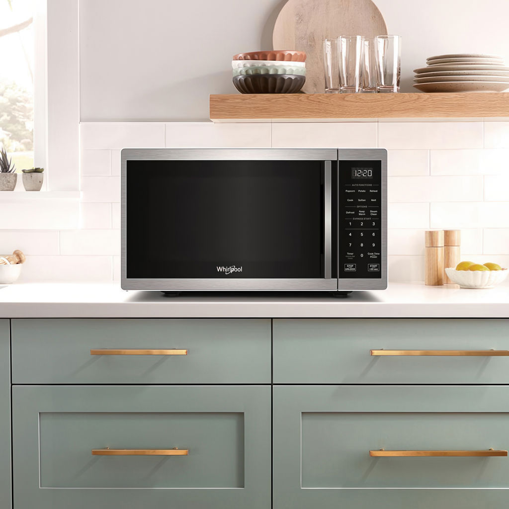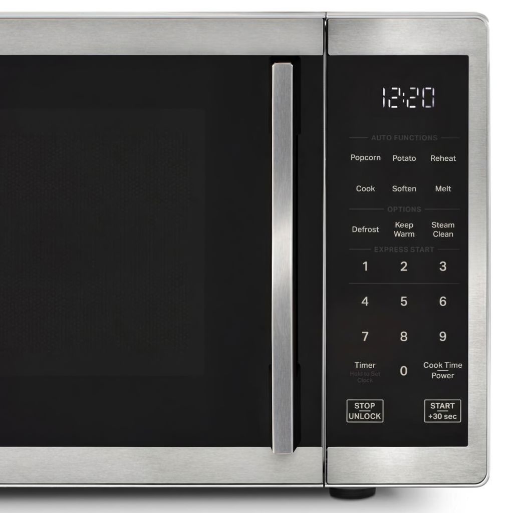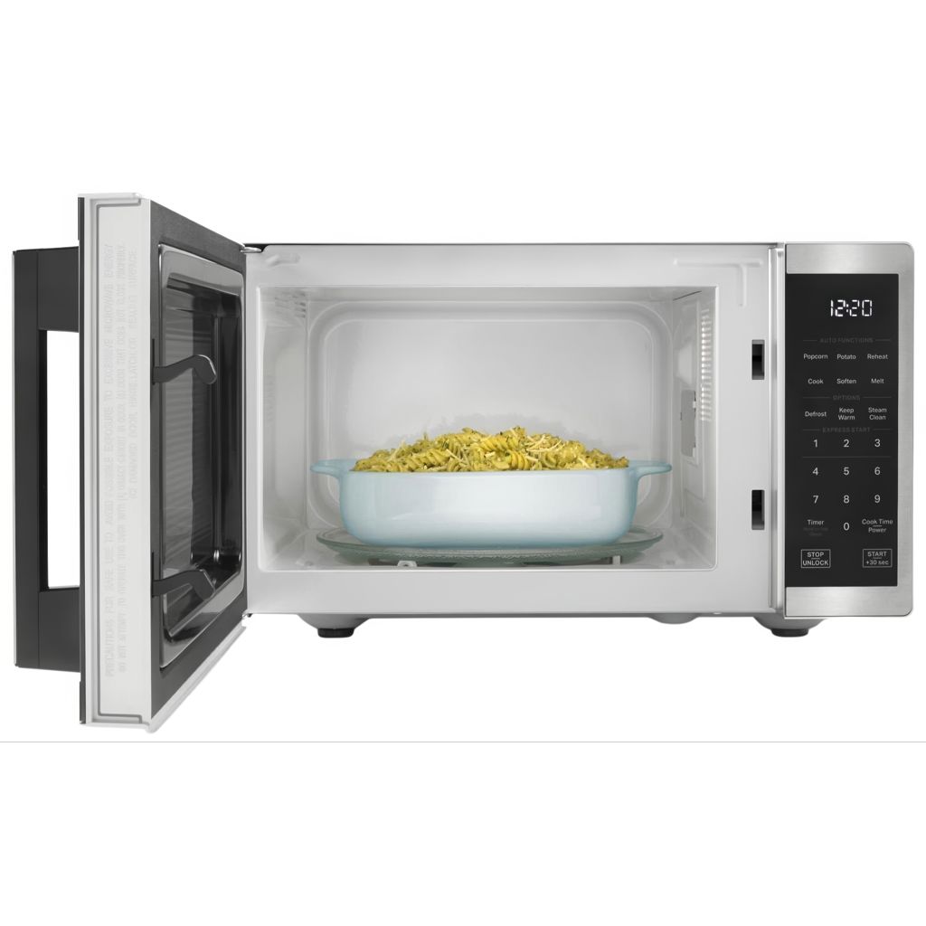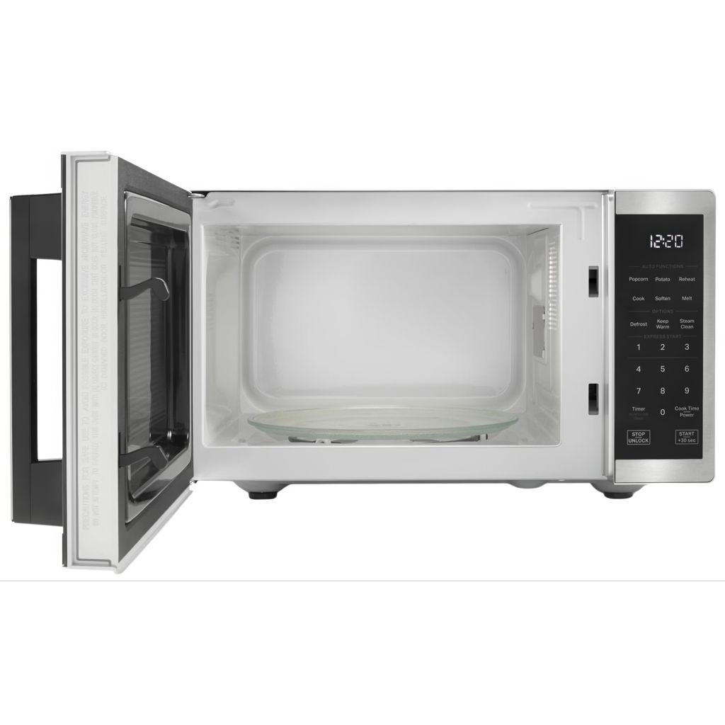This 0.9 cu. ft. capacity, 900-watt stainless steel microwave with electronic touch controls and white LED display will enhance your kitchen with its modern, user-friendly design, dishwasher-safe turntable and steam cleaning system.