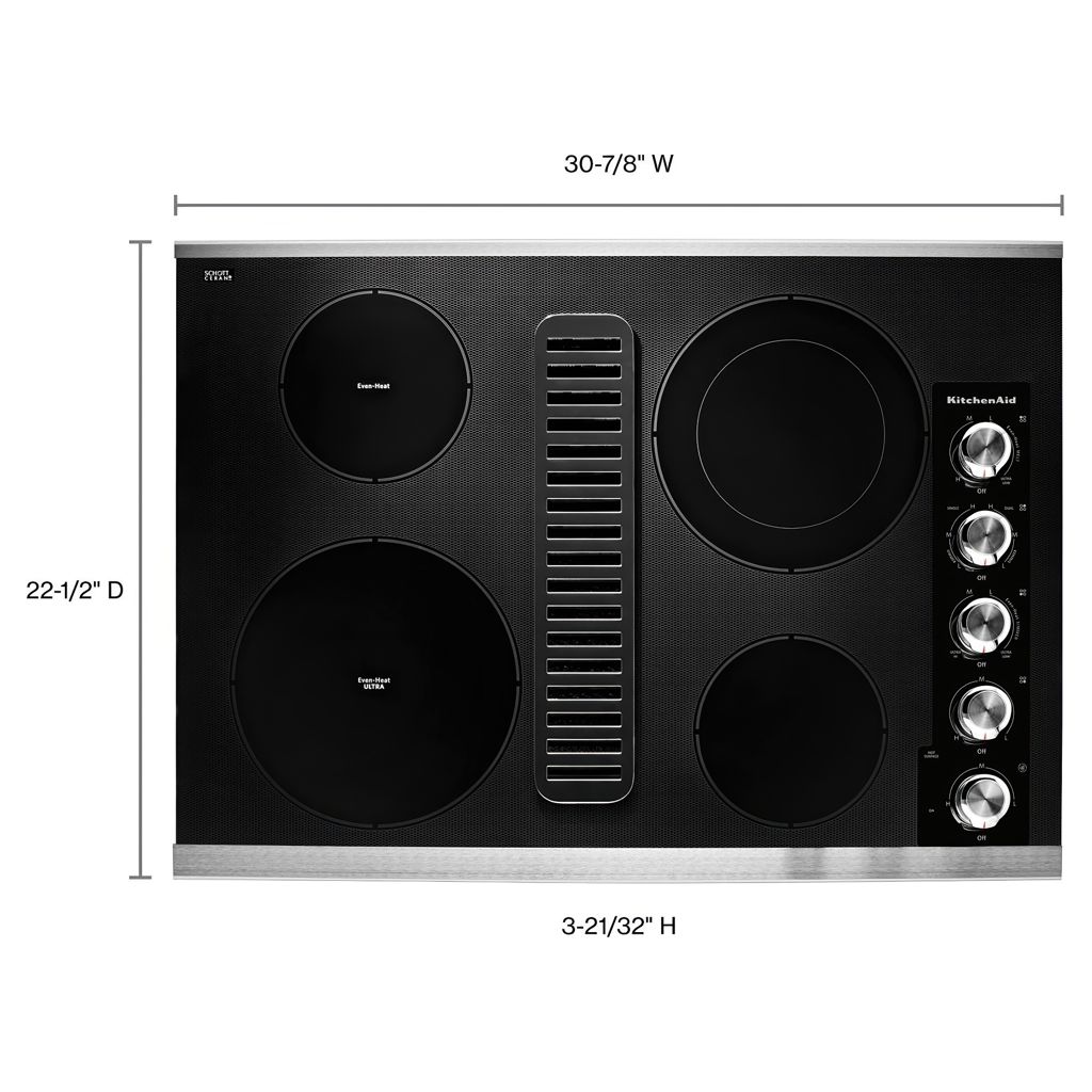 30" Electric Downdraft Cooktop With 4 Elements, 300 CFM centre fan system. KitchenAid KCED600GSS