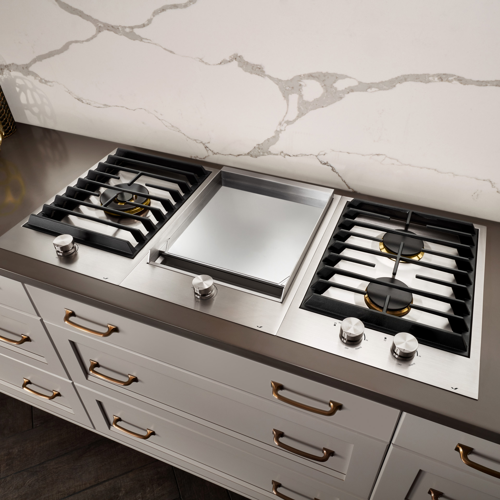 This modular gas cooktop with two stacked 15,000 BTU PowerTM burners is designed to deliver professional power in a 15“ design and can be paired with a 30” or 36” gas cooktop or a single-burner gas cooktop. Other matching features include brass burners and illuminated base knobs that enhance the low profile, minimalist appearance and near-flush installation on your countertop.
