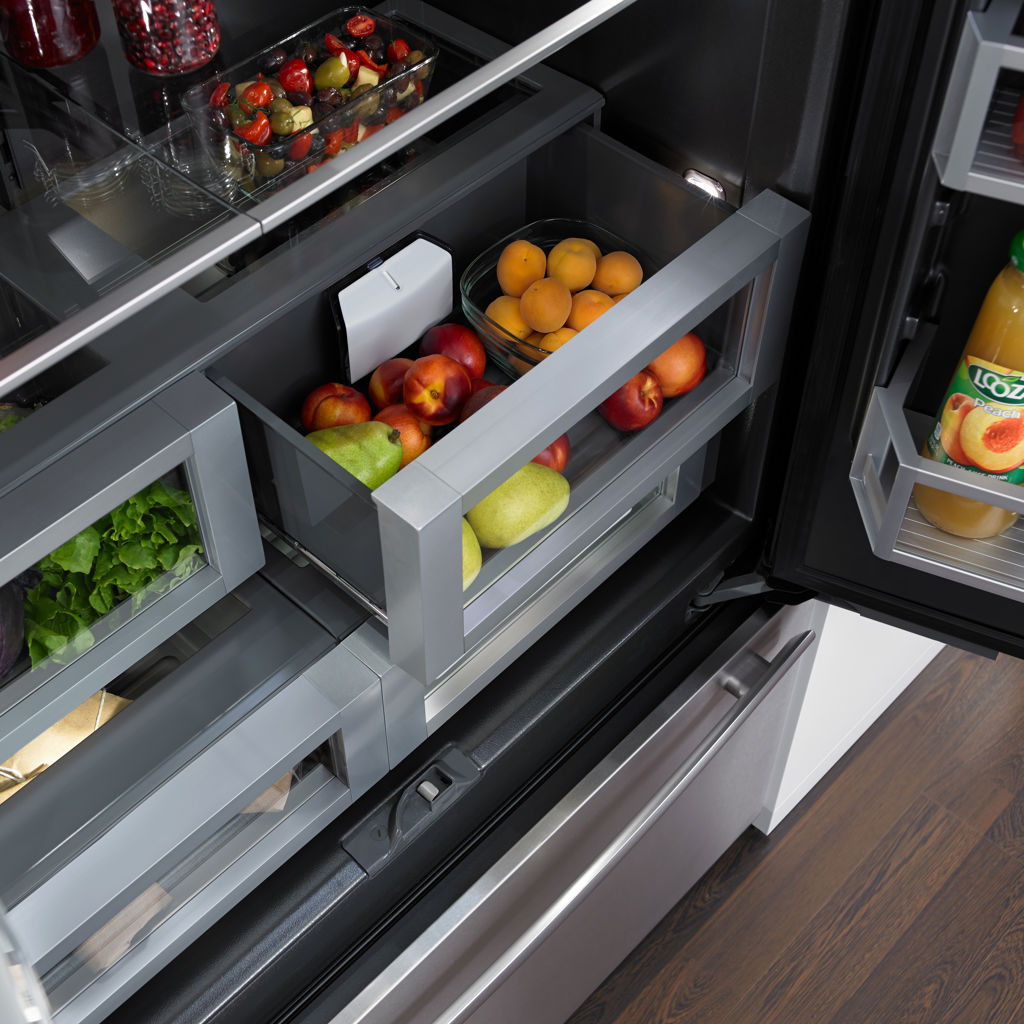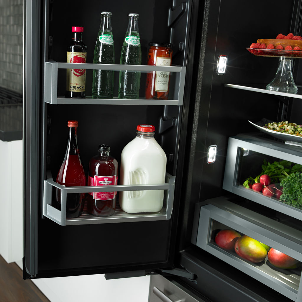 Multiple LED lights increases visibility and beautifully showcases food items against the Obsidian interior, on both Elegance Shelving and inside refrigerator and freezer drawers.