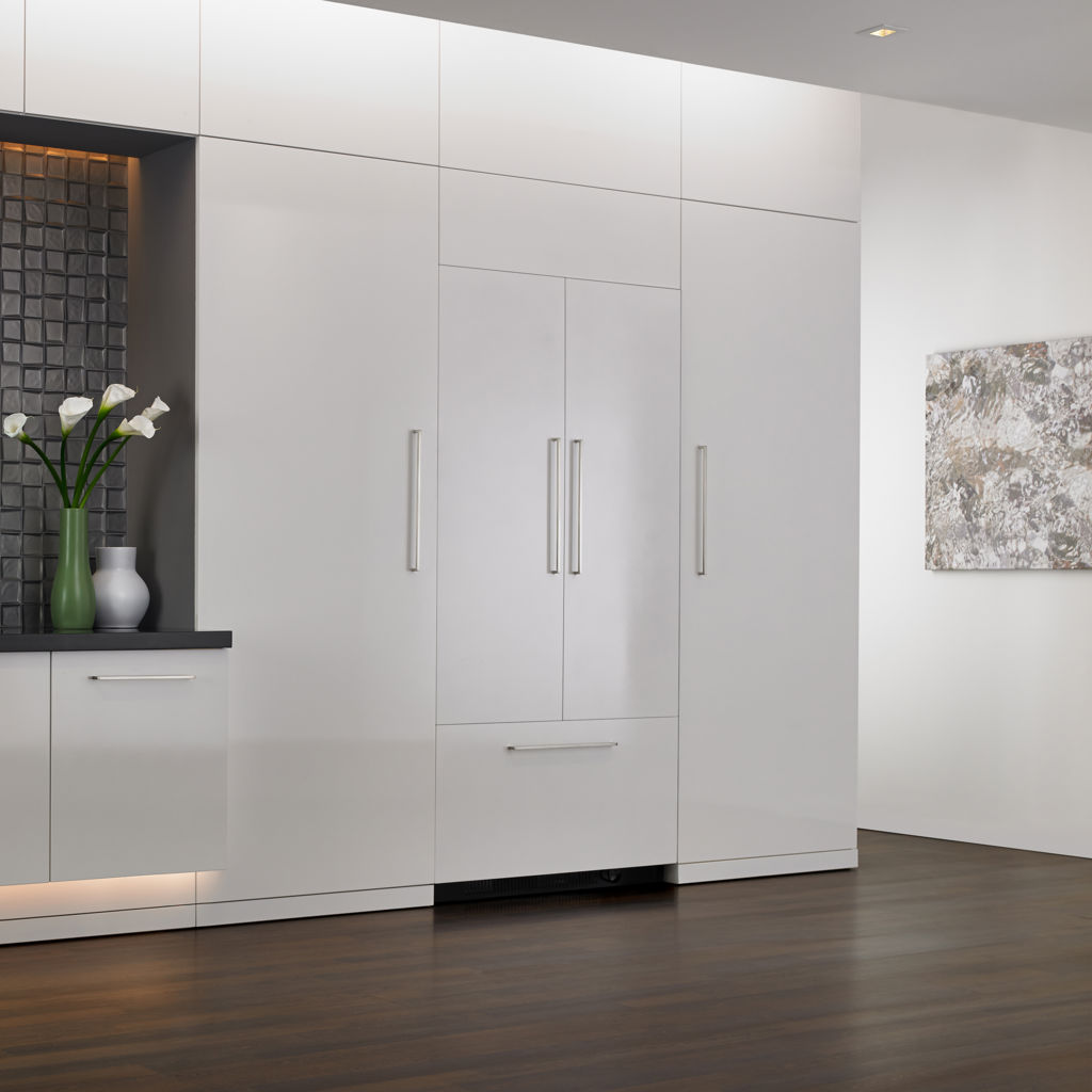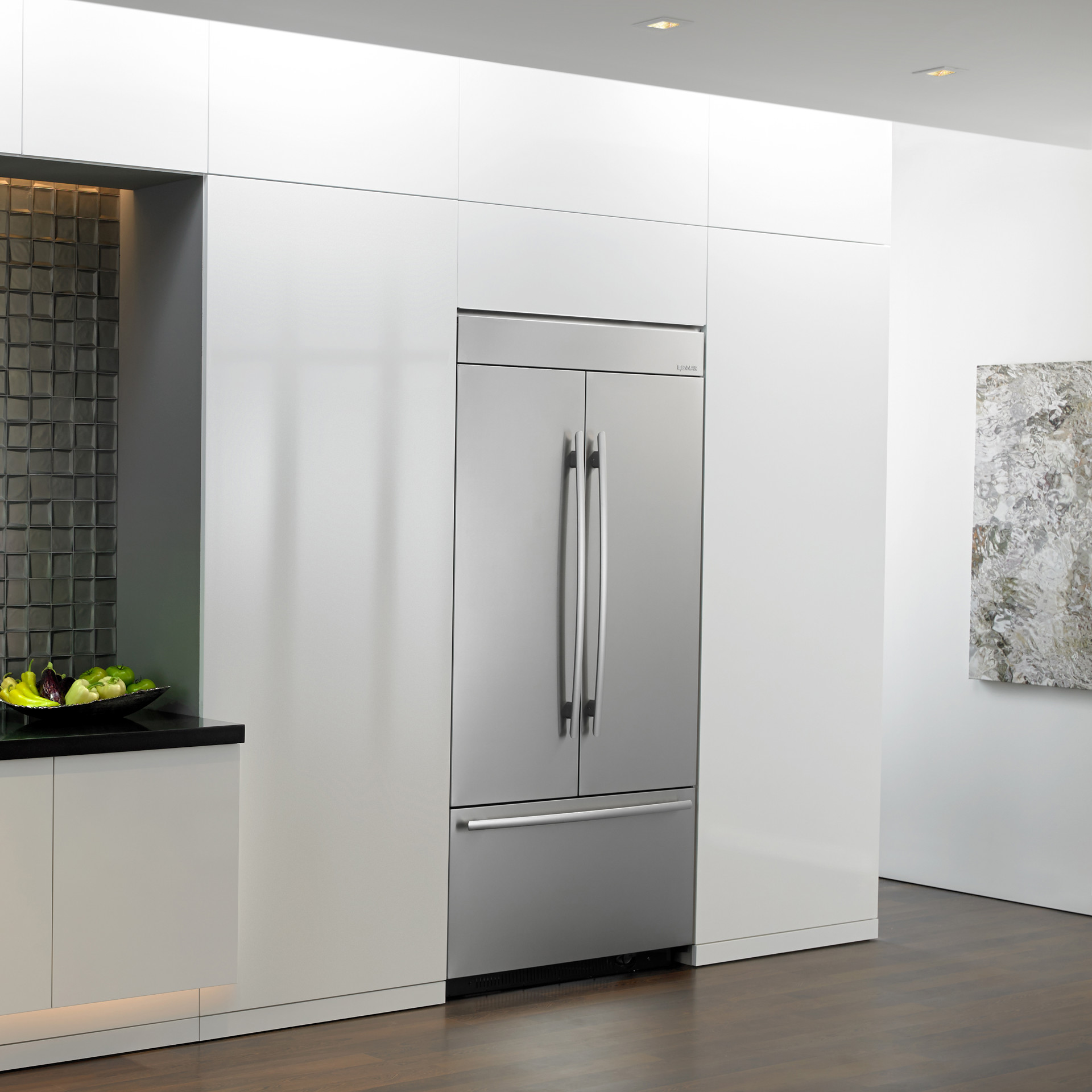 Glass shelves accented with brushed aluminum trim appear to float with an open, refined look, providing enhanced visibility while making foods and beverages easy to see and locate.