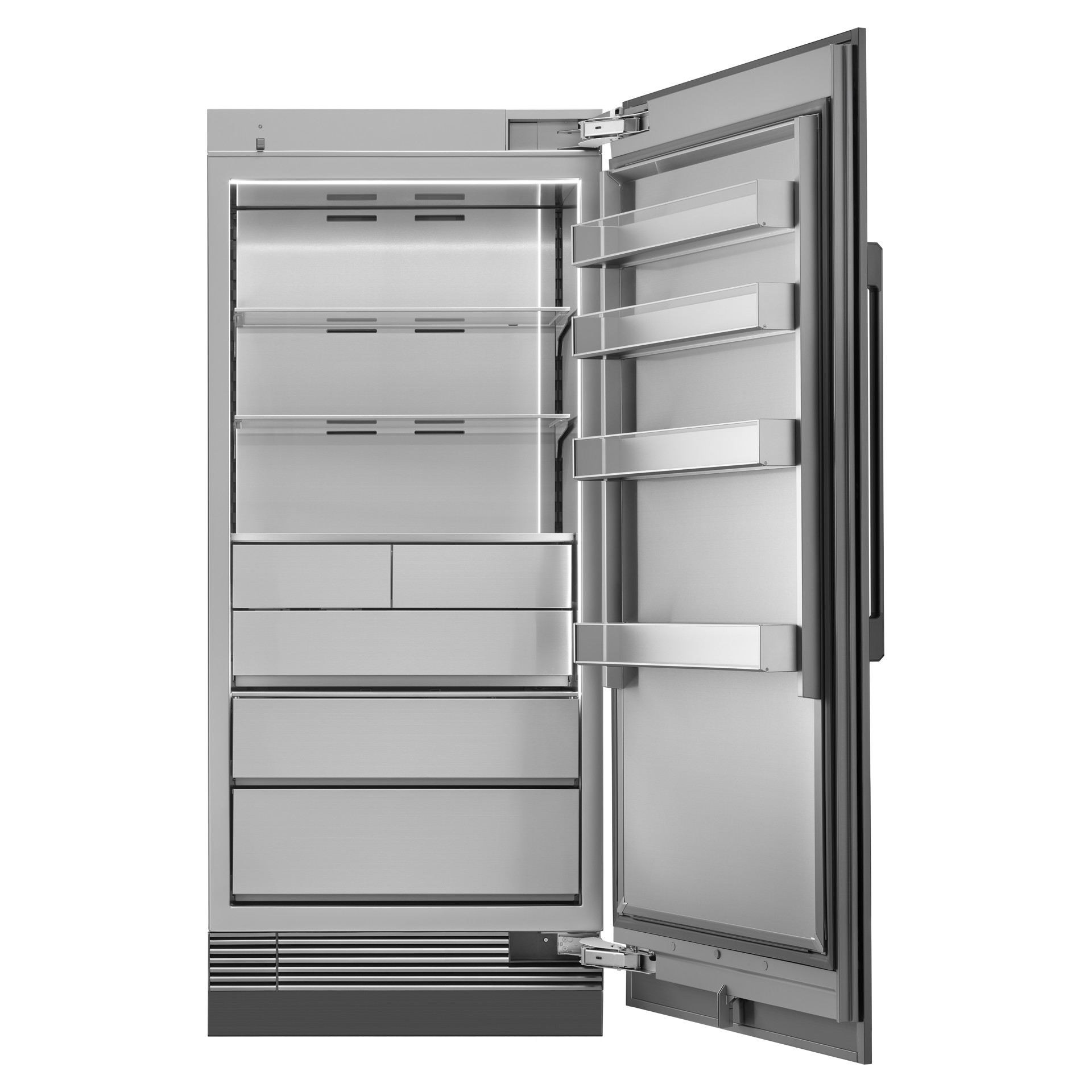 Seamlessly integrated LED lighting in a fully wrapped, all-stainless steel interior. Food is no longer just stored, it's presented.