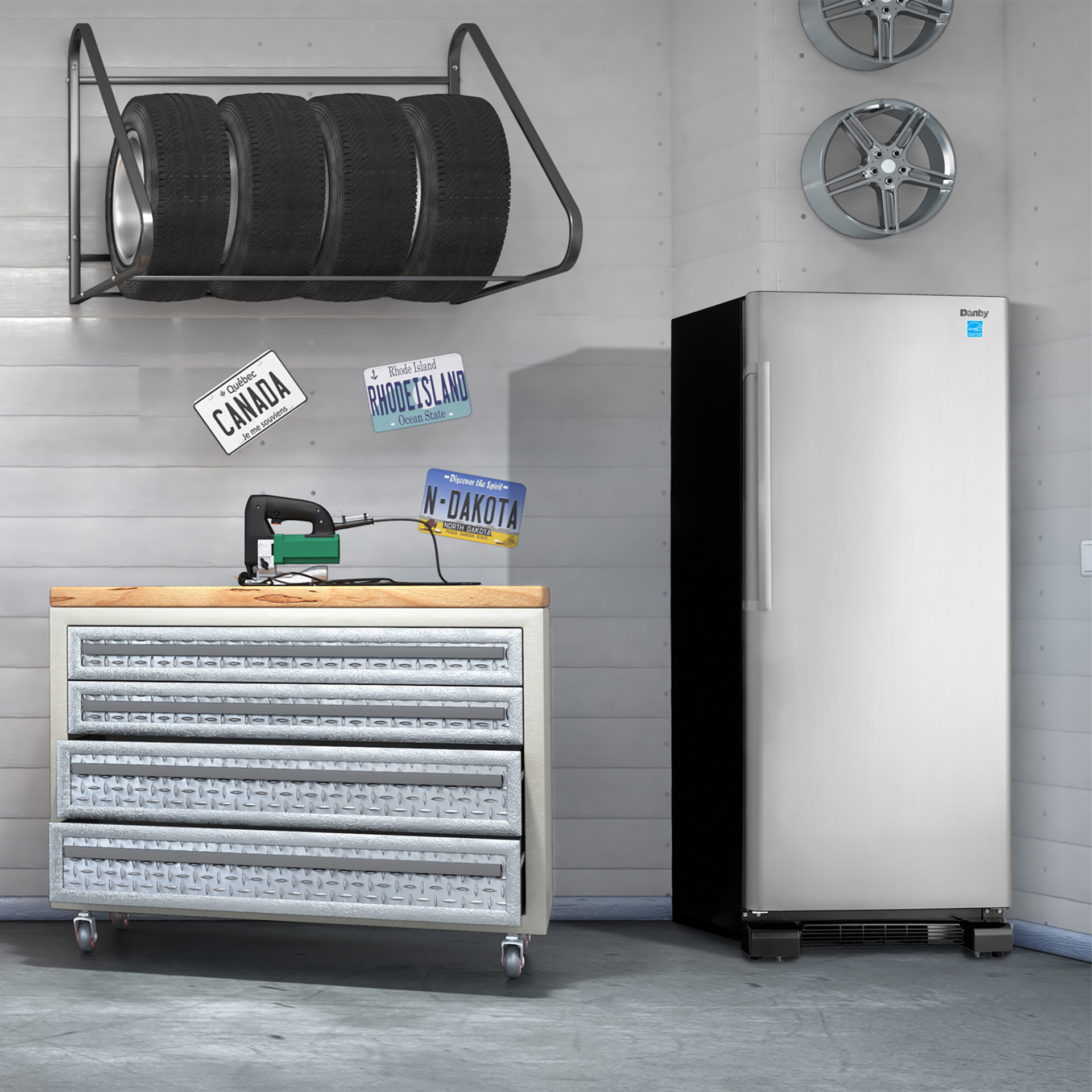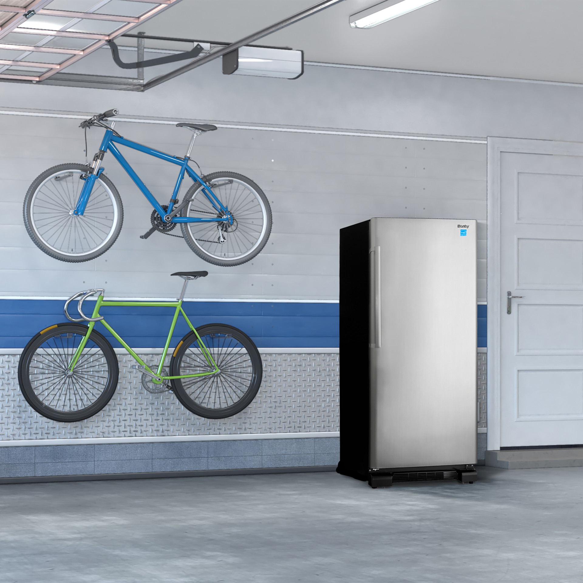 Stock up on your family’s frozen favorites with a Danby Designer upright freezer available in stainless steel look or white, ideal for a basement, kitchen, or garage.