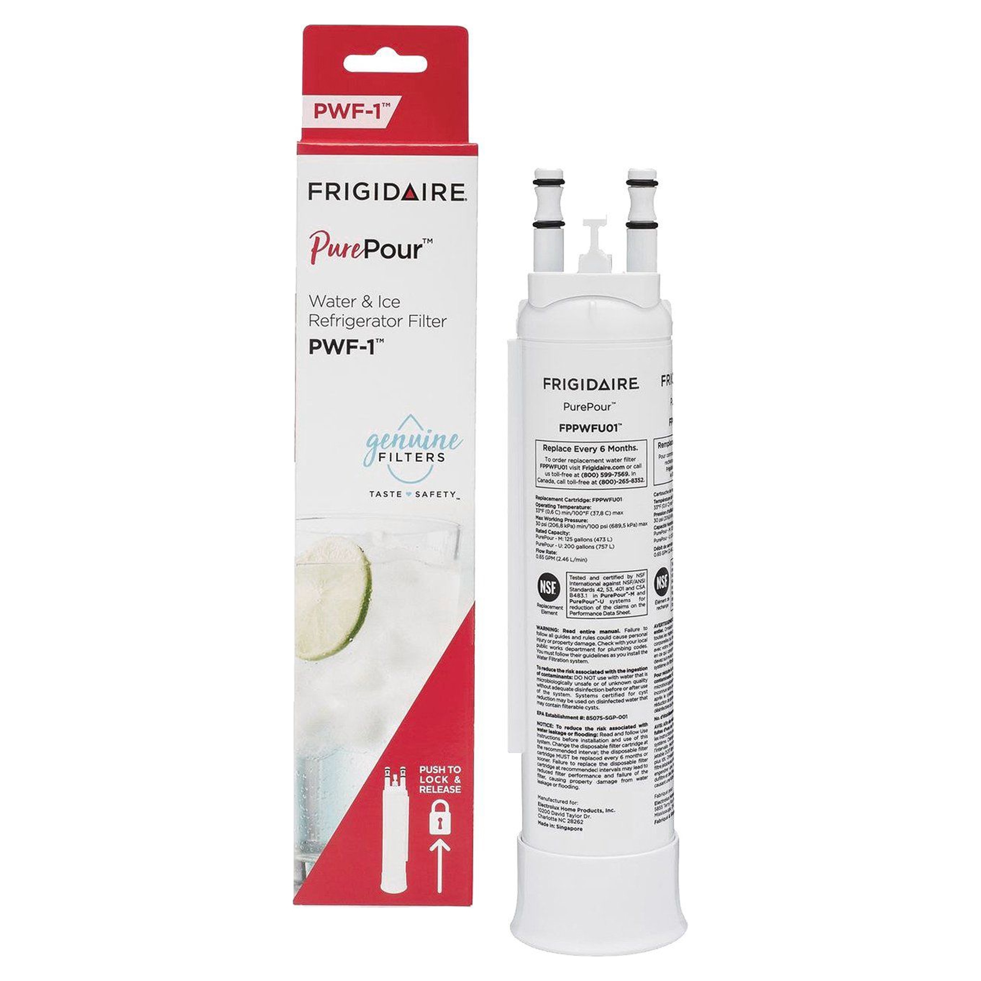 Keep safe, great tasting water flowing with PurePour™ Water filters (PWF-1™). Our filters reduce up to 99% of contaminants, cut back on plastic and save the cost of bottled water. NSF & WQA certified. Look for our berry-colored design with our new Genuine Filters seal on the package to know for certain your filter is authentic and sold by Frigidaire.