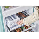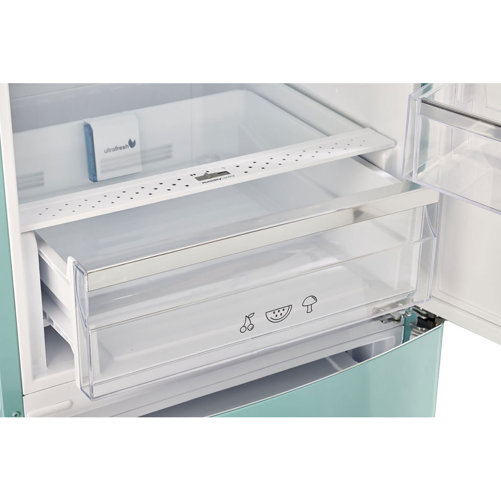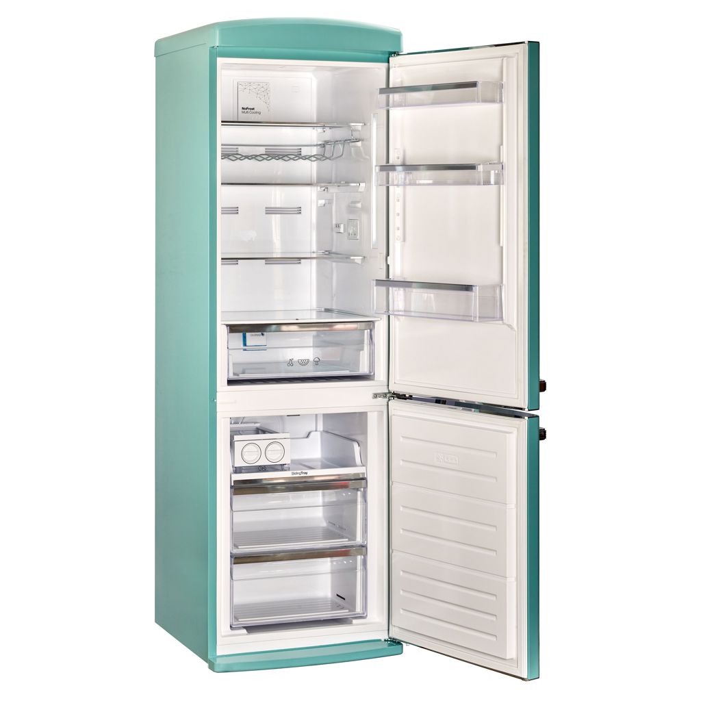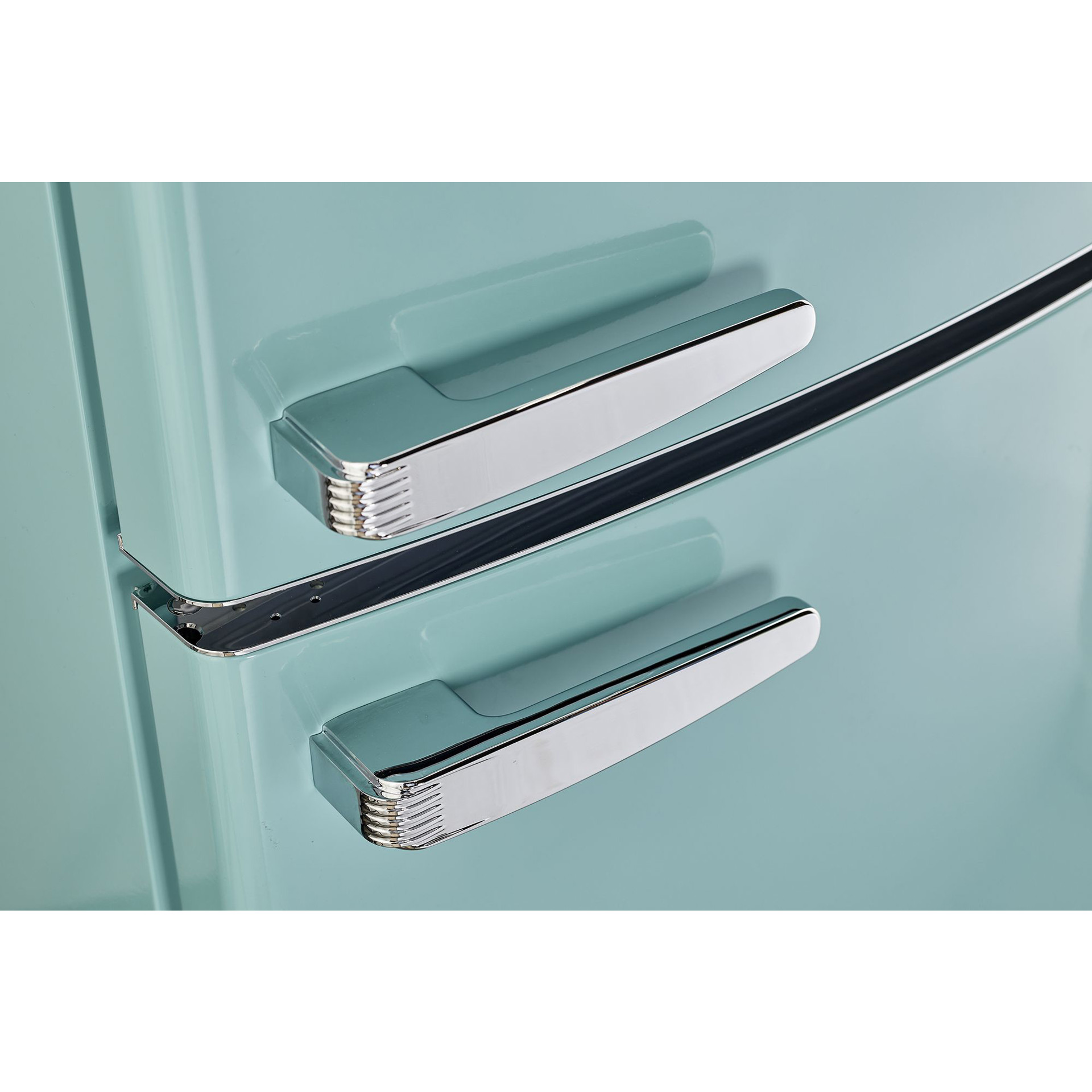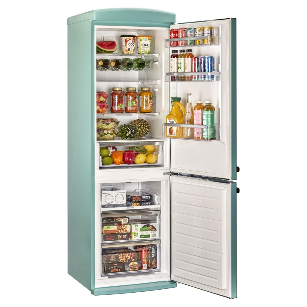The bottom freezer refrigerator takes you back to the iconic retro design with chrome accents.