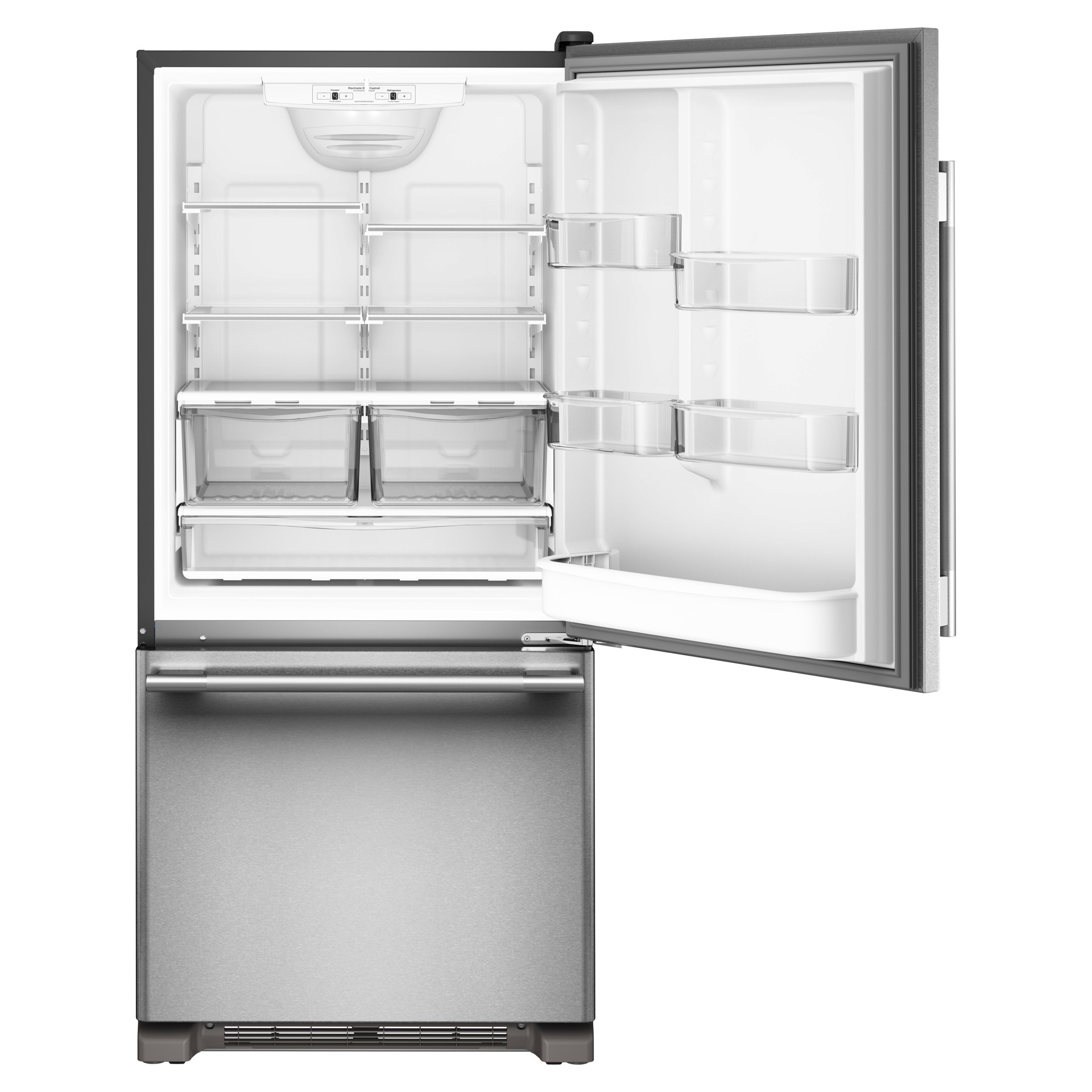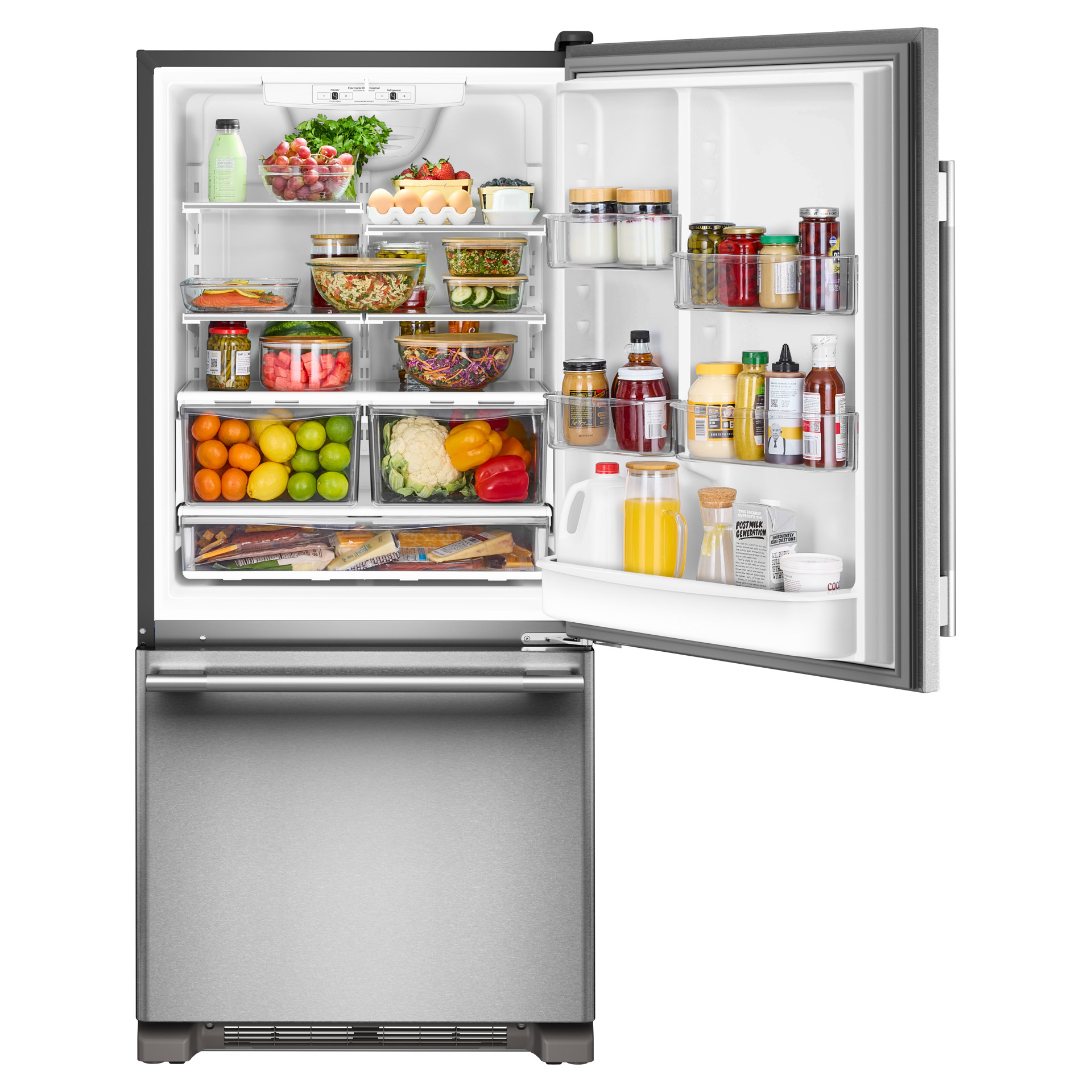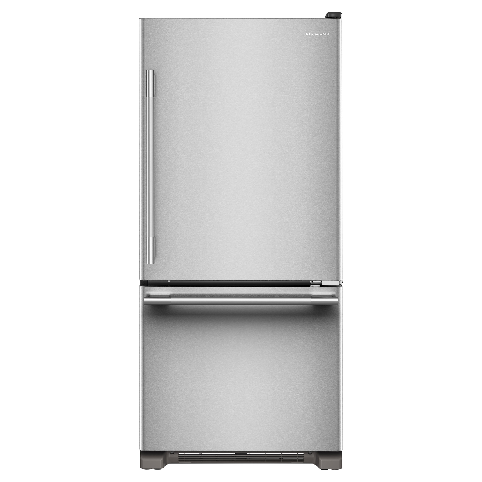 Freshness within easy reach. This KitchenAid® standard-depth bottom-freezer refrigerator features the Preserva® Food Care System to help keep your ingredients fresh and flavorful. Plus, the full-width pantry drawer lets you store large items with ease so you can free up space. All of this comes in a refrigerator equipped with ultra-bright LED lighting and adjustable, framed spill-proof shelves with metallic accents.