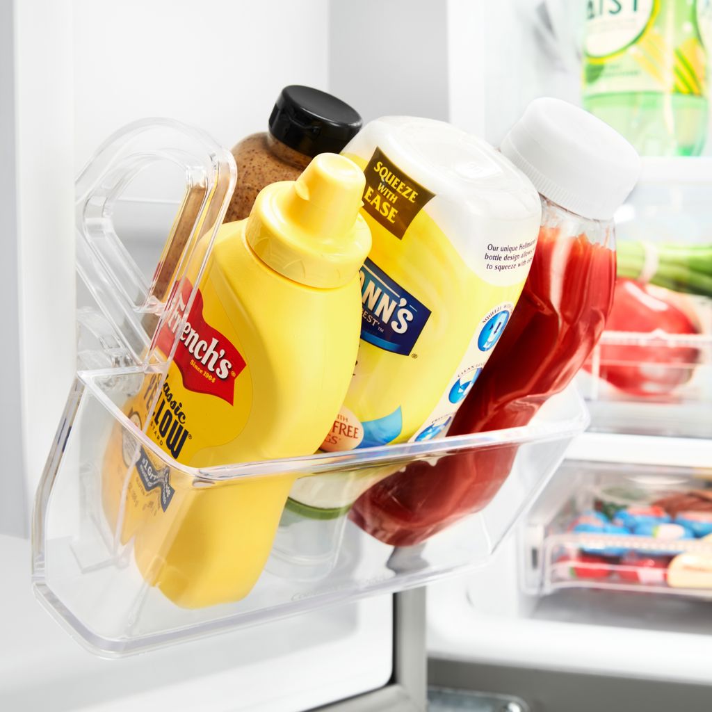 Easily move condiments or other items from the refrigerator to the table or grill in this removable door bin with a convenient carrying handle.