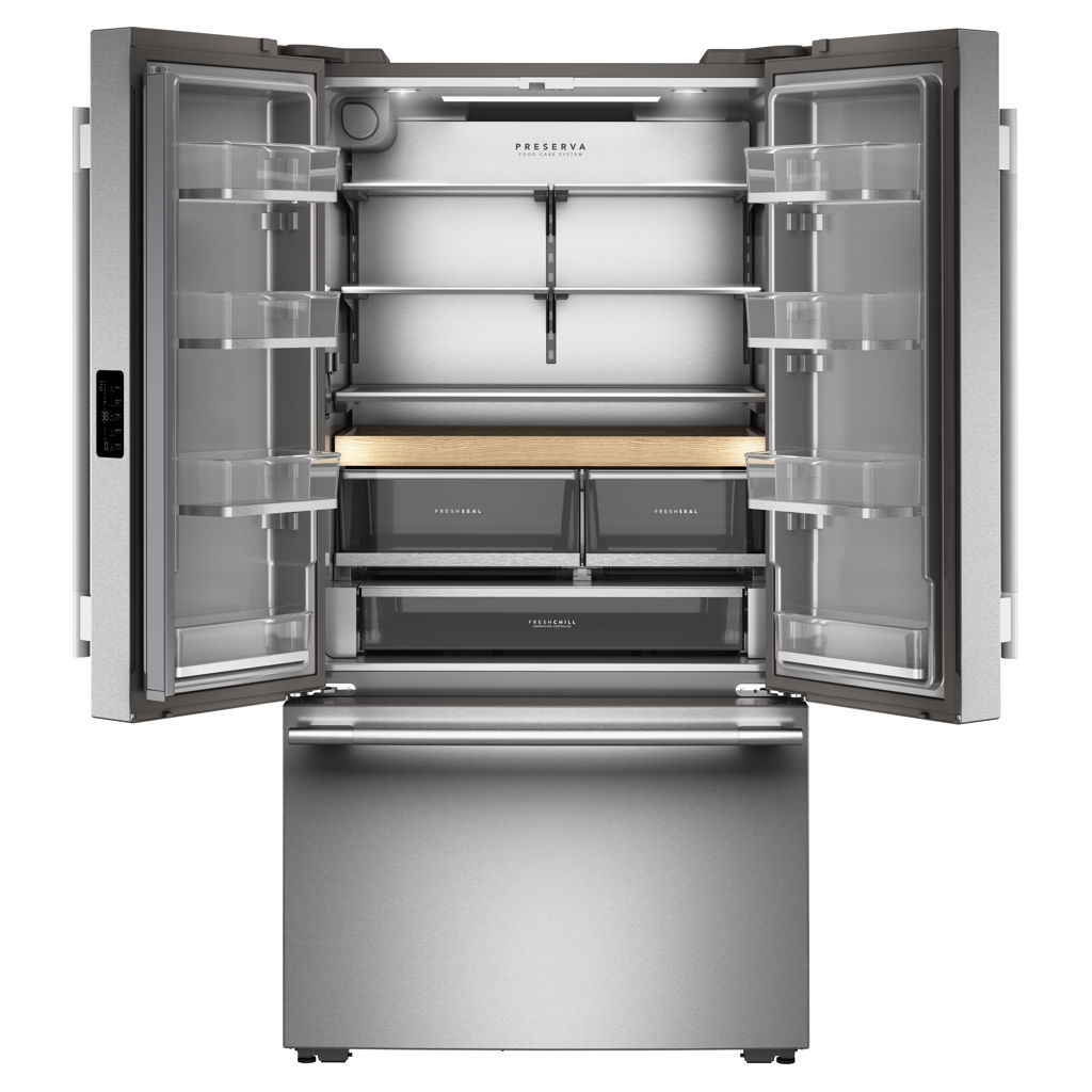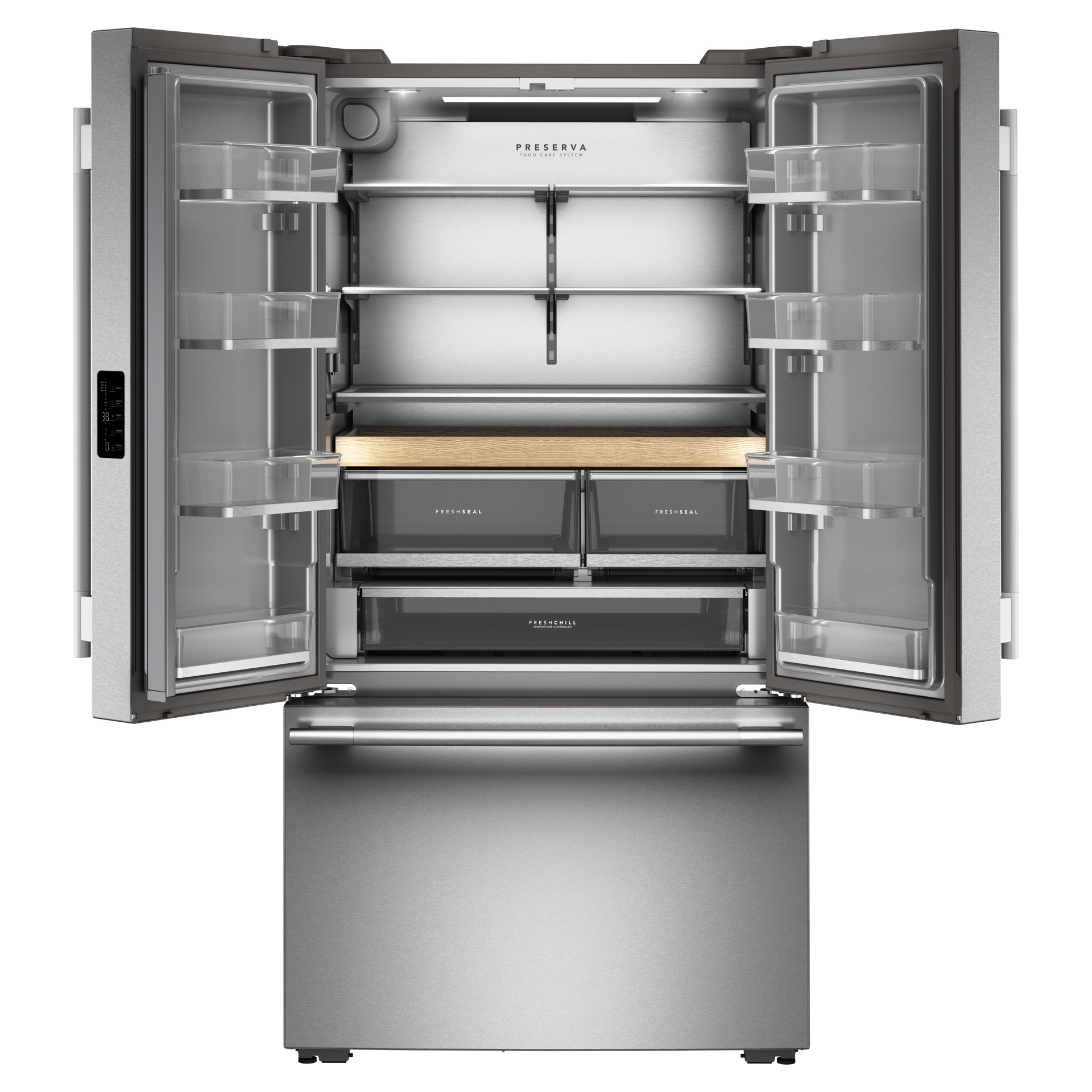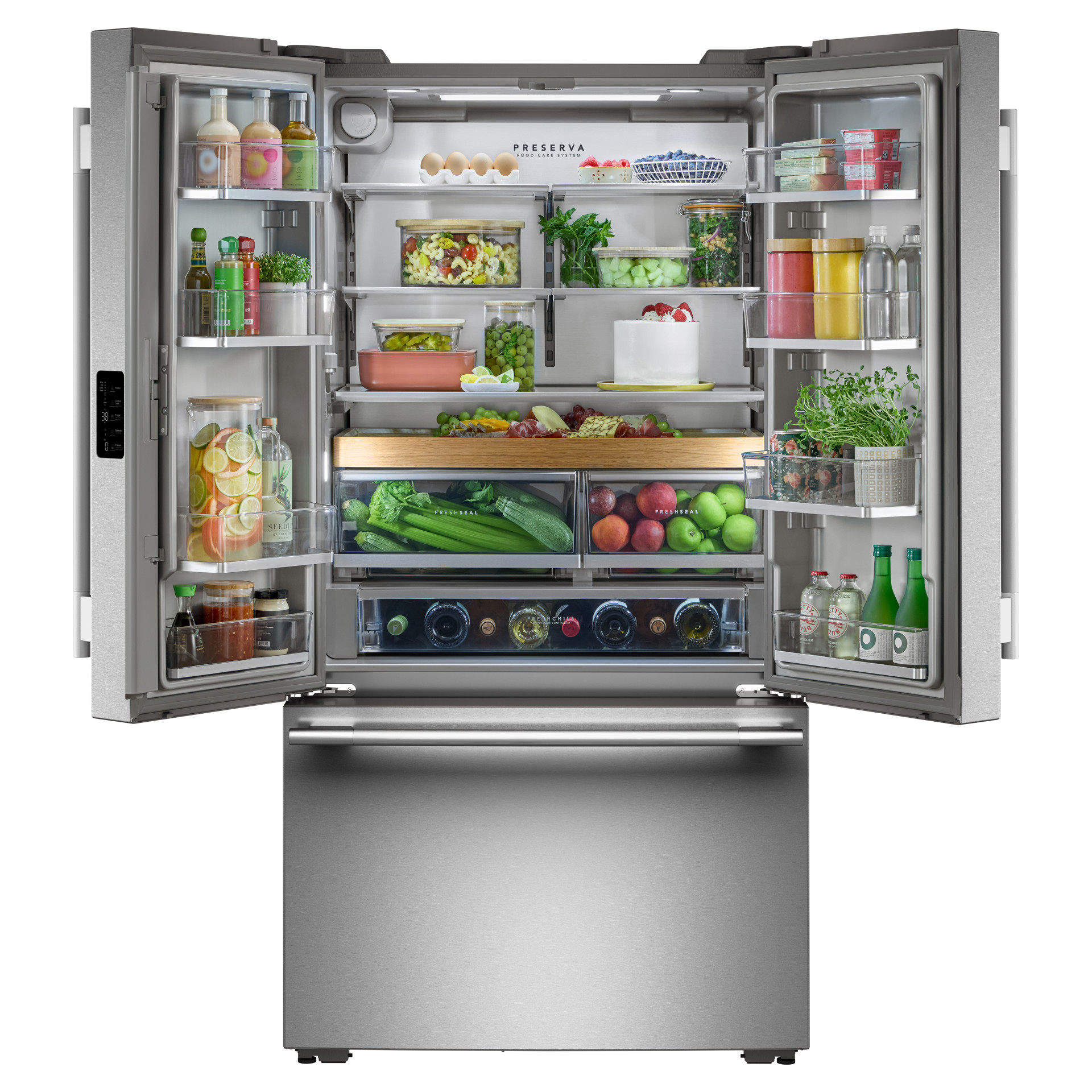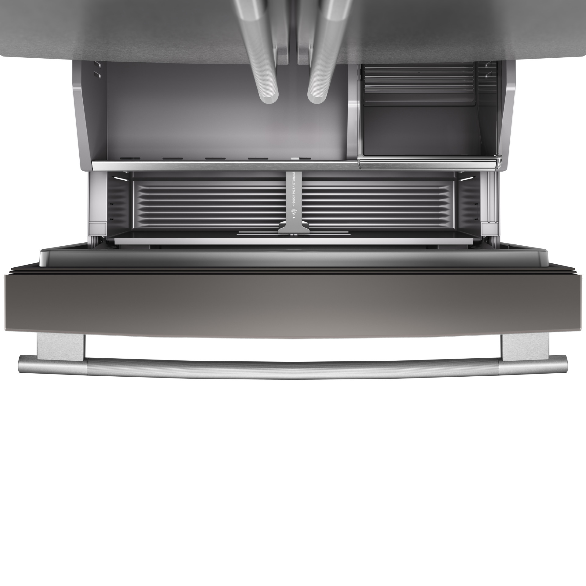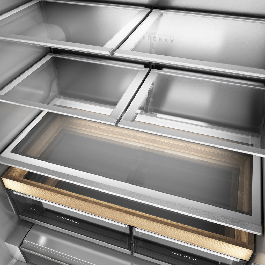 Impresses from the inside out with premium craftsmanship and high-end design. Wood-look trims, metallic accents, smoked produce bins, and ultra-bright LED lighting stand out beautifully against the stunning silver finish.