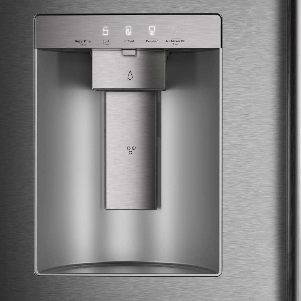 Fits glasses and measuring cups and delivers filtered water and ice without opening the refrigerator door.