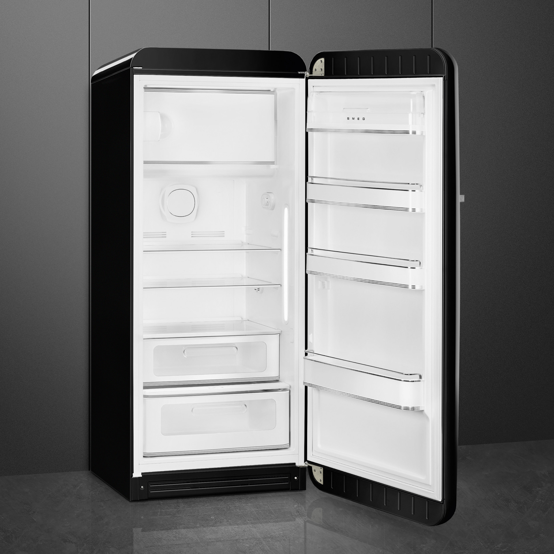 This retro 1950s style 24" refrigerator offers 9 cu. ft. of fresh food capacity and 0.92 cu. ft. of freezer space.