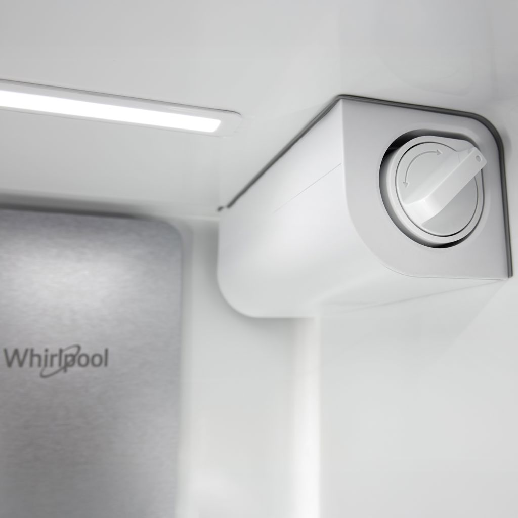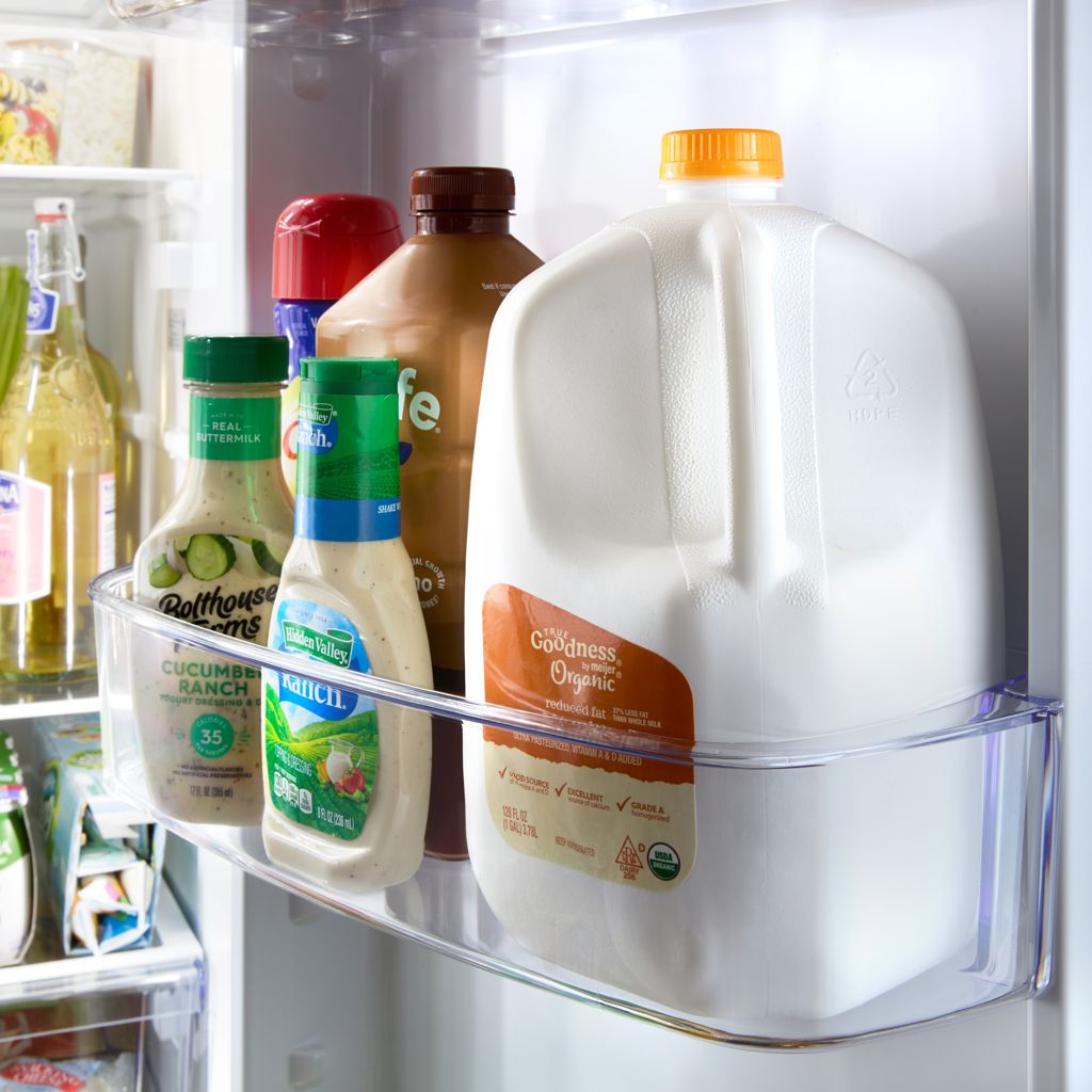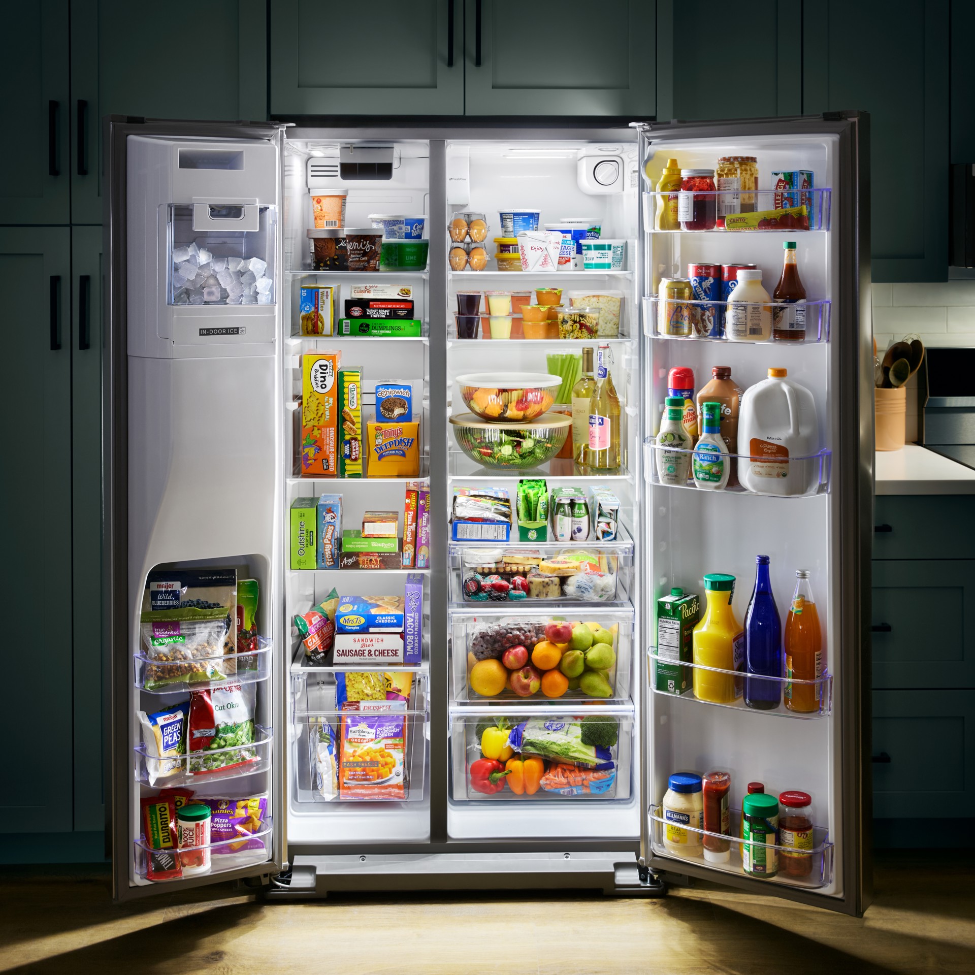 The In-Door-Ice® system frees up an entire shelf in the freezer by placing the ice bin in the door for more usable storage space.