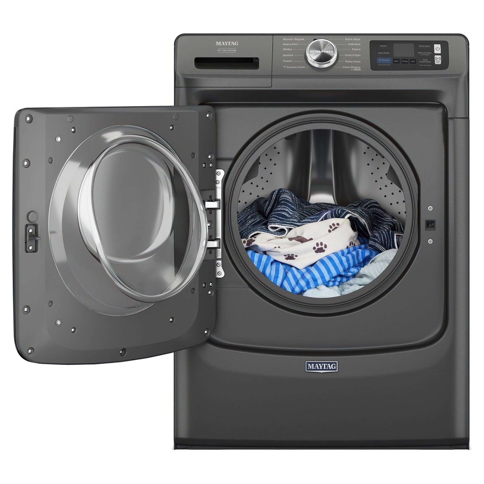 Get a visible clean with the Maytag® Pet Pro washer designed to remove pet hair. Press the Pet Pro option to unleash extra water and a deep rinse to lift and remove pet hair with the built-in Pet Pro filter.* Extra power enhances stain control on any surface.