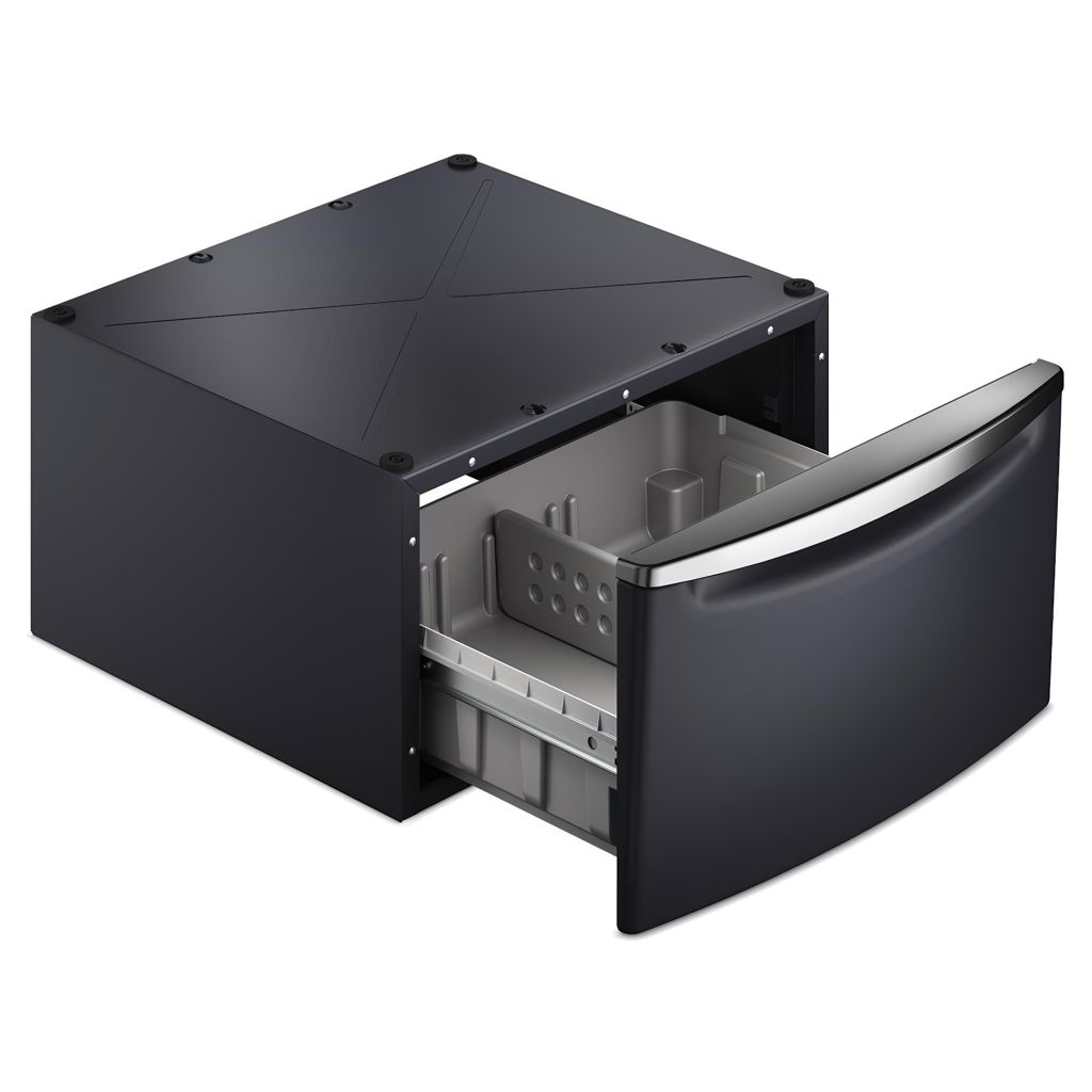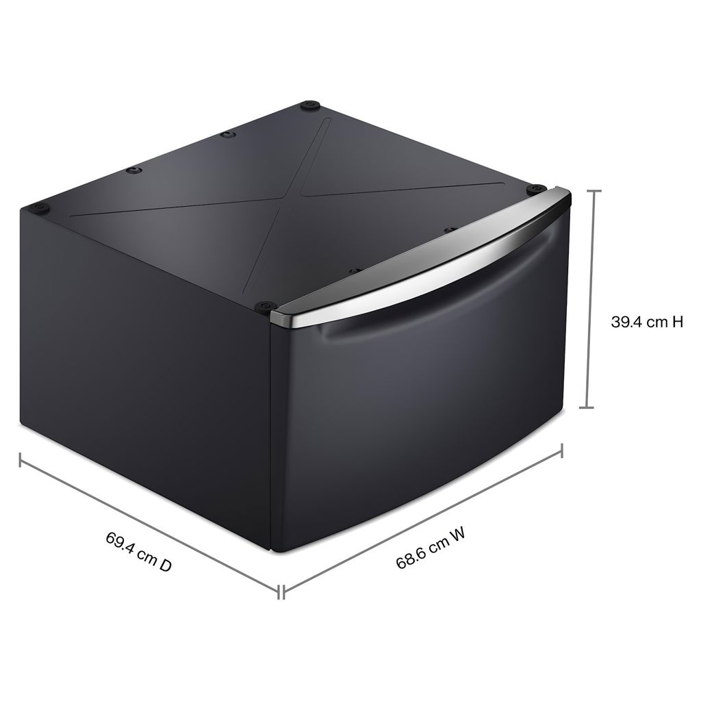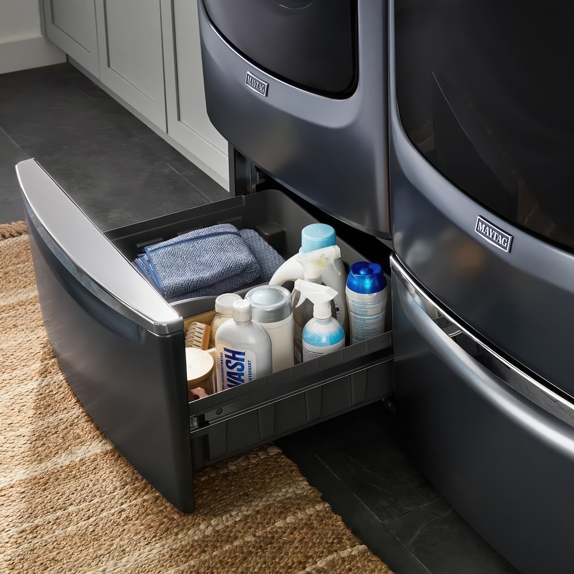 Give the cleaning power of Maytag more prominence, while adding a drawer to hide away laundry supplies. Accessory pedestals add 15.5" of height for bonus storage and to help prevent bending and stooping.