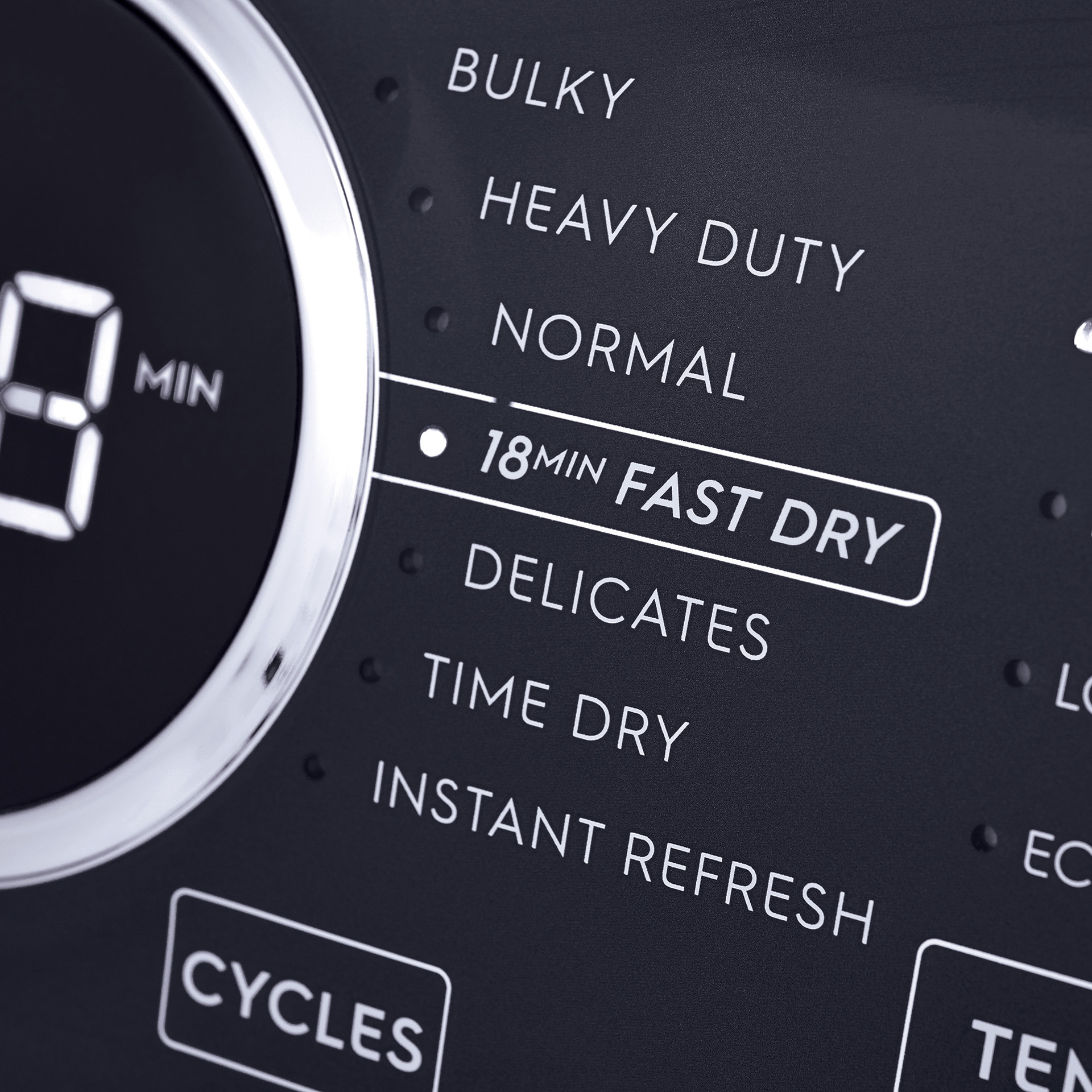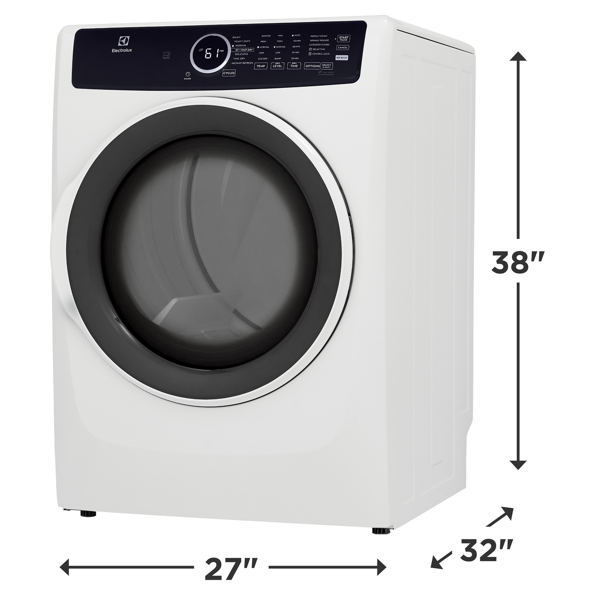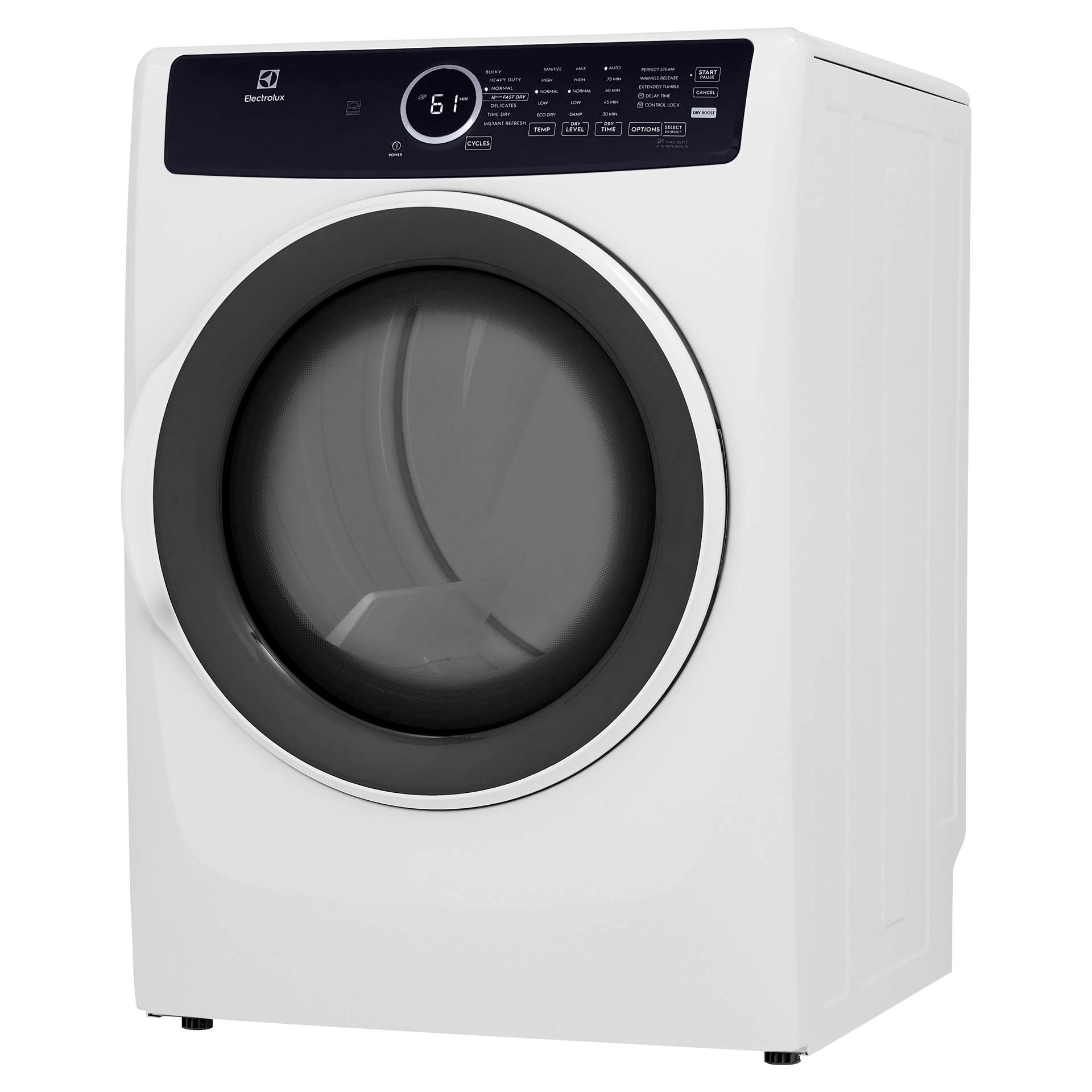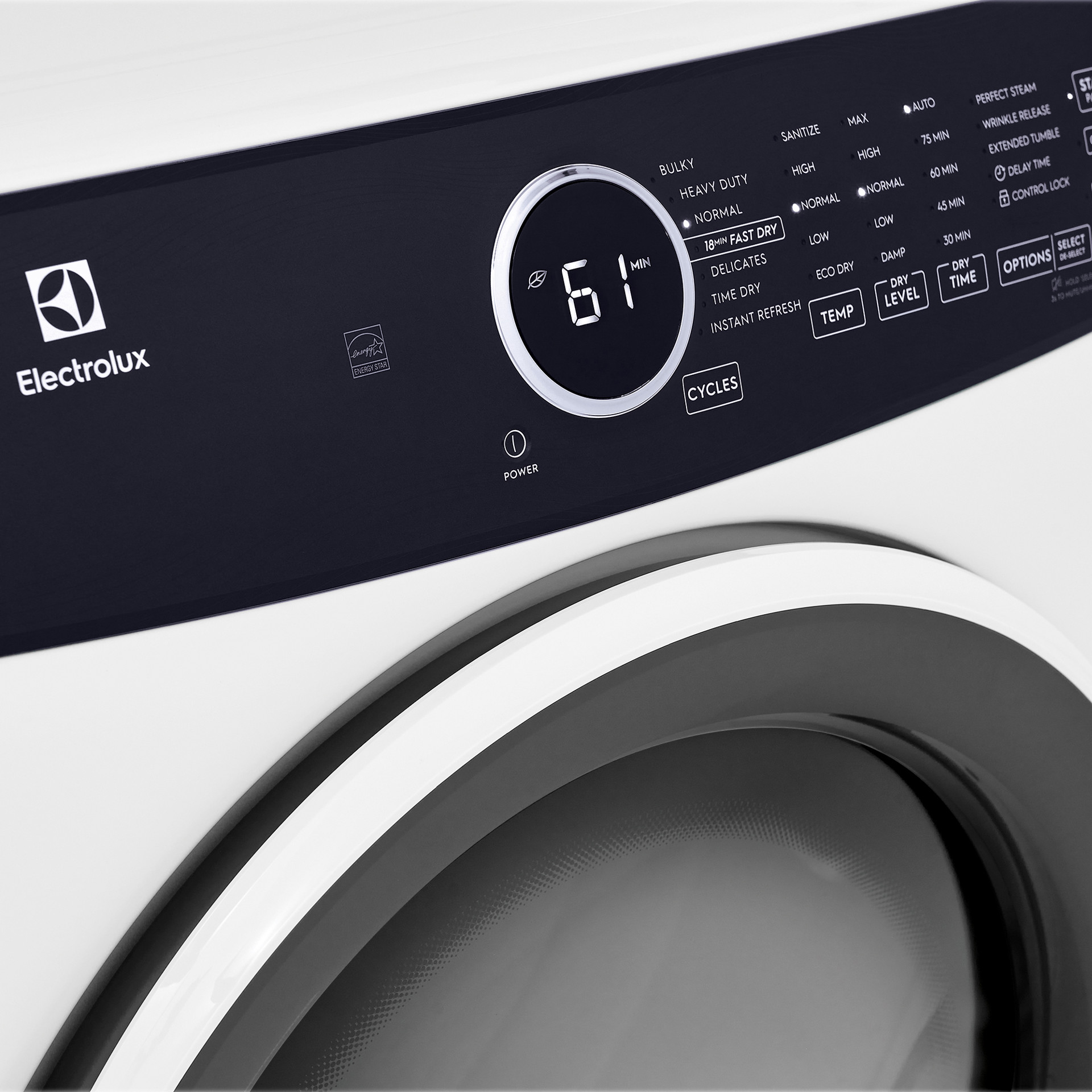 The Electrolux front-loading electric dryer features the Instant Refresh cycle that lets you remove wrinkles and refresh your clothes in just 10 minutes. The 18-minute Quick Dry cycle lets you quickly dry the items you need most.