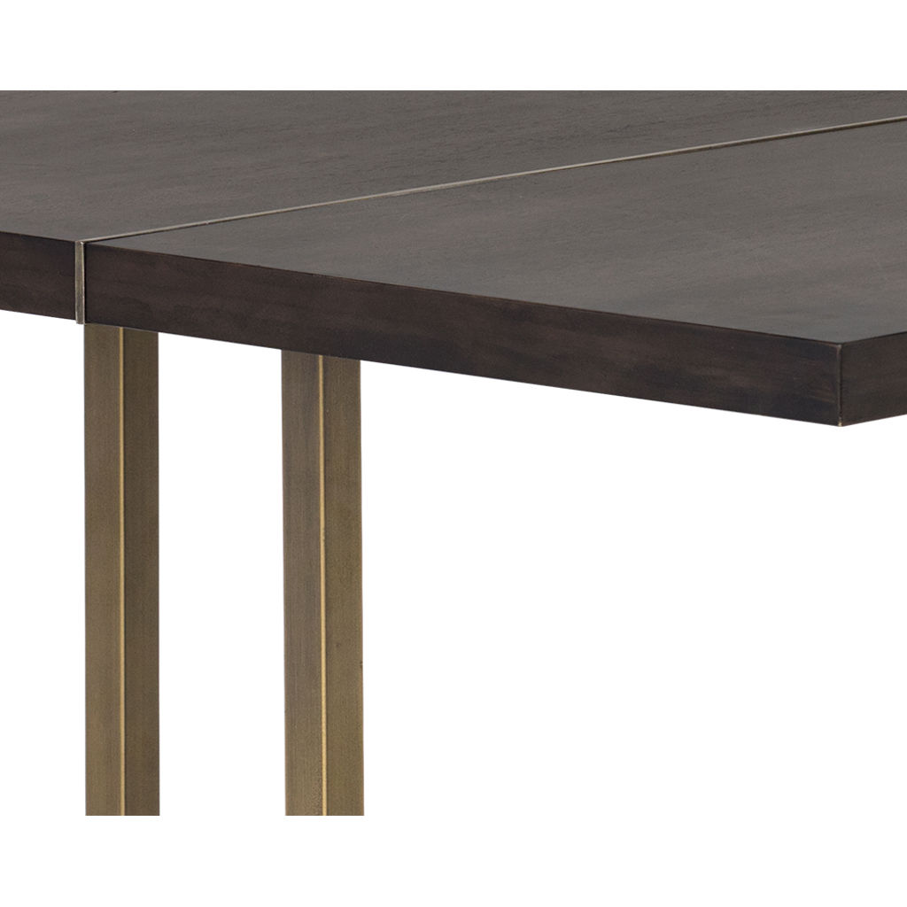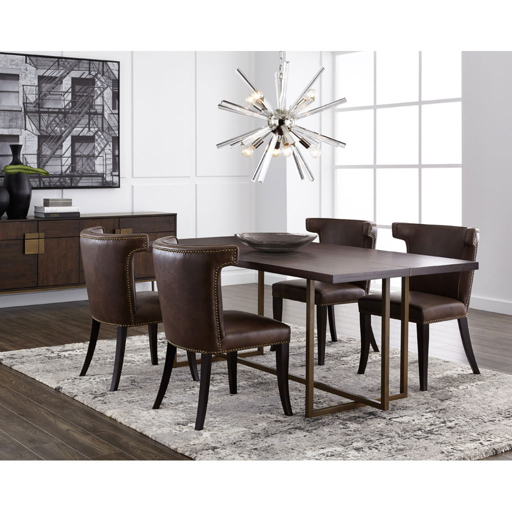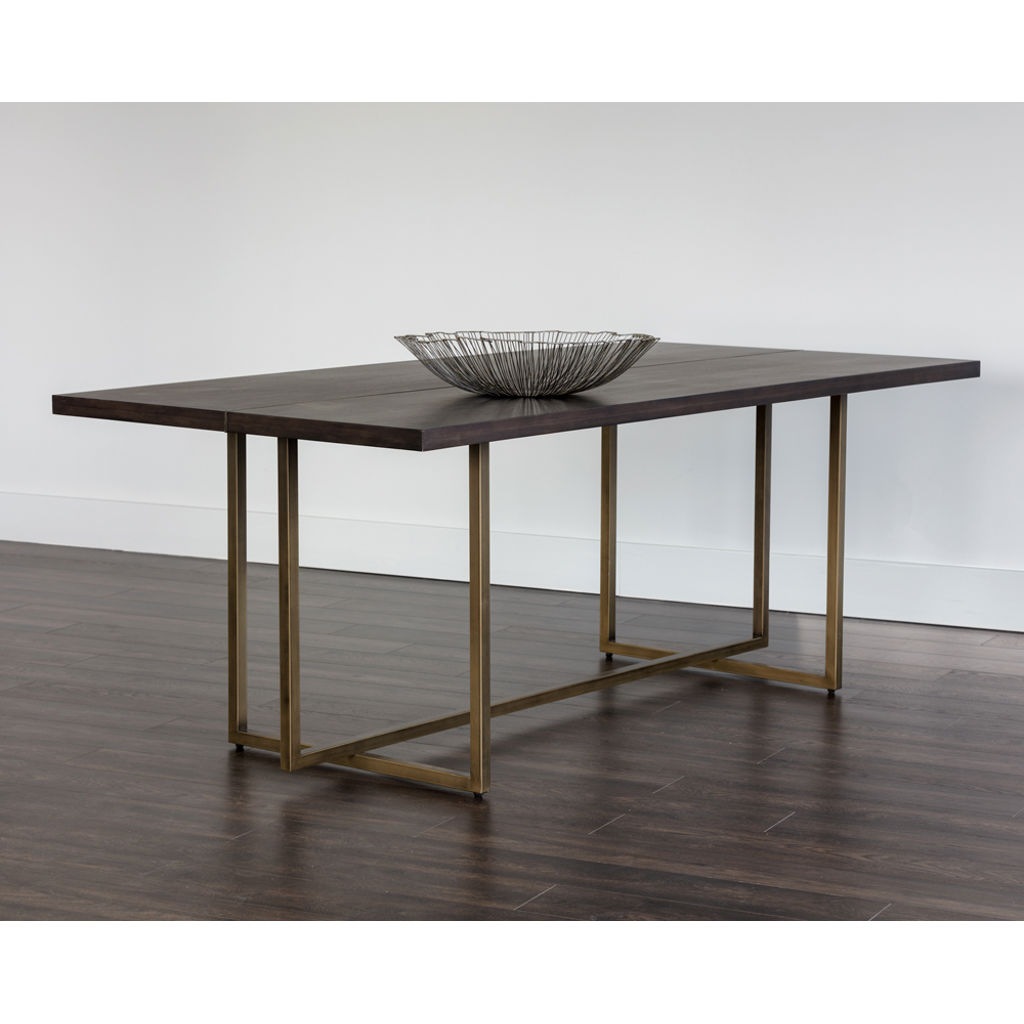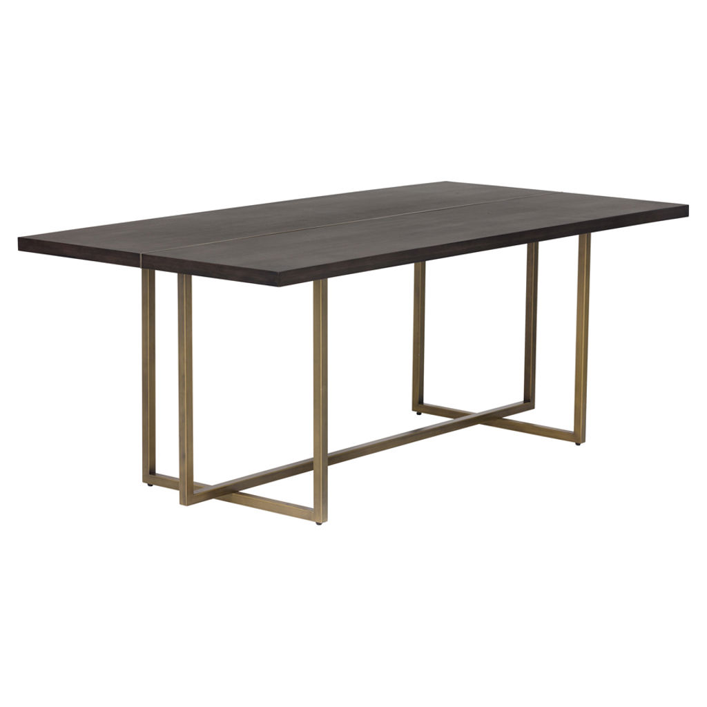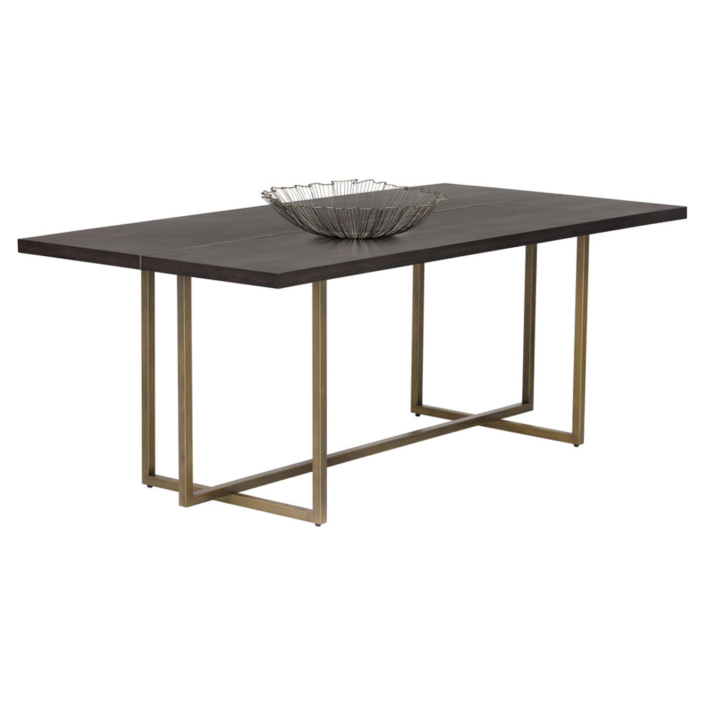 The uniquely crafted dining table from our MIXT collection will add a transitional look to any dining space. It features a beautiful acacia wood veneer top with antique brass detailing and a matching base. Suitable for residential and commercial settings.