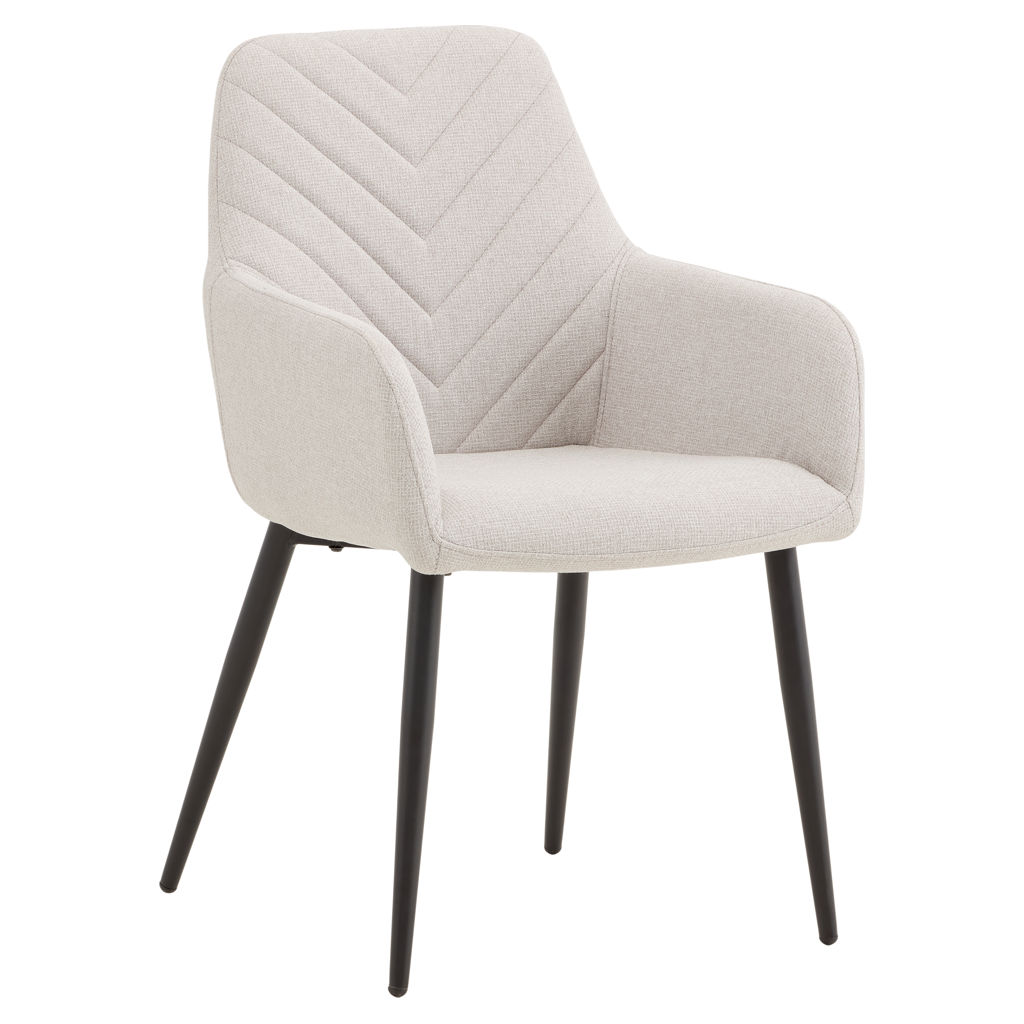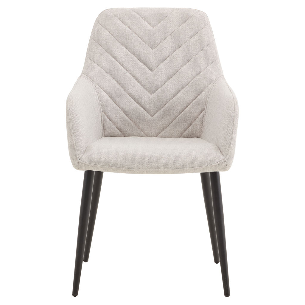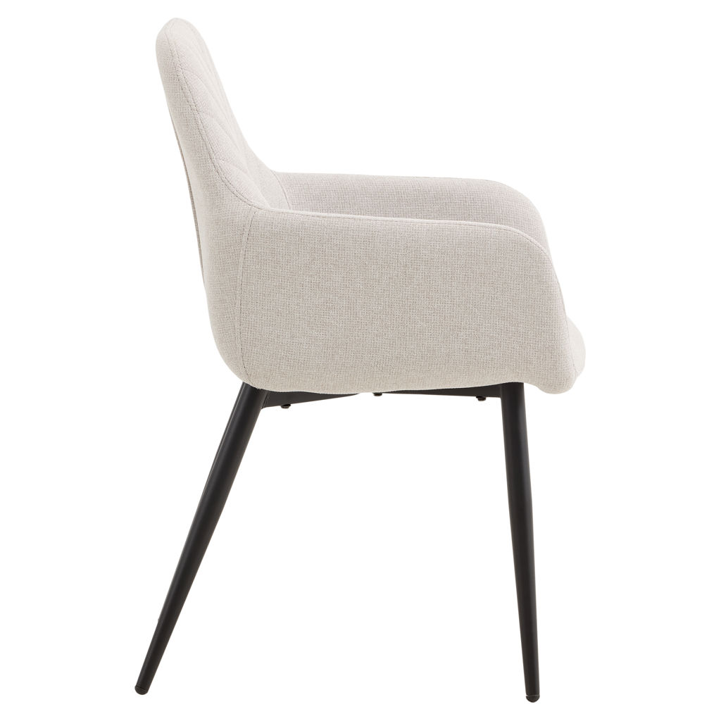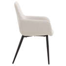 Generously padded armrests invite long conversations around the table, and the plush seat ensures optimal comfort even during extended meals. The black metal legs, both sturdy and elegant, provide perfect stability while adding a contemporary touch.