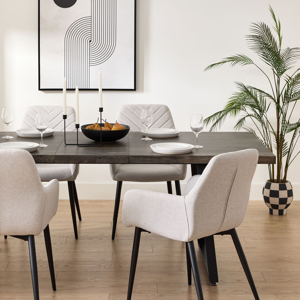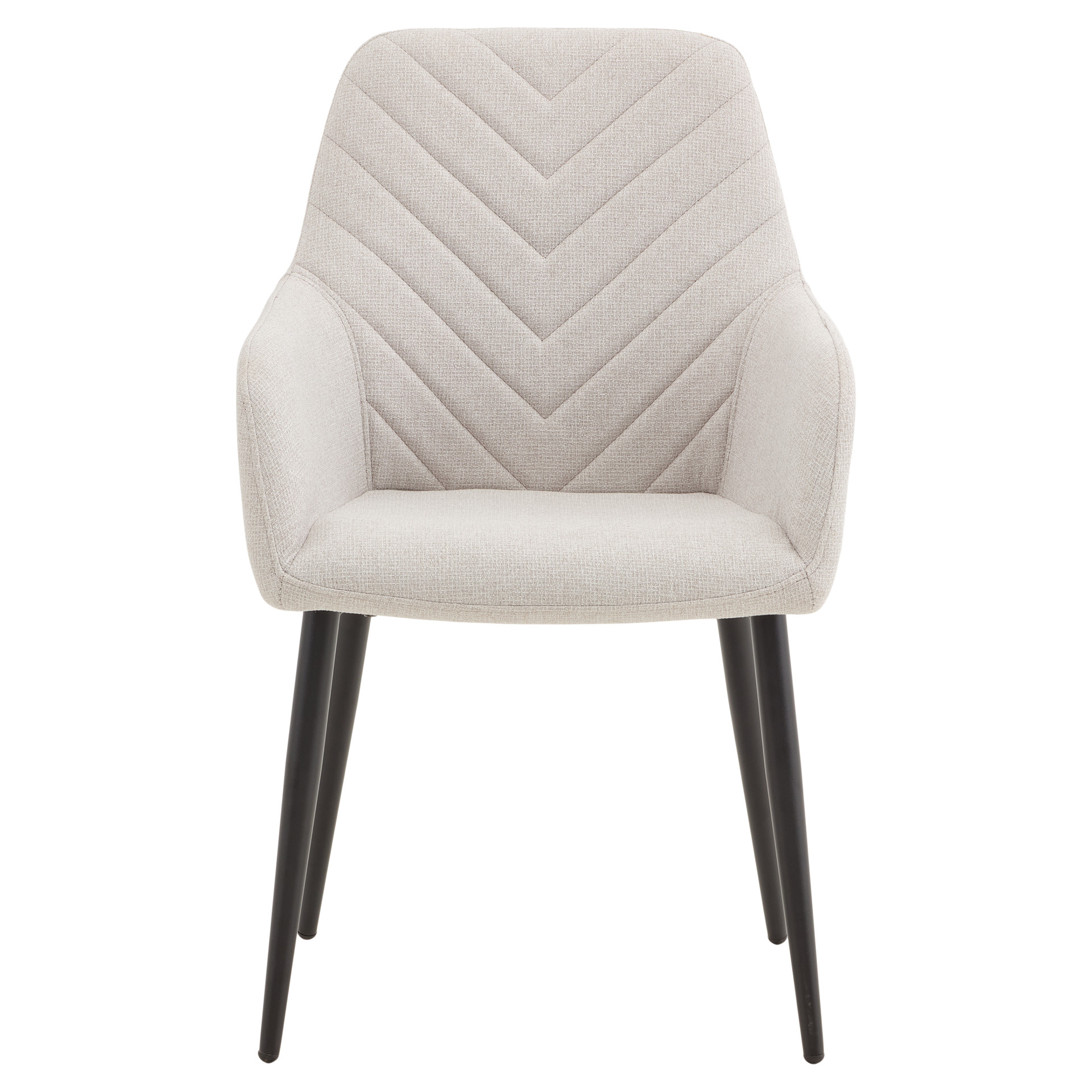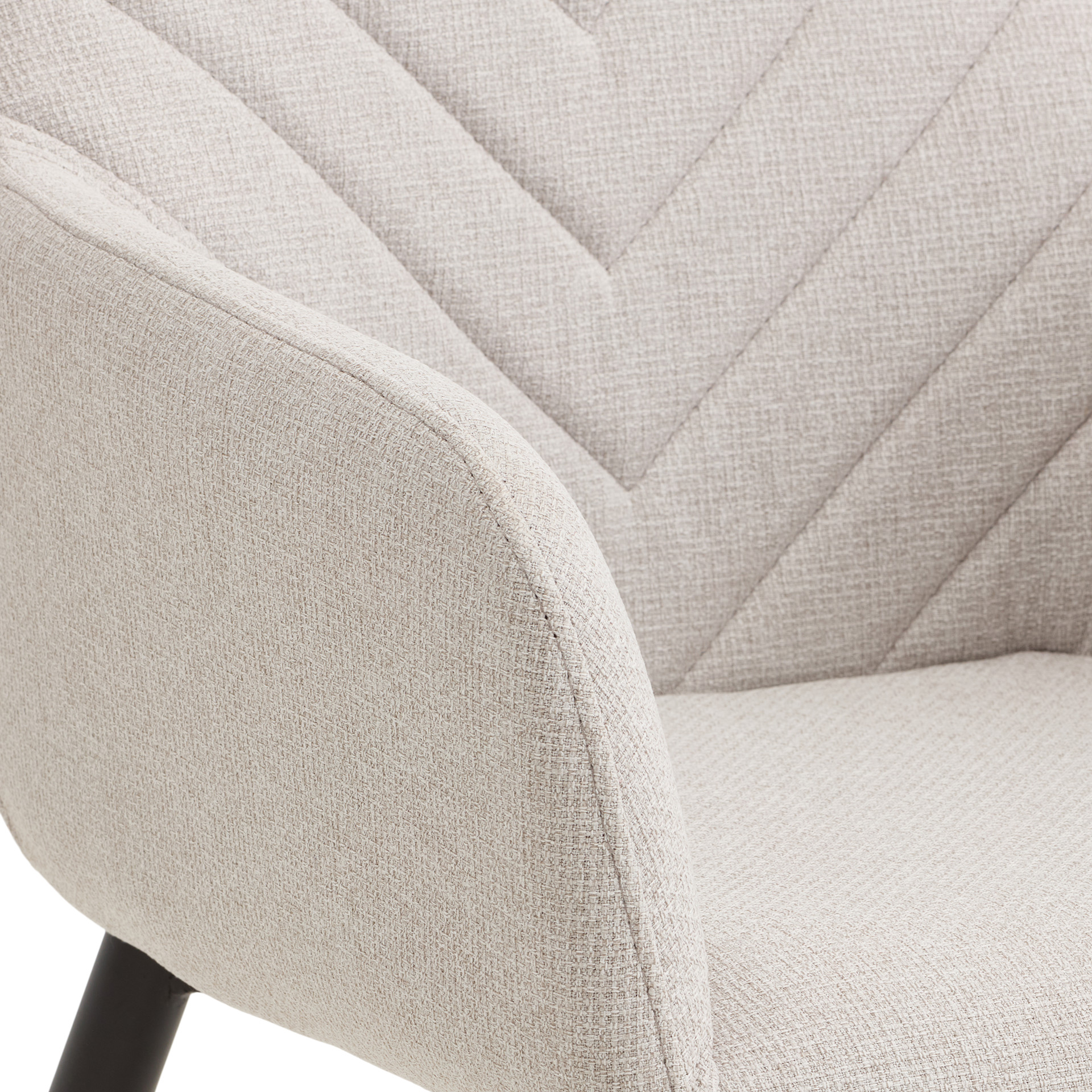 Generously padded armrests invite long conversations around the table, and the plush seat ensures optimal comfort even during extended meals. The black metal legs, both sturdy and elegant, provide perfect stability while adding a contemporary touch.