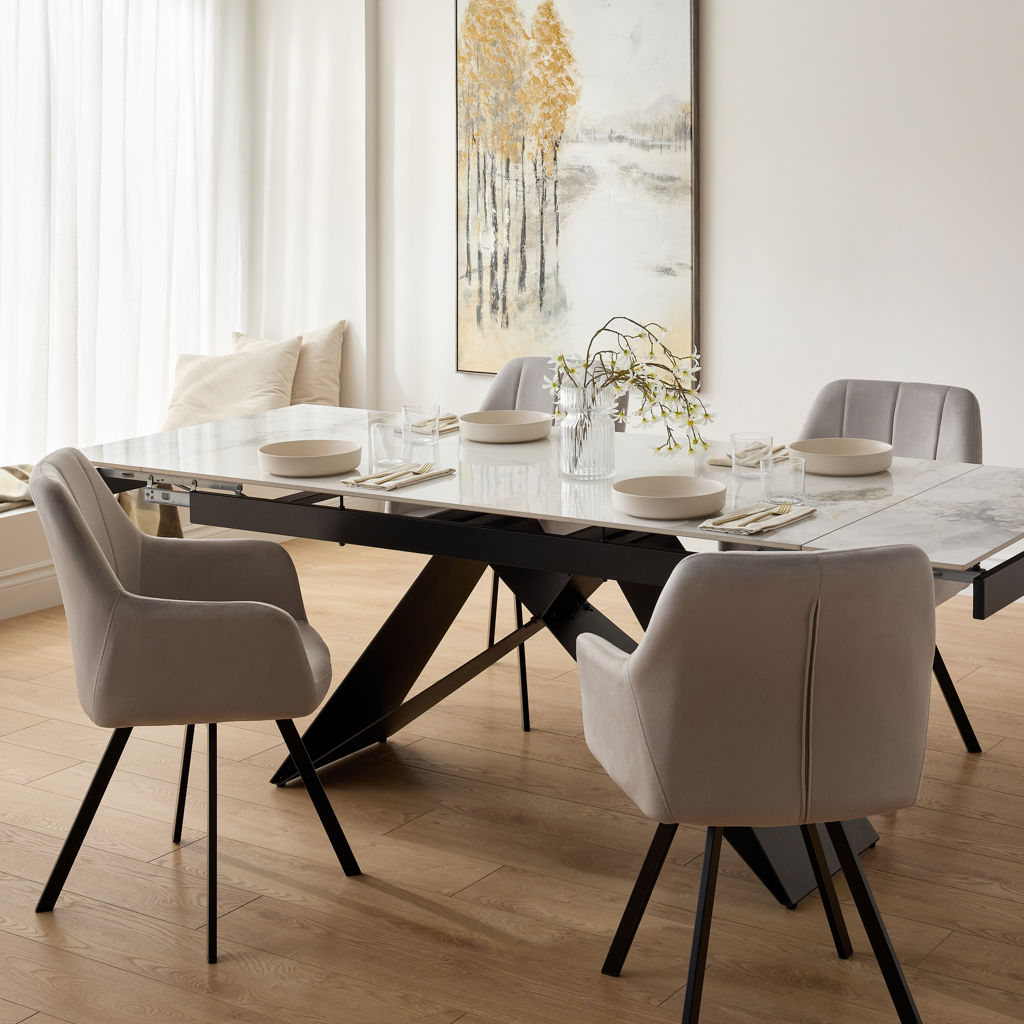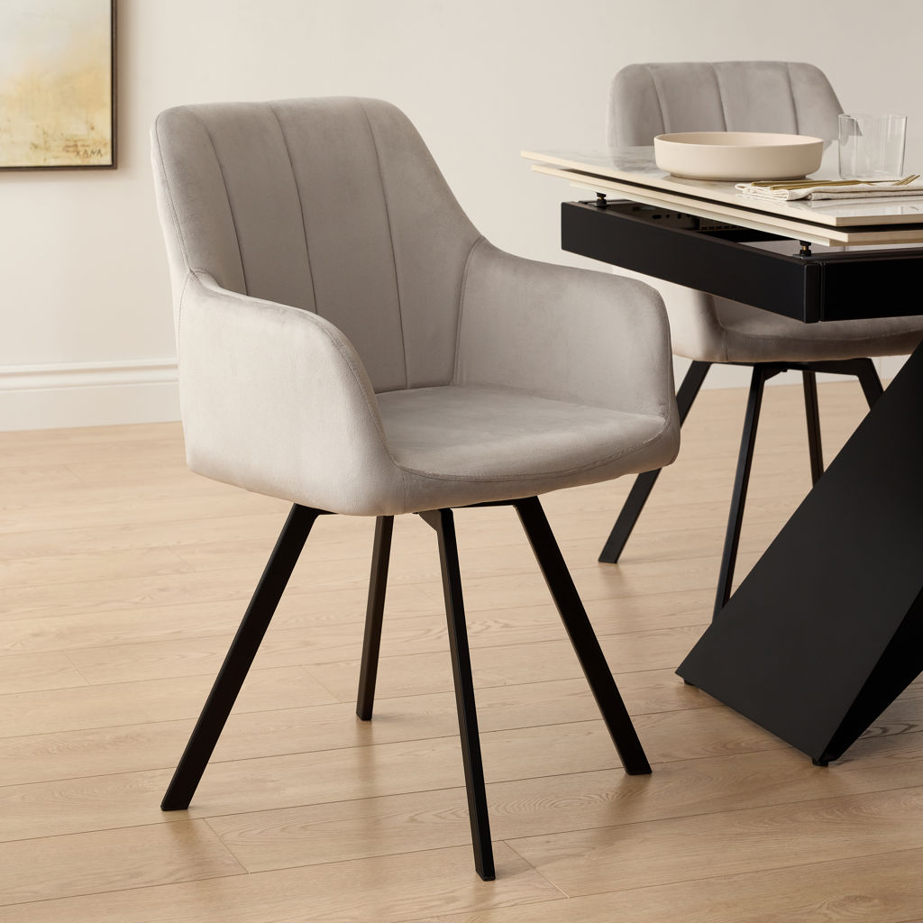 The C-1411 chairs in light grey velvet add a touch of sophistication to your dining room.