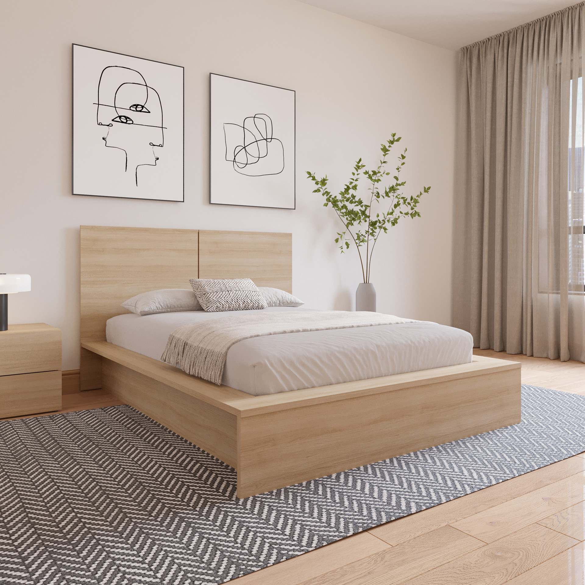 Elevate your bedroom with this modern headboard, designed with clean lines and a minimalist aesthetic. Crafted from engineered wood in a Natural Blonde Oak finish, it showcases the wood's natural grain color variation, adding an organic touch to your space.
