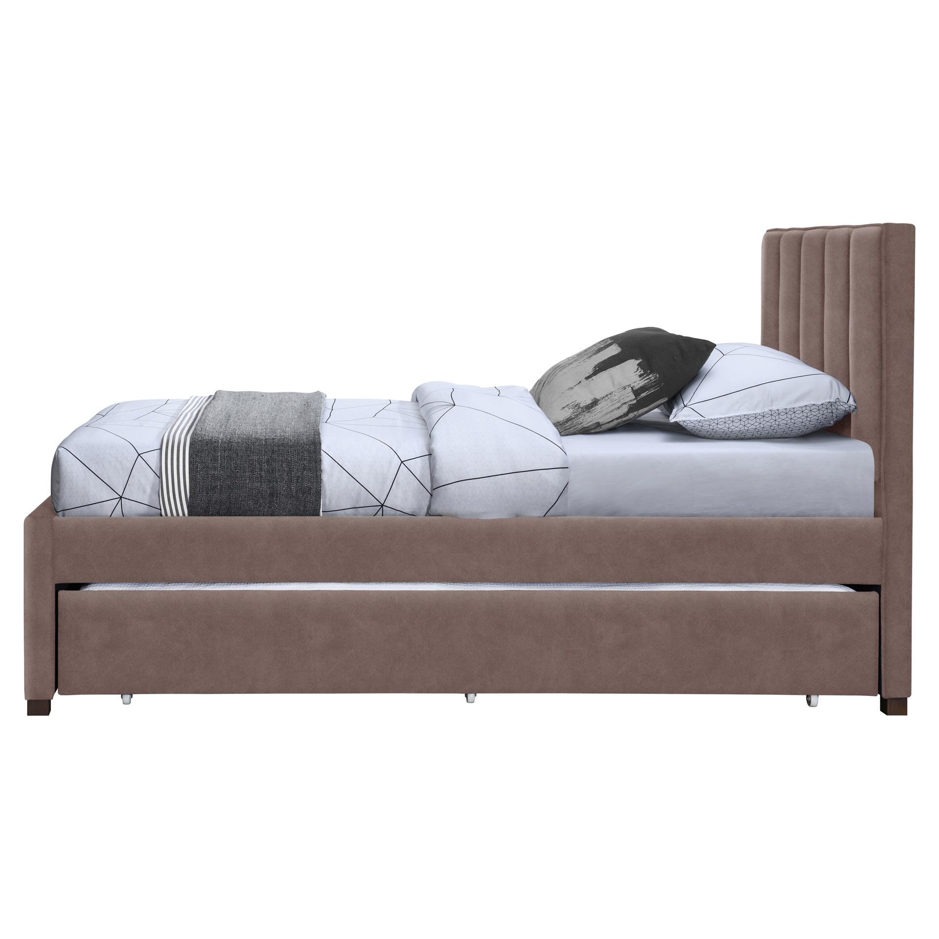 The channel-tufted headboard adds a handsome aesthetic, and the rolling trundle bed up to an 8" thick twin mattress, providing space for sleepover guests.