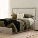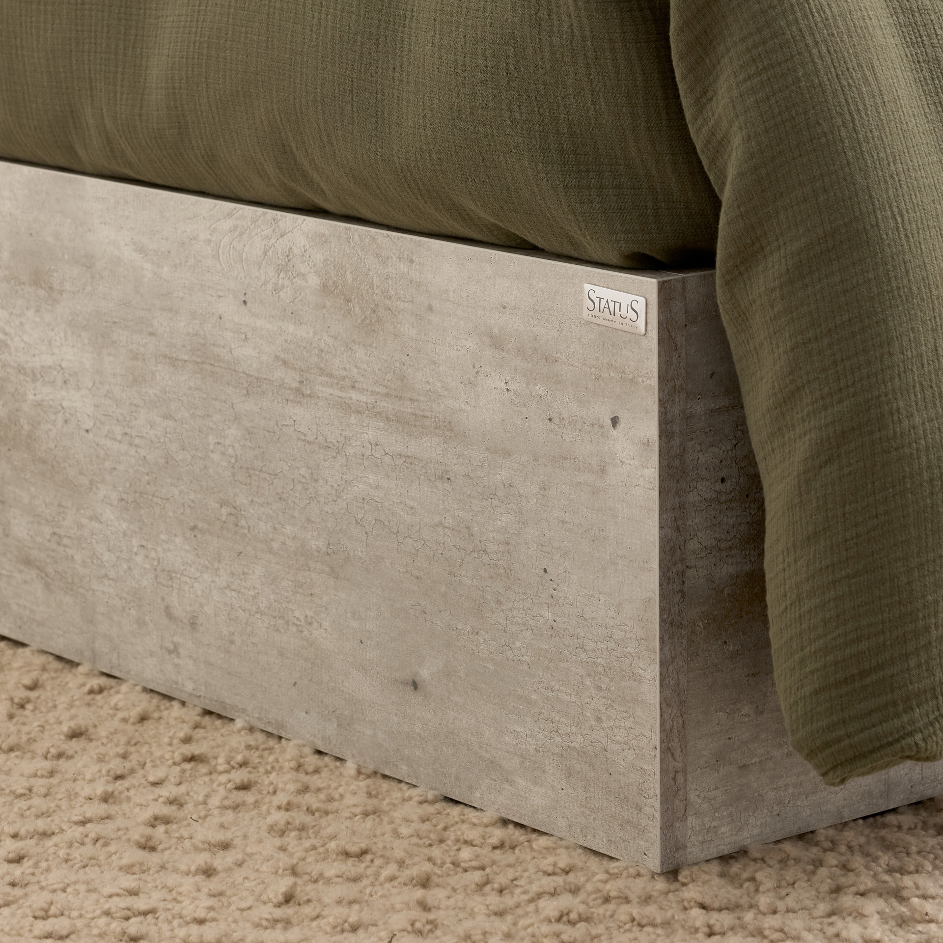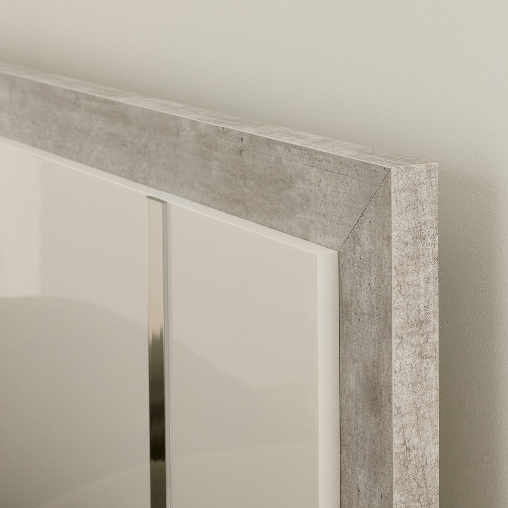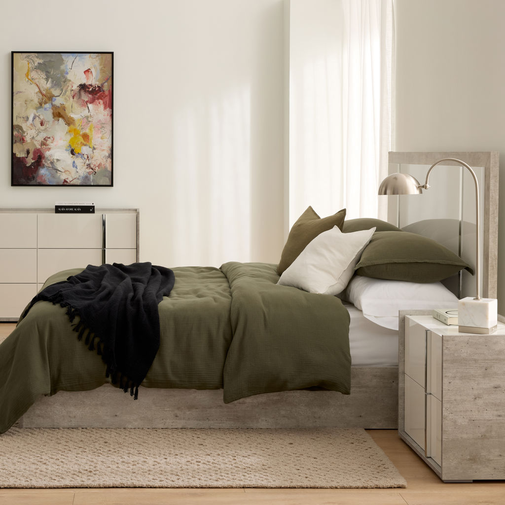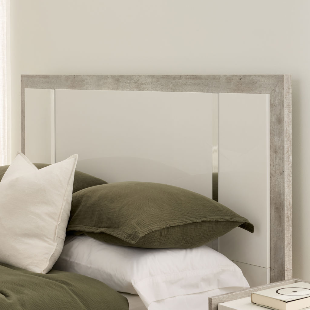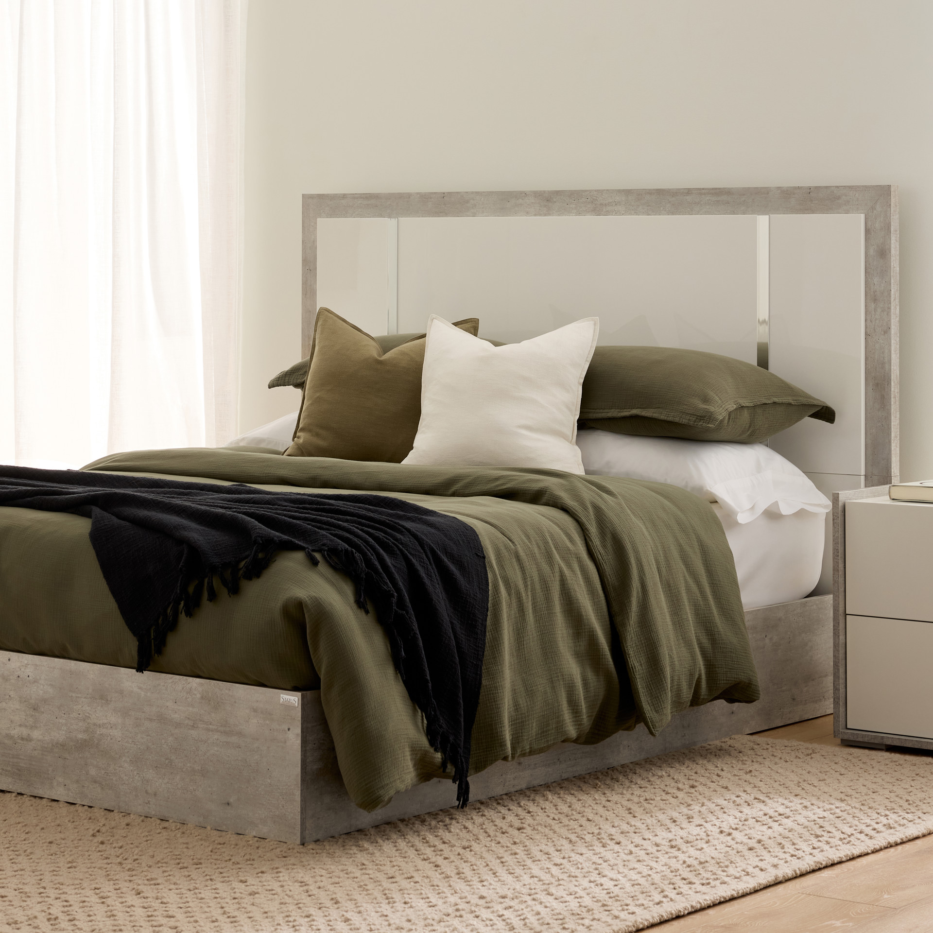 Treviso's contrast of crisp white, matte gray stone and gleaming chrome creates an exquisite blend of industrial texture and elegant glamour, perfect for a contemporary, European-inspired bedroom.