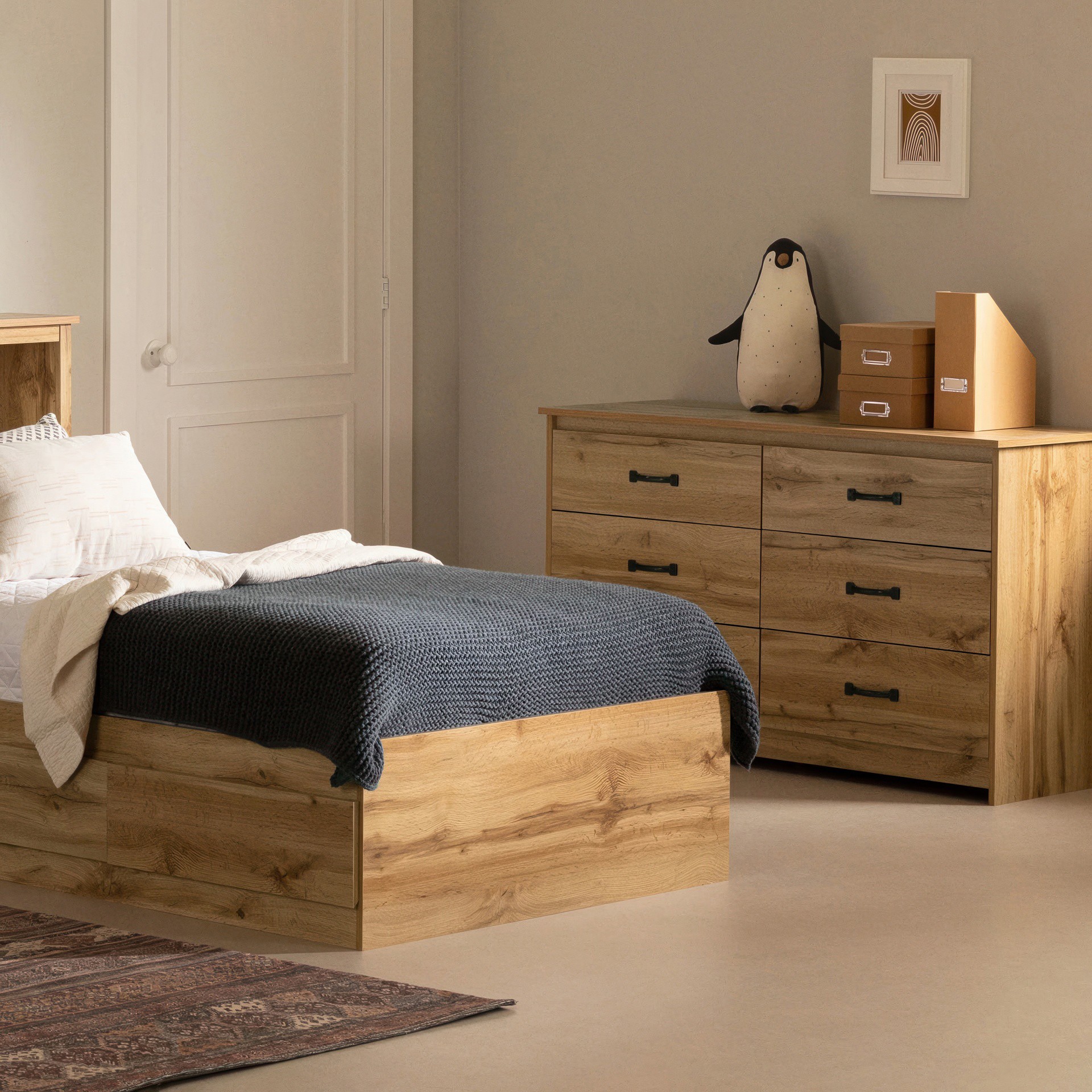 It's easy to organise your clothes with the 6 large drawers of the Tassio dresser. You'll have no reason to leave your clothes lying around in the bedroom! Feeling lazy? Don't worry, just put everything into the catch-all drawer so that nothing shows!