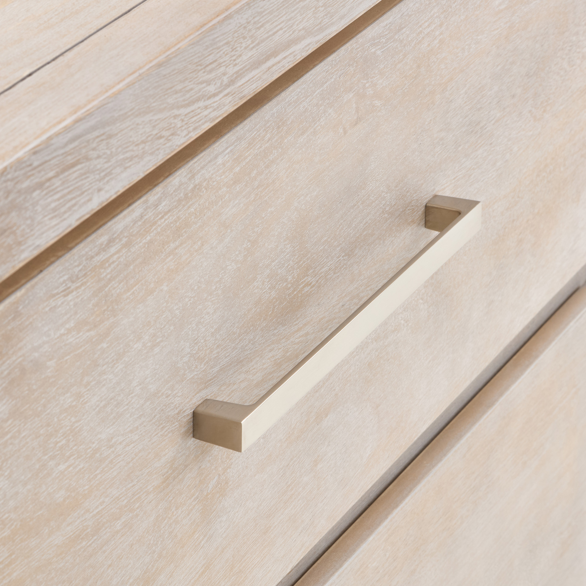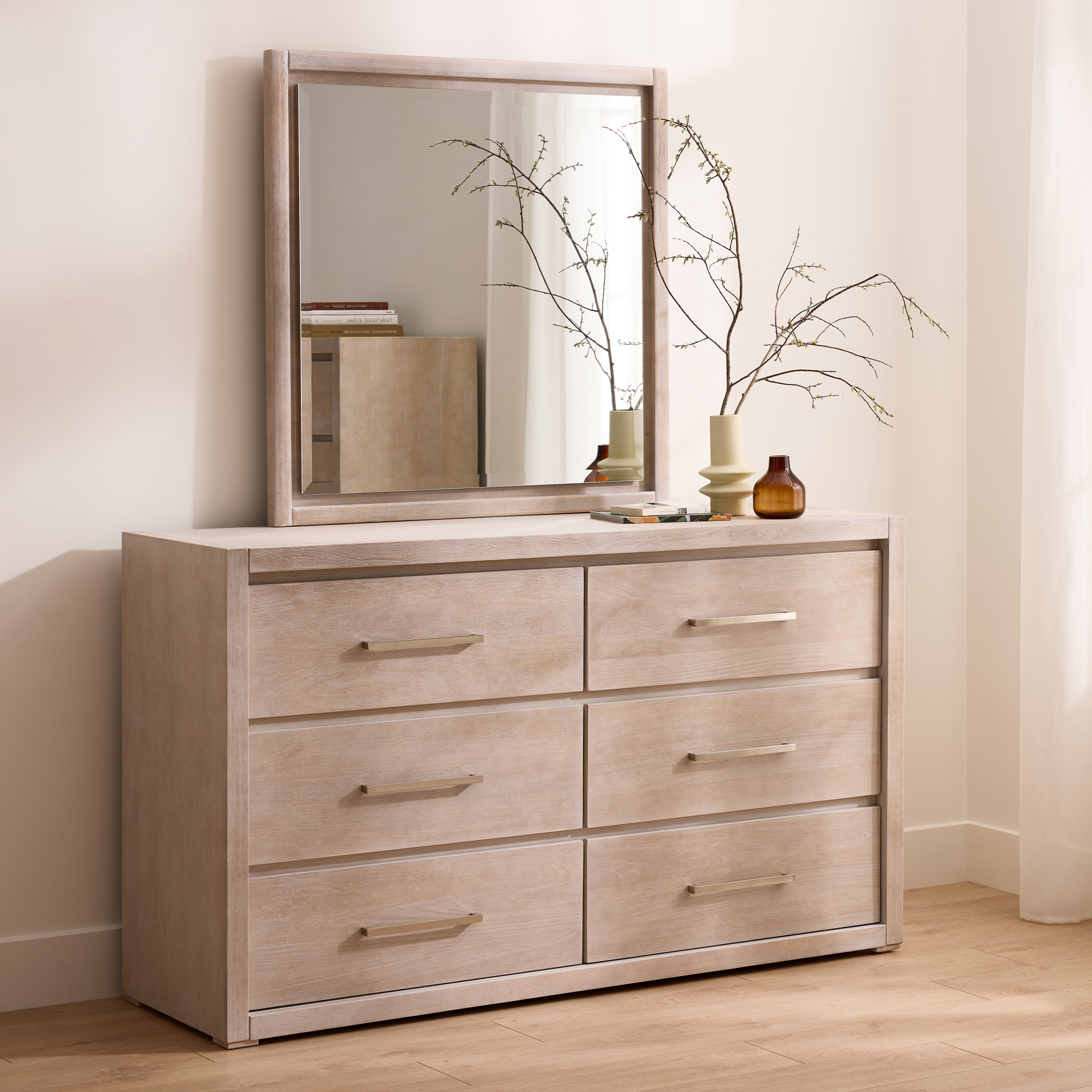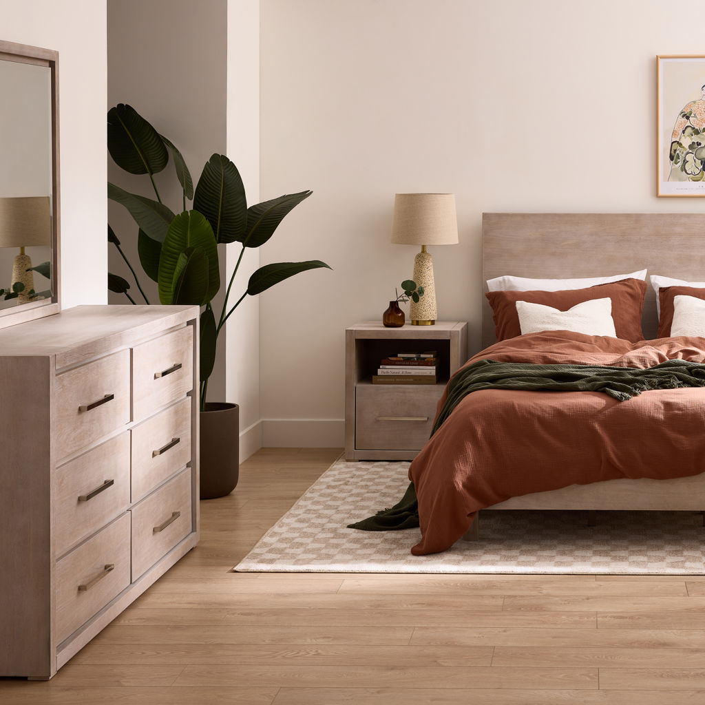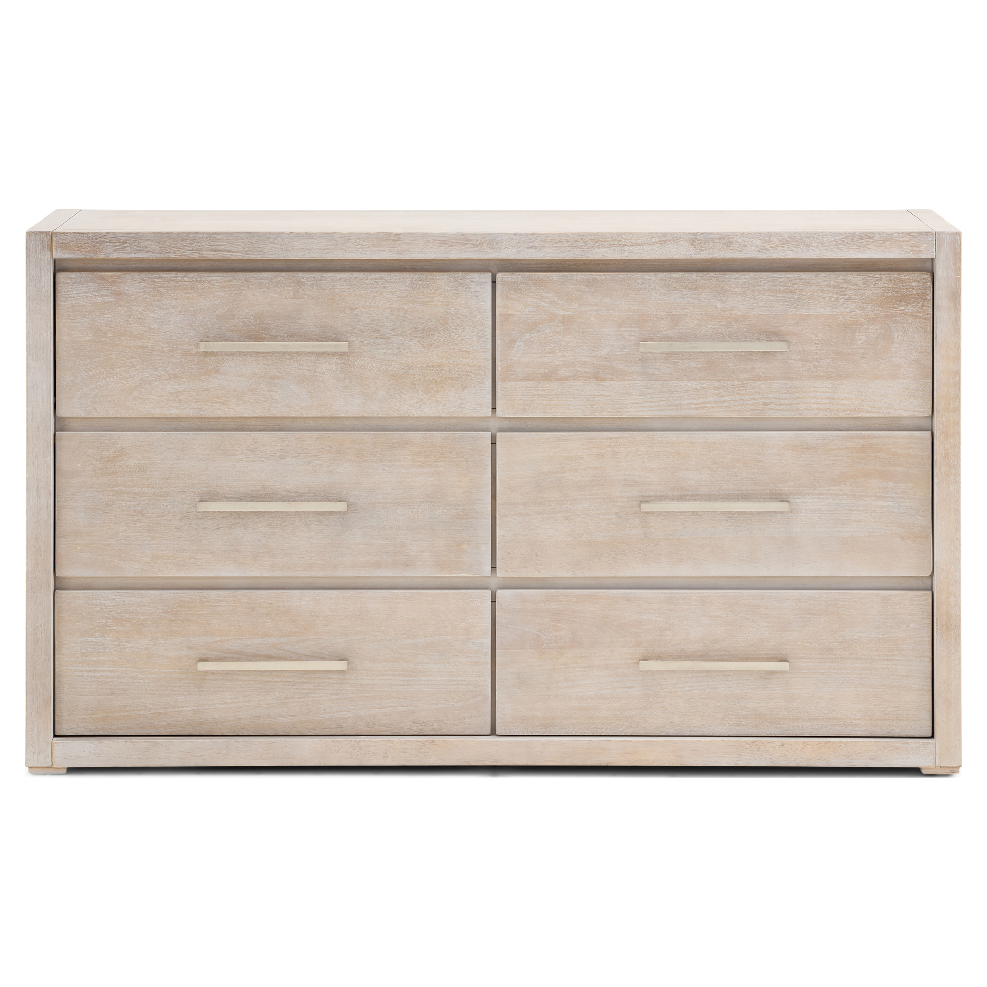 This six-drawer double dresser transforms your bedroom into a haven of organization. Its light wood finish brings a touch of natural softness that complements any décor, while the sleek handles add a subtle contemporary touch.