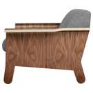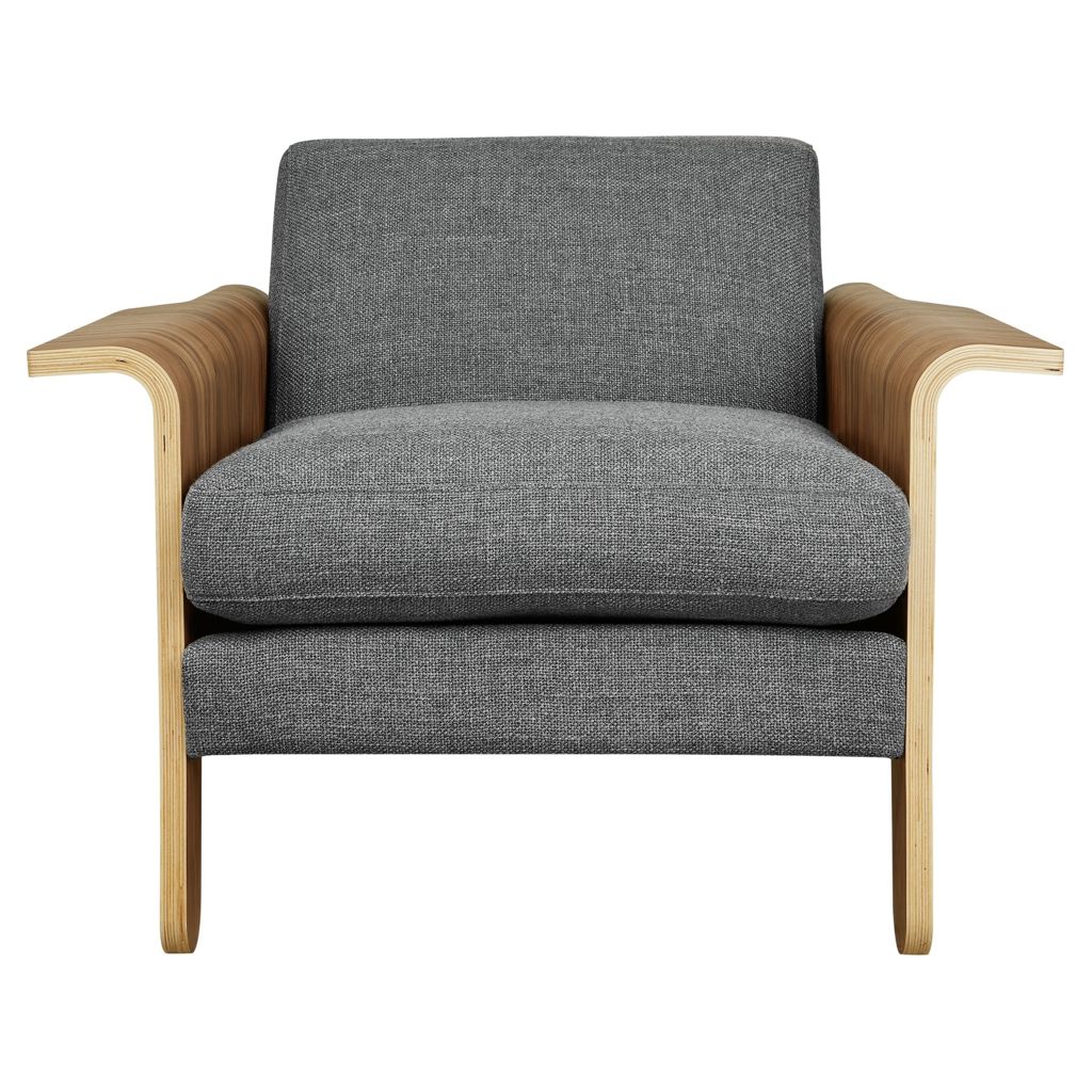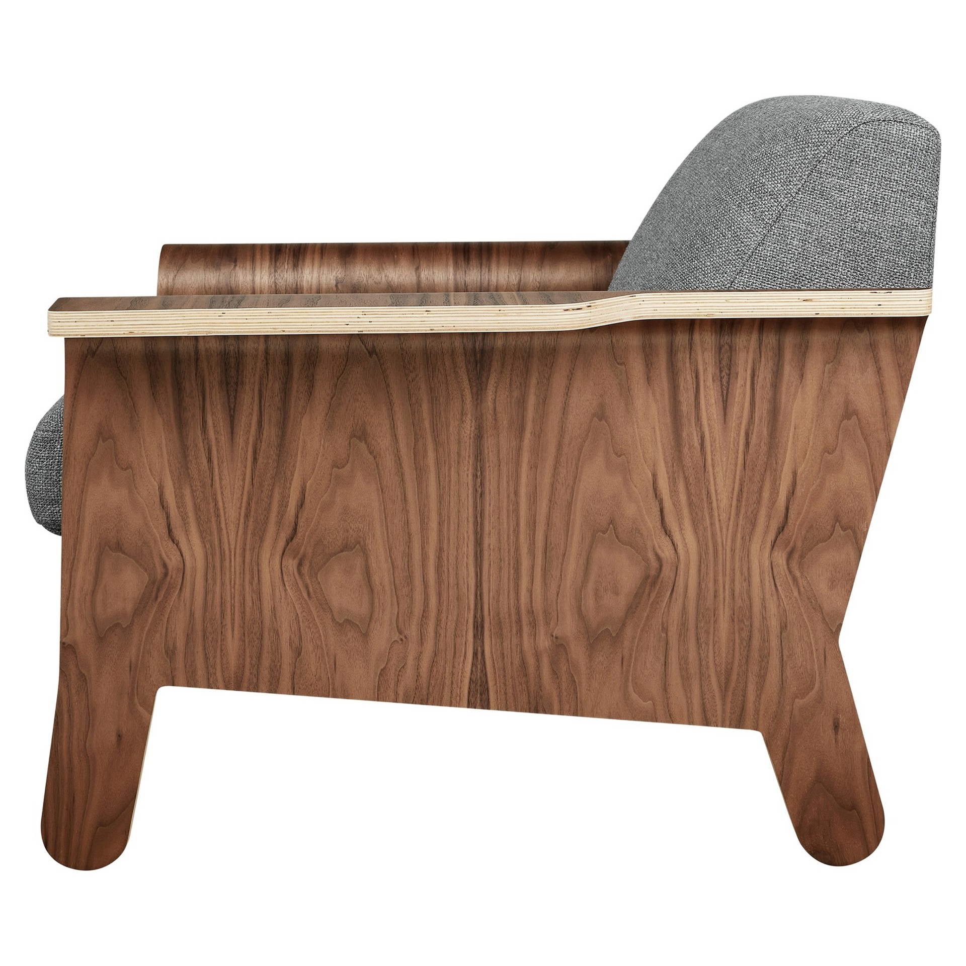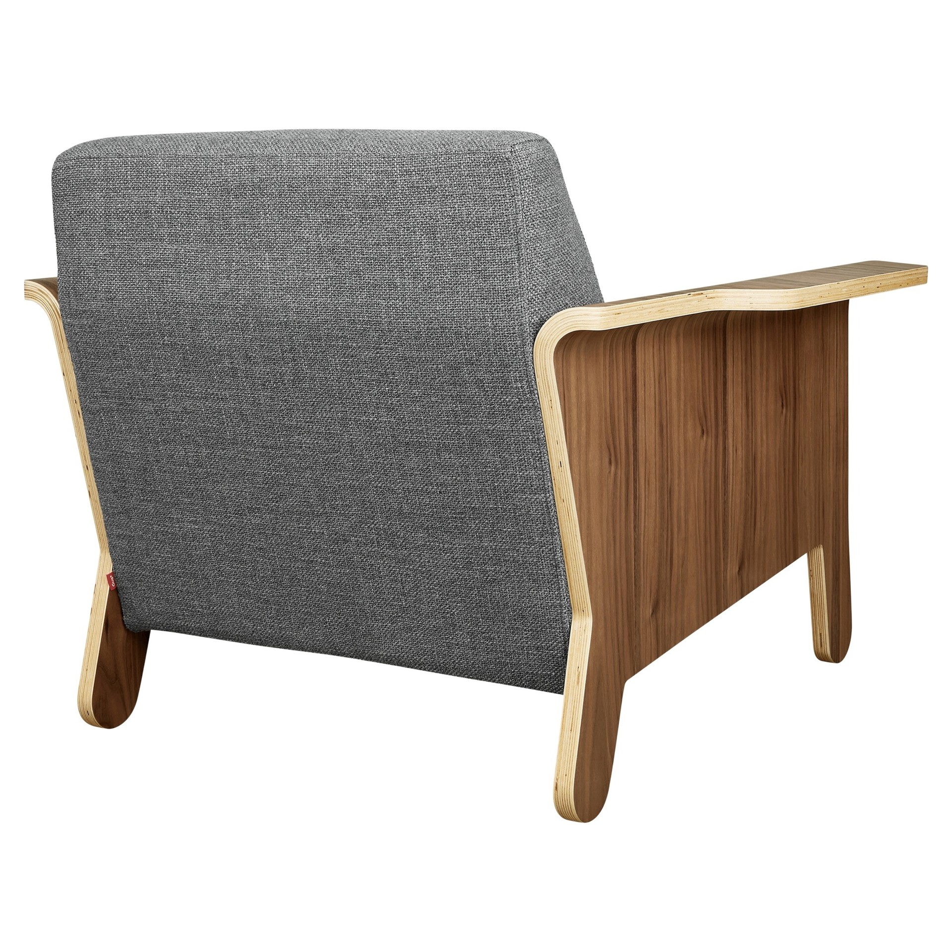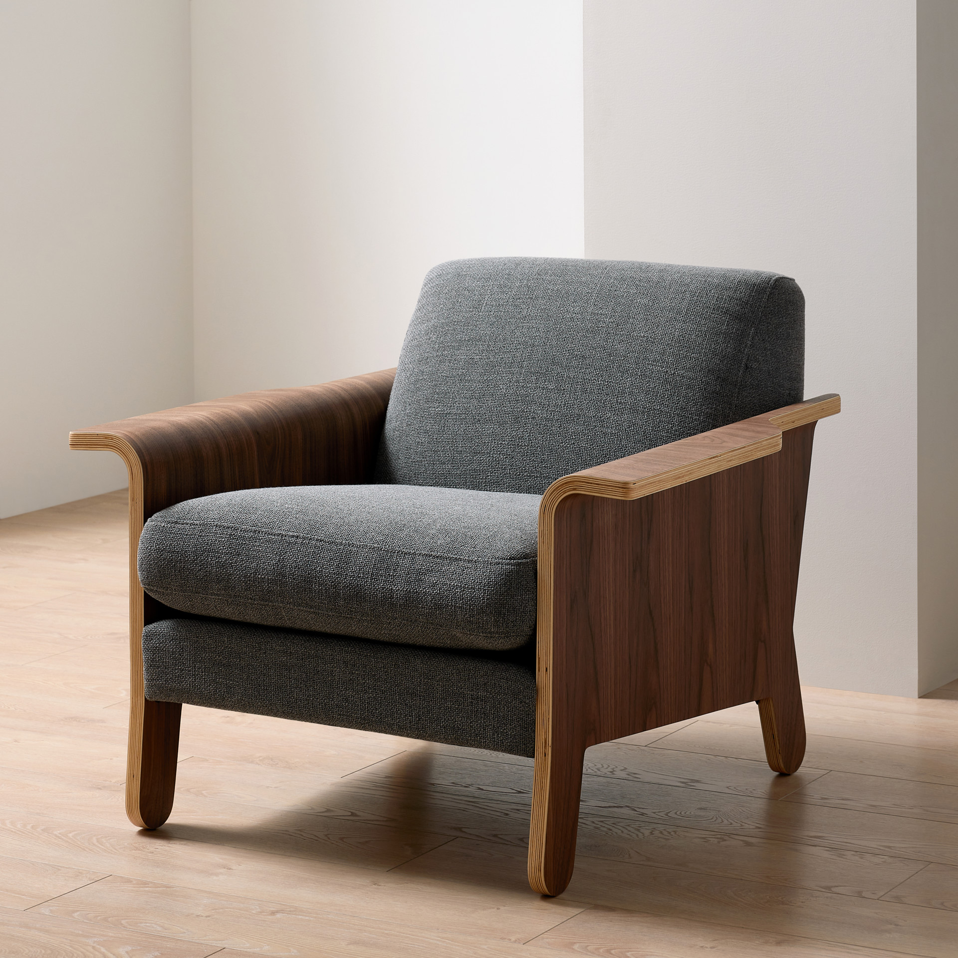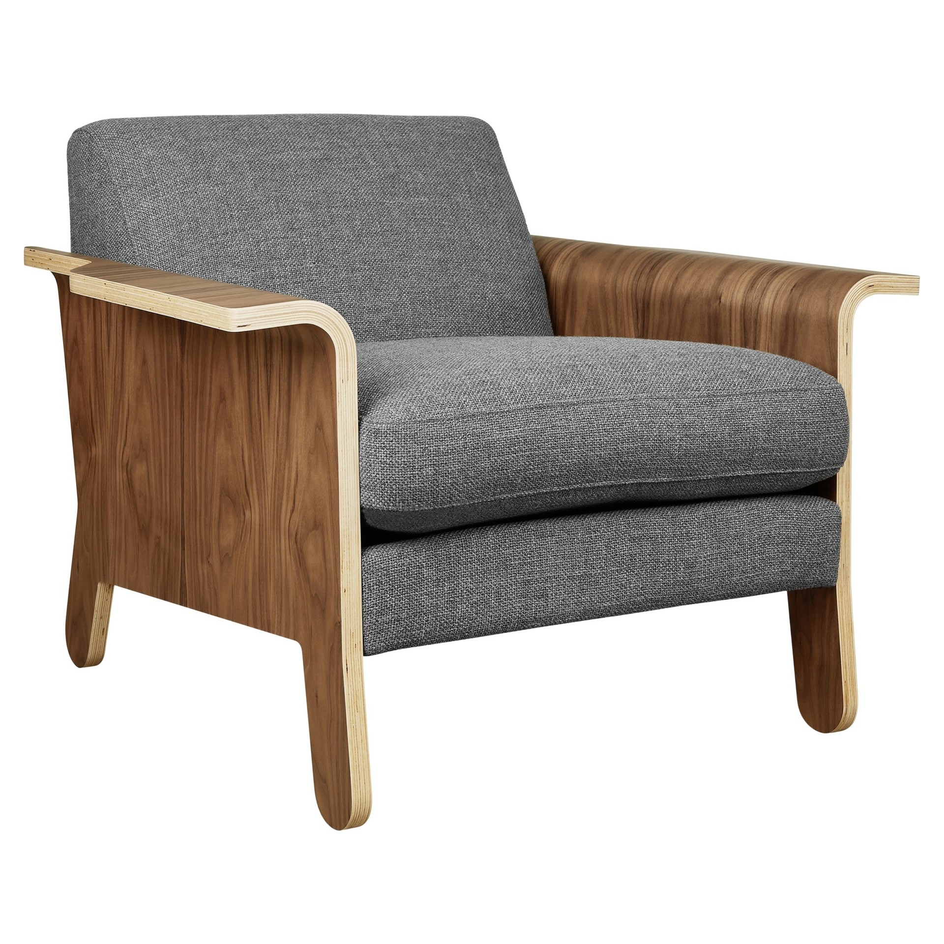 The Lodge Chair is a contemporary club chair with playful, bent ply arms and a sculptural profile. This unique design is available in top-grain leather upholstery to contrast a walnut-finished exterior frame. The inner frame is constructed with kiln-dried 100% FSC®-Certified hardwood.