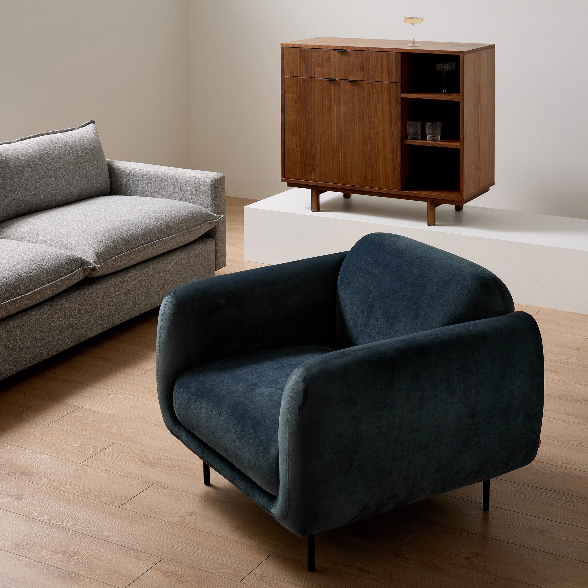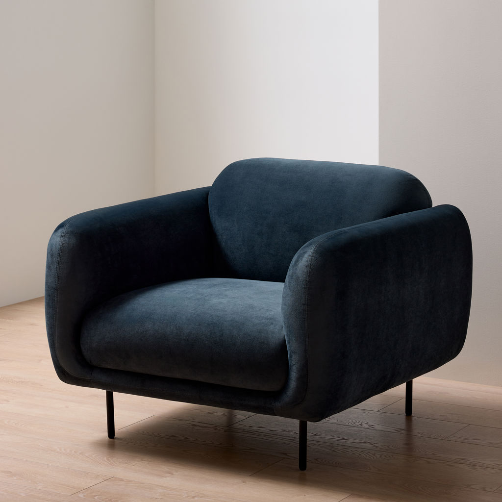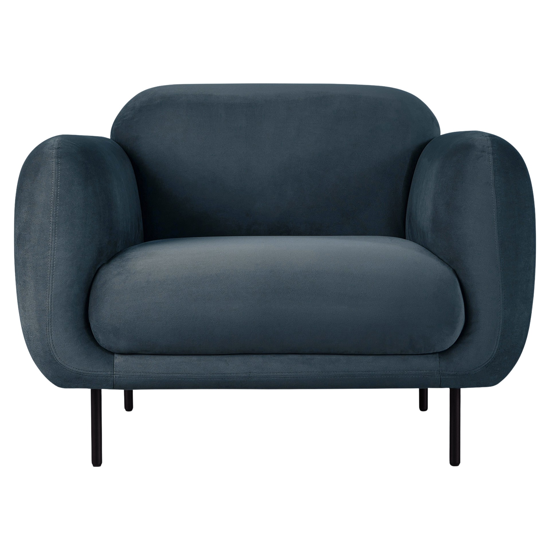 Fall under the spell of the Nord armchair, where comfort meets Scandinavian design. Its rounded, generous curves invite relaxation, while the soft fabric in a beautiful blue hue adds a touch of natural sophistication to your space.