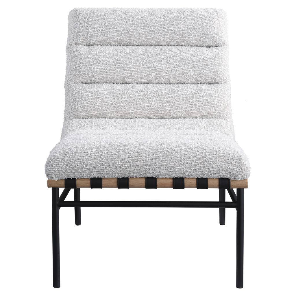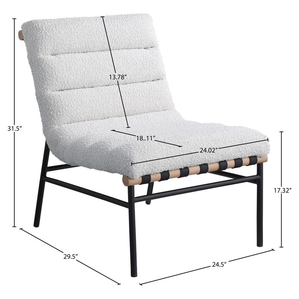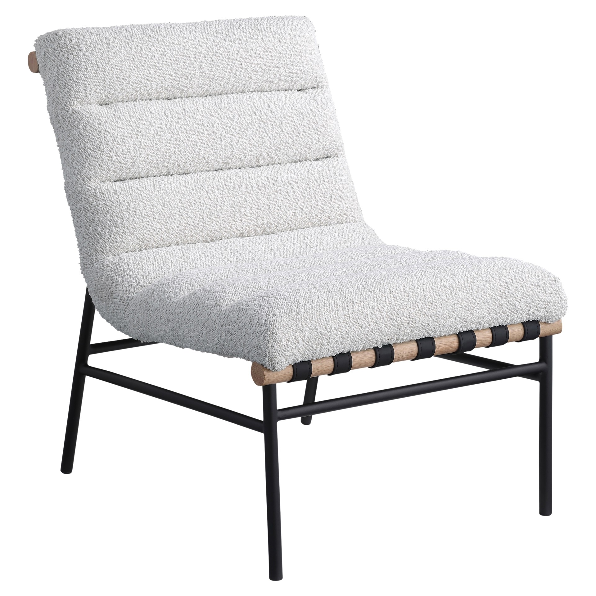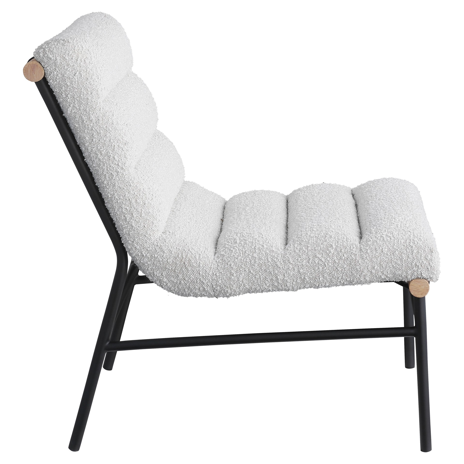 An overstuffed, channel-tufted seat and back cushion make it super comfy and ready for evenings spent relaxing and taking it easy. An all-metal frame provides support for durable use, and a white oak veneer metal dowel provides interesting contrast to draw the eye instantly from all angles.