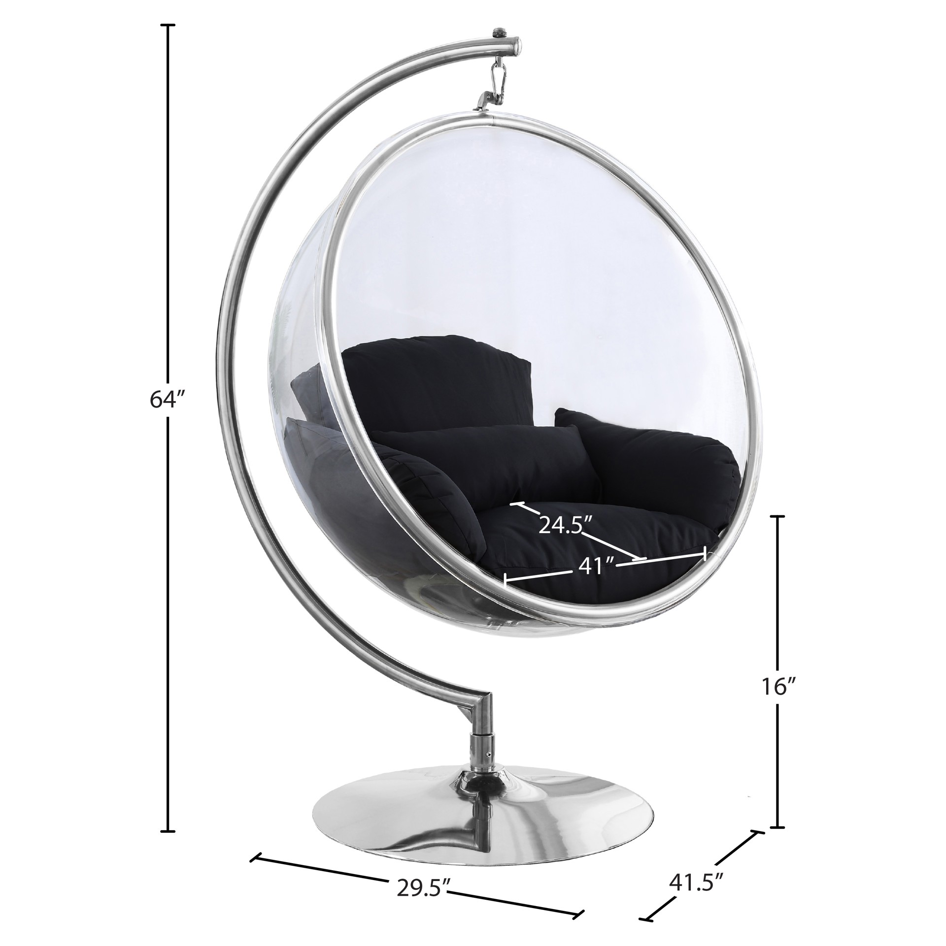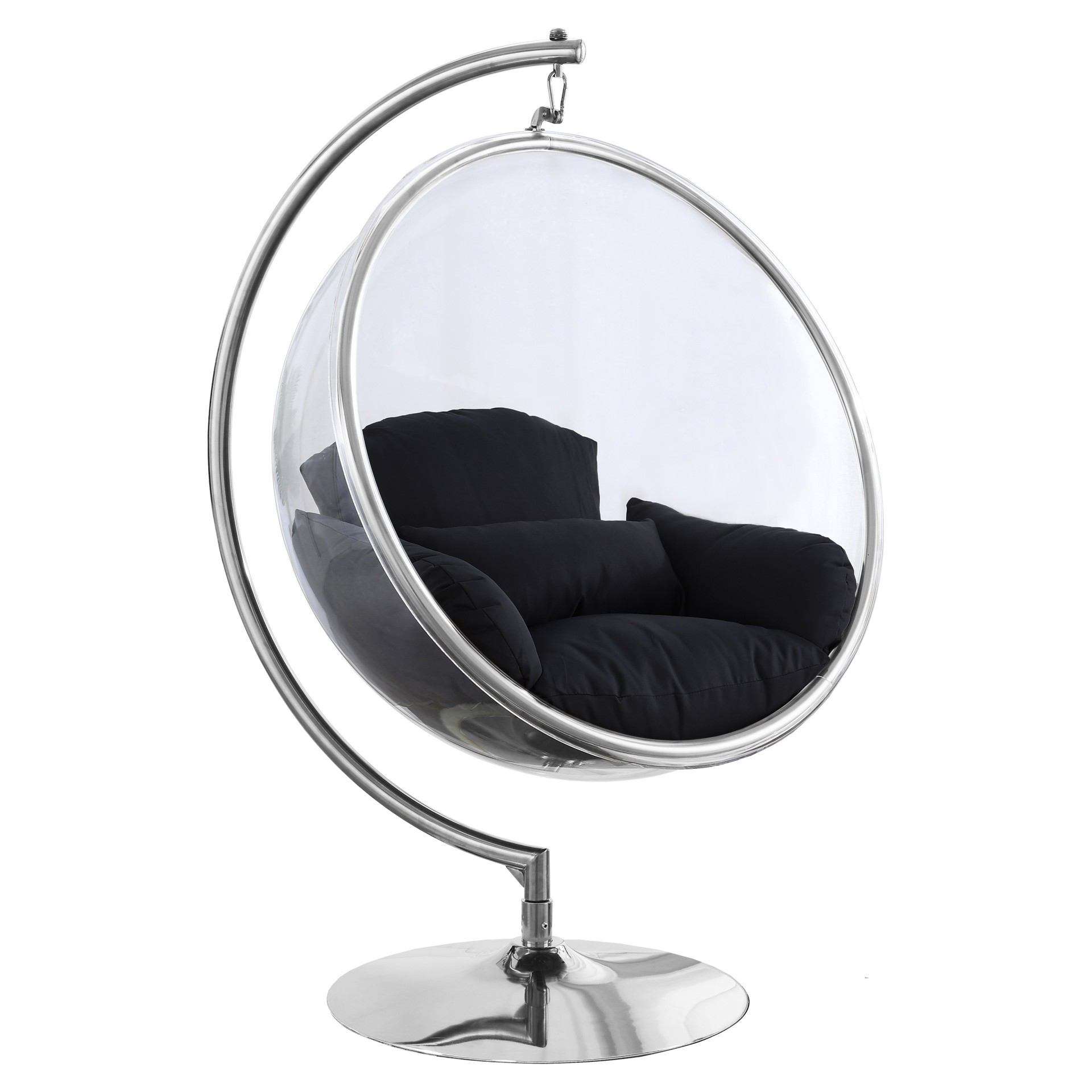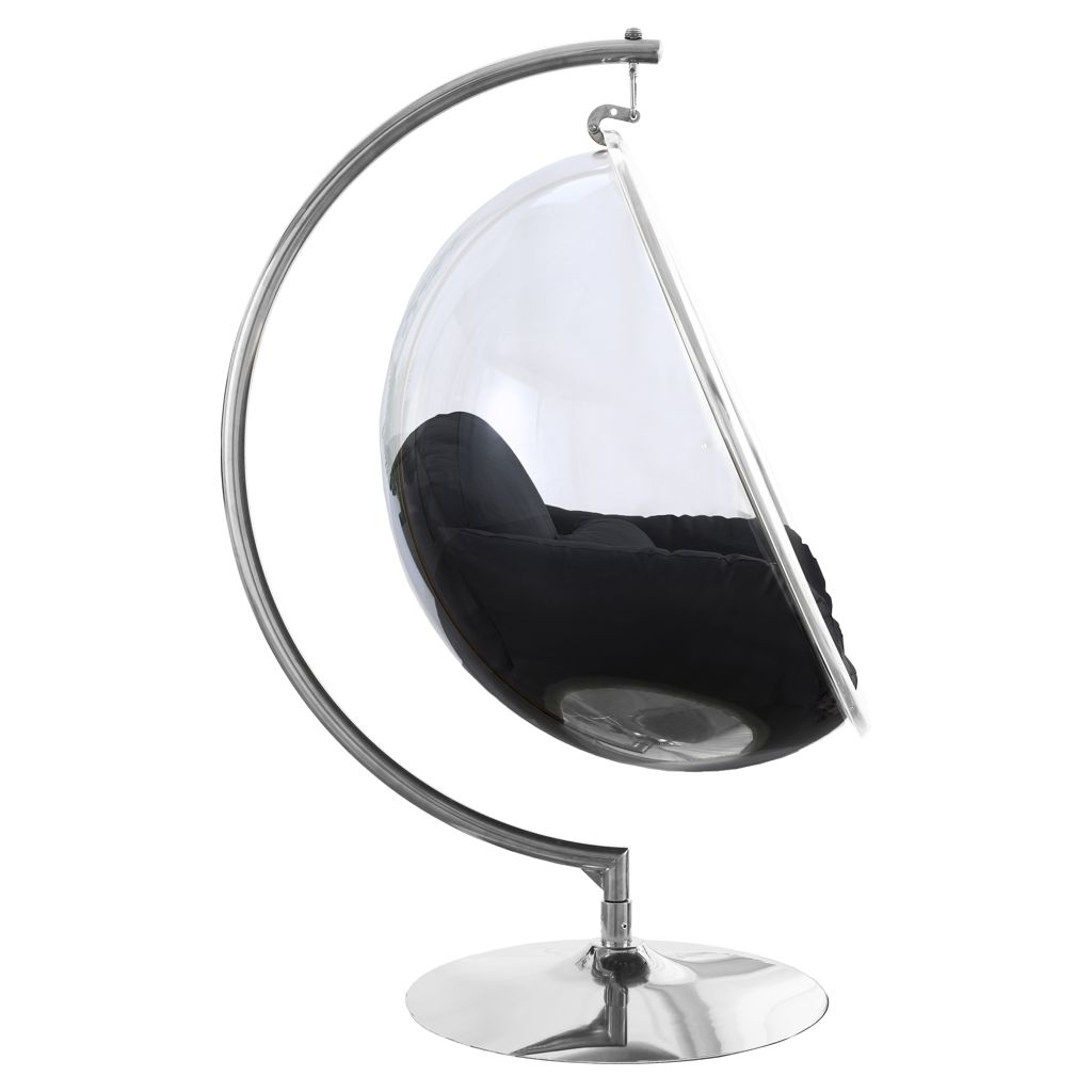 Retreat to your own little bubble, literally, in this Luna acrylic swing bubble accent chair. What a modish addition to your living room, bedroom or other space! This Luna chair features an acrylic egg-style seat topped with black fabric-covered cushions for supreme comfort. The chrome metal base and frame provides sturdy support so that you can chillax to your hearts content in your very own sanctuary.