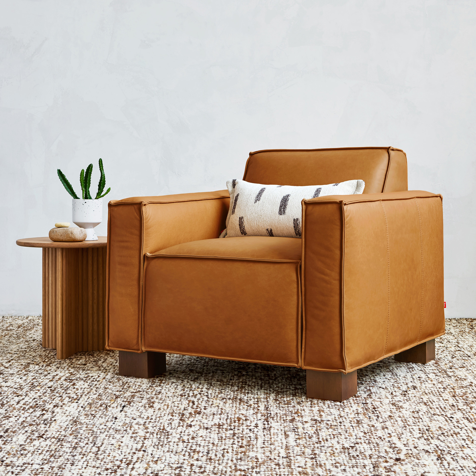 The Cabot Armchair stands out for its fixed seat and backrest, architecturally inspired block wood legs, and simple French seams.