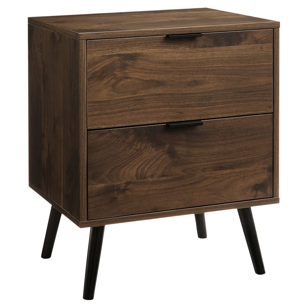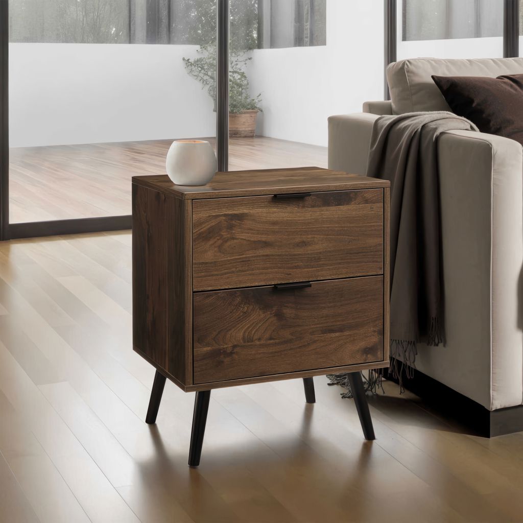 Equipped with two spacious storage drawers and accented with black metal handles, this table is perfect for keeping your essentials neatly tucked away, making it an ideal nightstand or side table. The black solid wood legs ensure a sturdy and stable structure that supports your daily needs while maintaining a sleek profile.