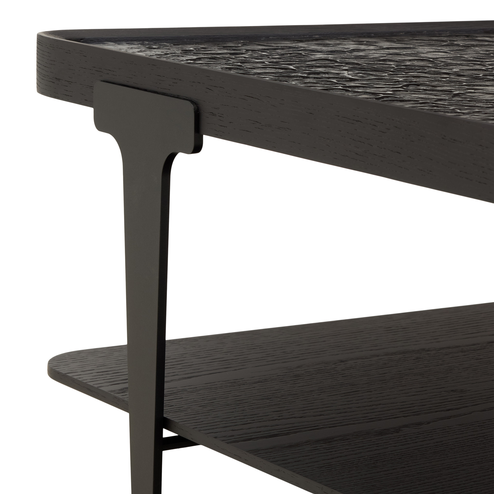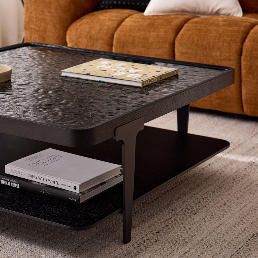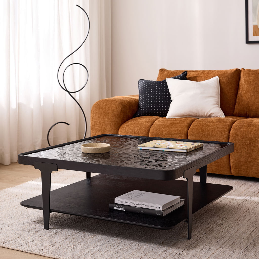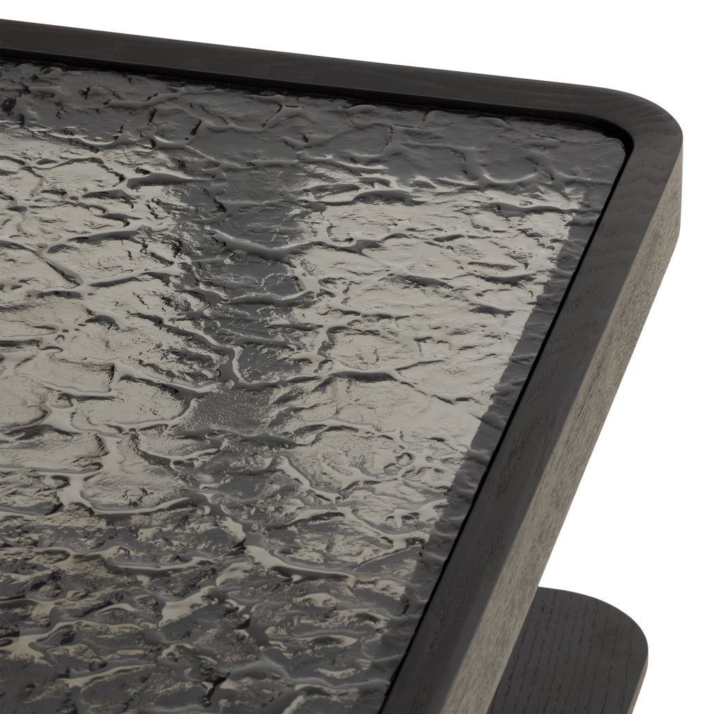 The solid wood frame is elegantly complemented by smoked glass, subtly revealing the refined natural wood veneer beneath.