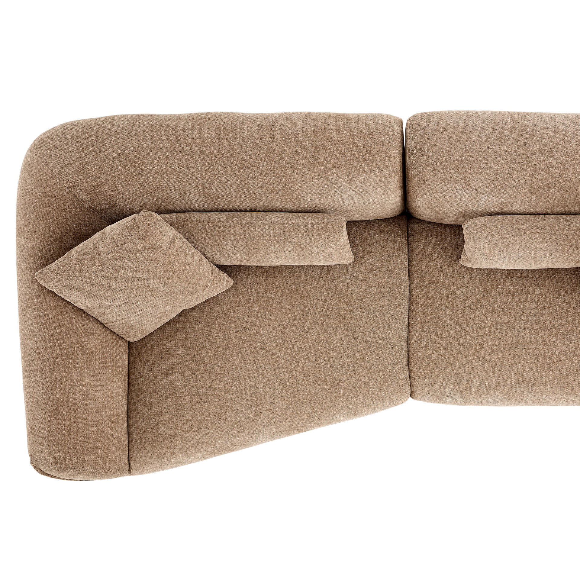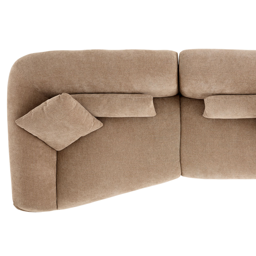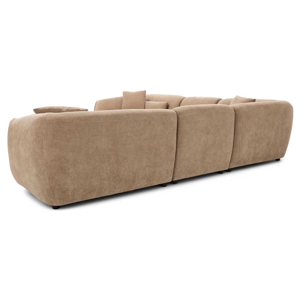 Its rounded lines and velvety fabric upholstery in warm tones create a constant invitation to unwind. The generous L-shaped configuration seats up to 8 people, perfect for large families or those who love entertaining. Thick, plush cushions combined with wraparound armrests provide optimal support for hours of relaxation.