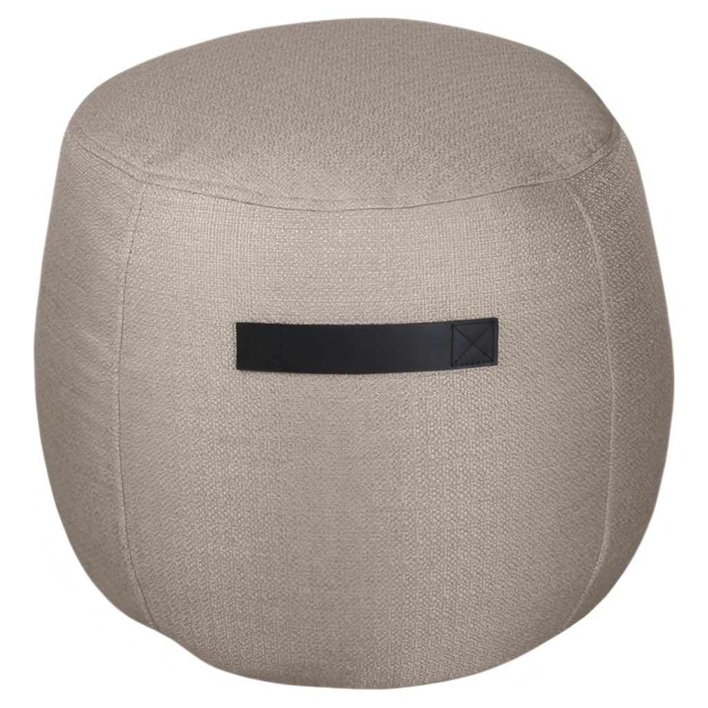 The BILLY round ottoman is made of a high-quality upholstery fabric. It is decorated with 2 black leather straps.