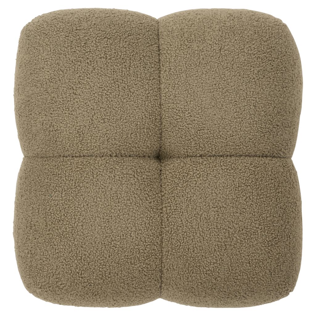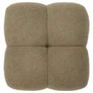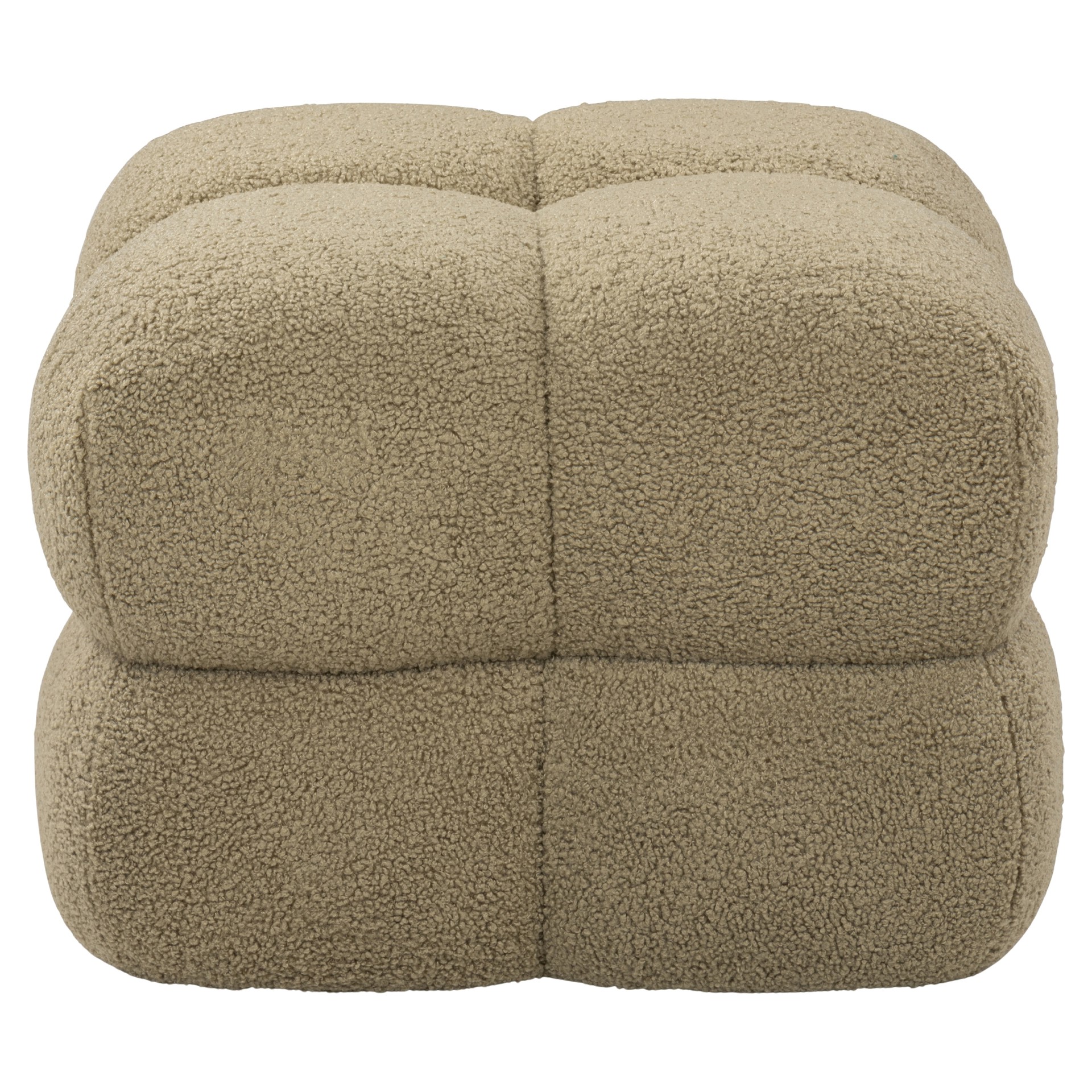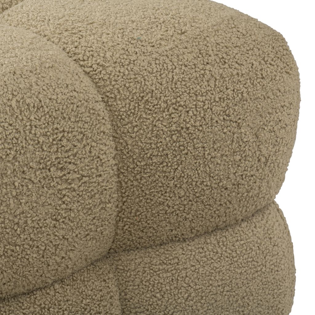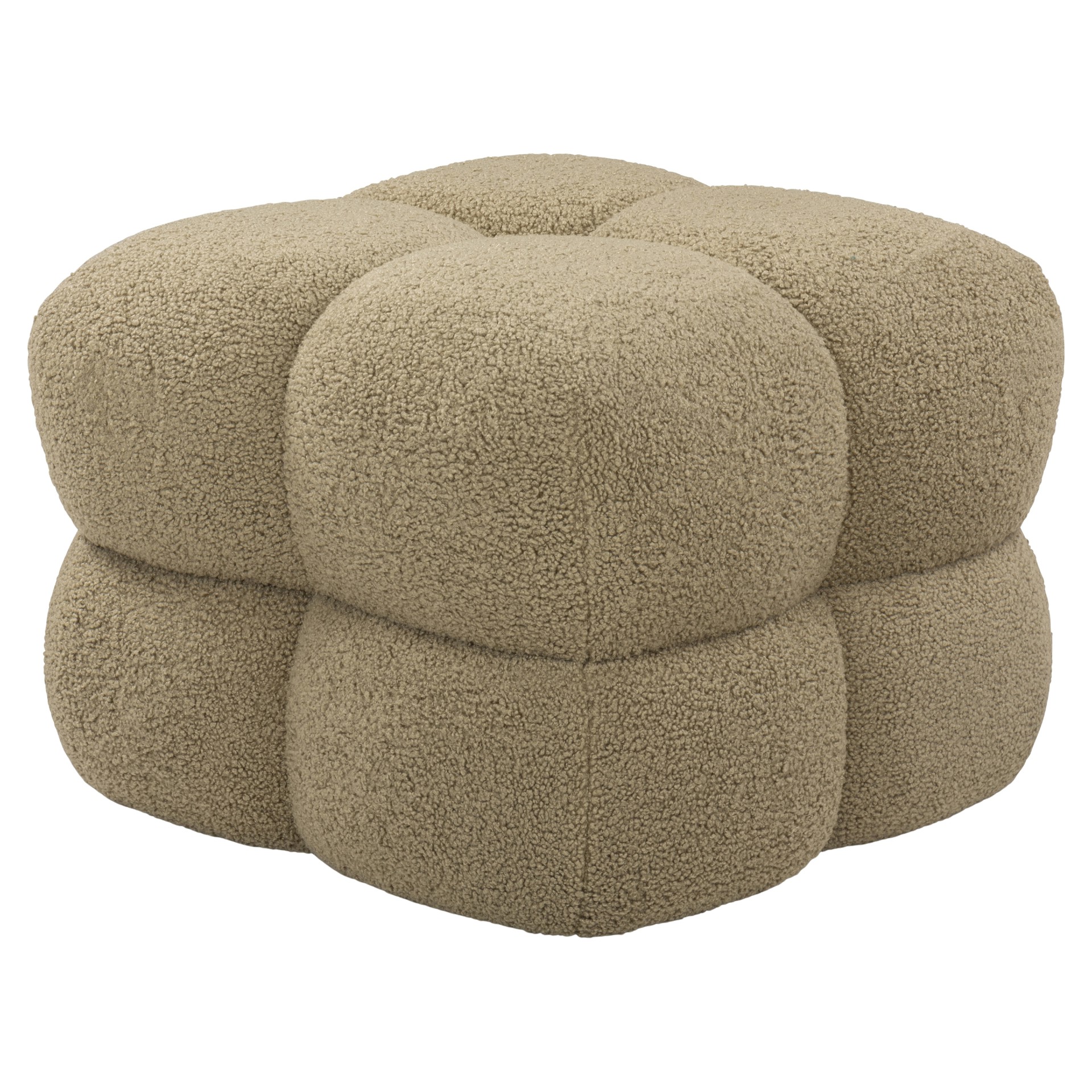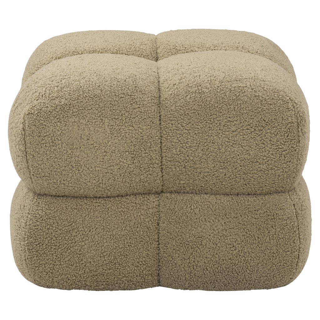 The Niva cube ottoman is crafted with boucle fabric and constructed with 35% plywood, 35% foam, and 30% polyester fabric