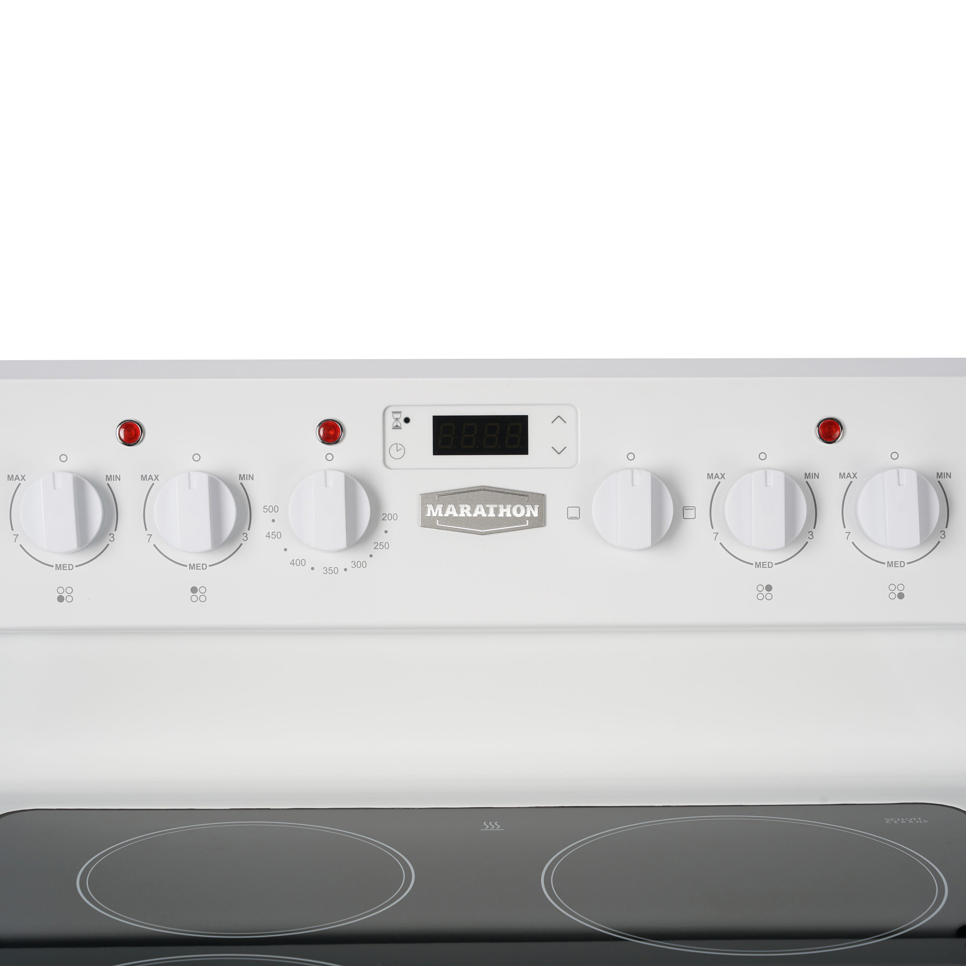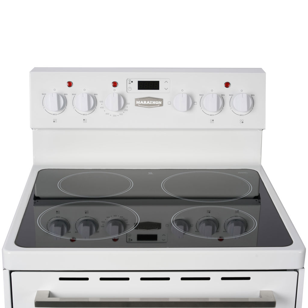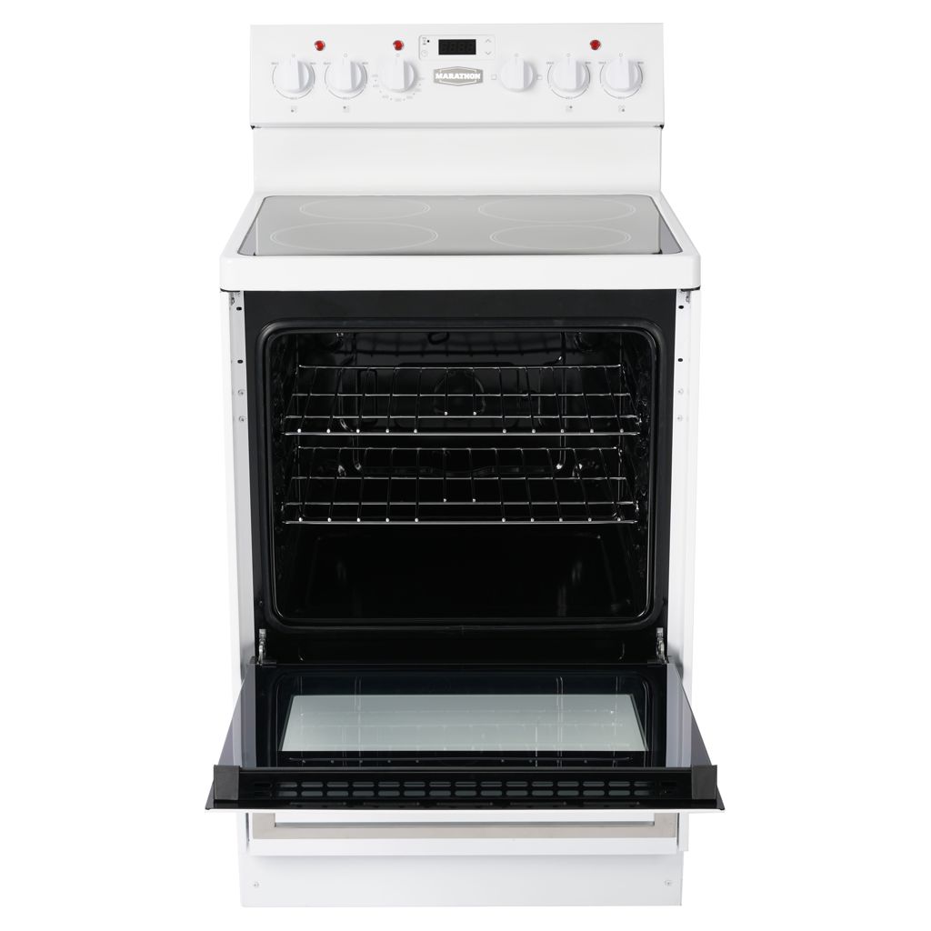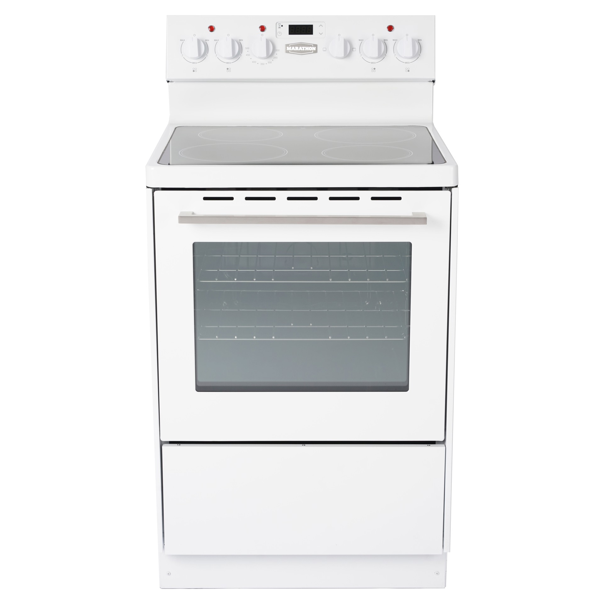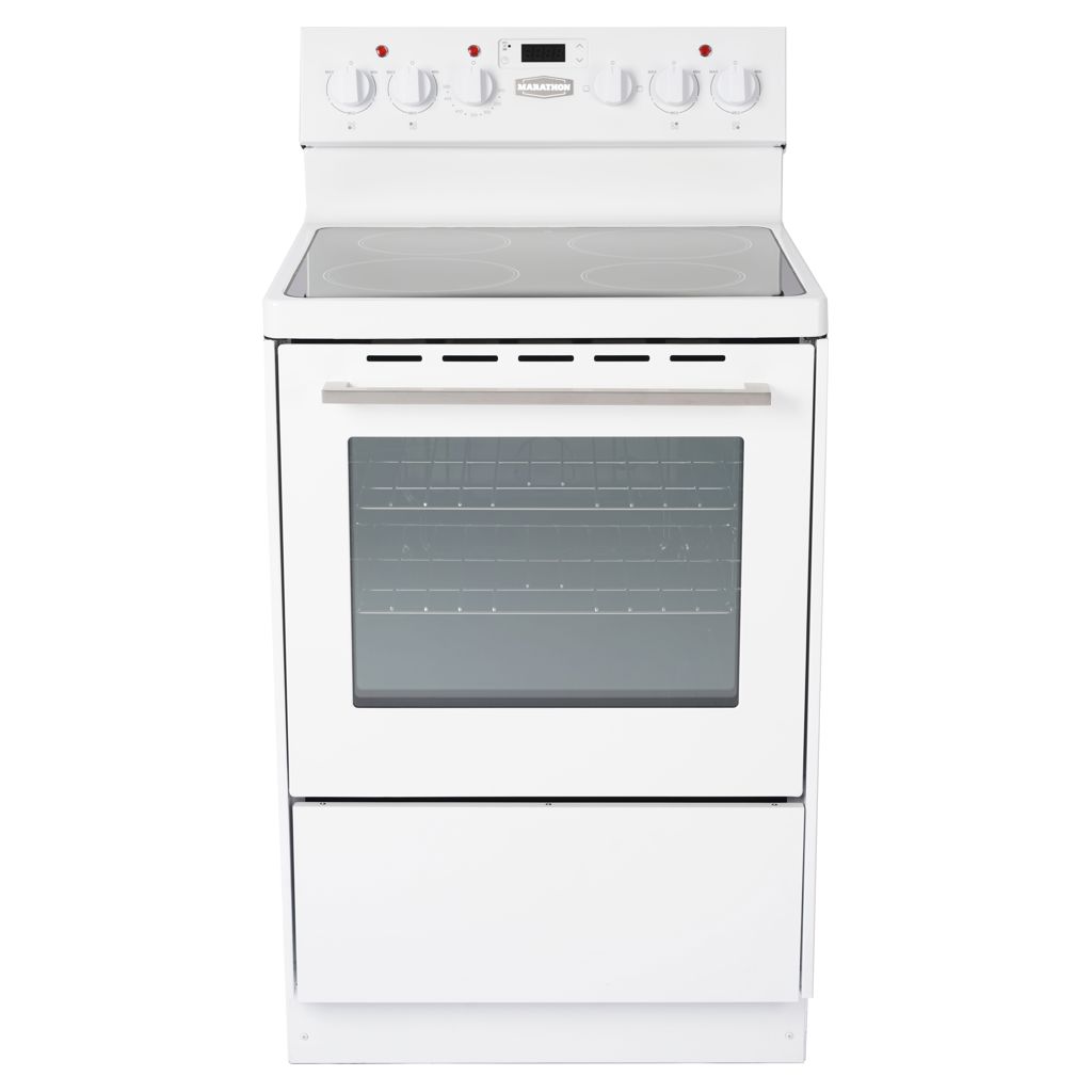 Ideal for places where space is at a premium, this 24” wide, contemporary-style Marathon deluxe range with smooth surface lets you cook or grill in a spacious 2.7 cu. ft. oven with a concealed cooking element and durable metal door.