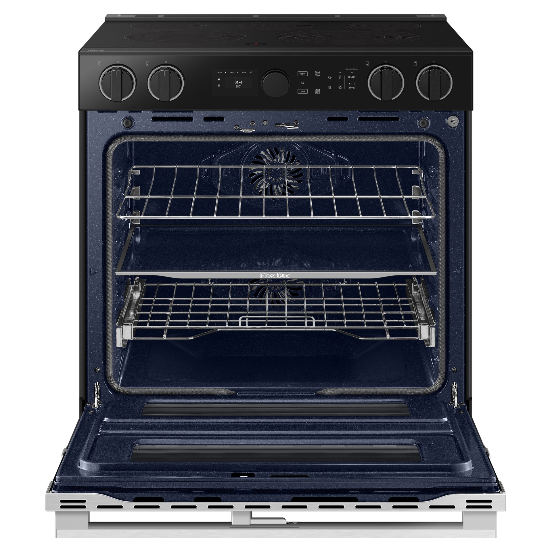 Flex Duo oven with independent upper and lower cooking zones for versatile cooking, and double door with central hinge minimizes heat loss
