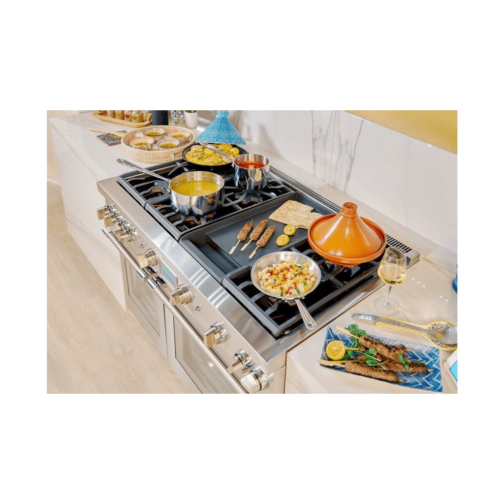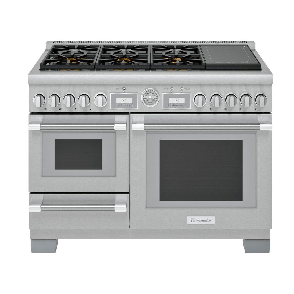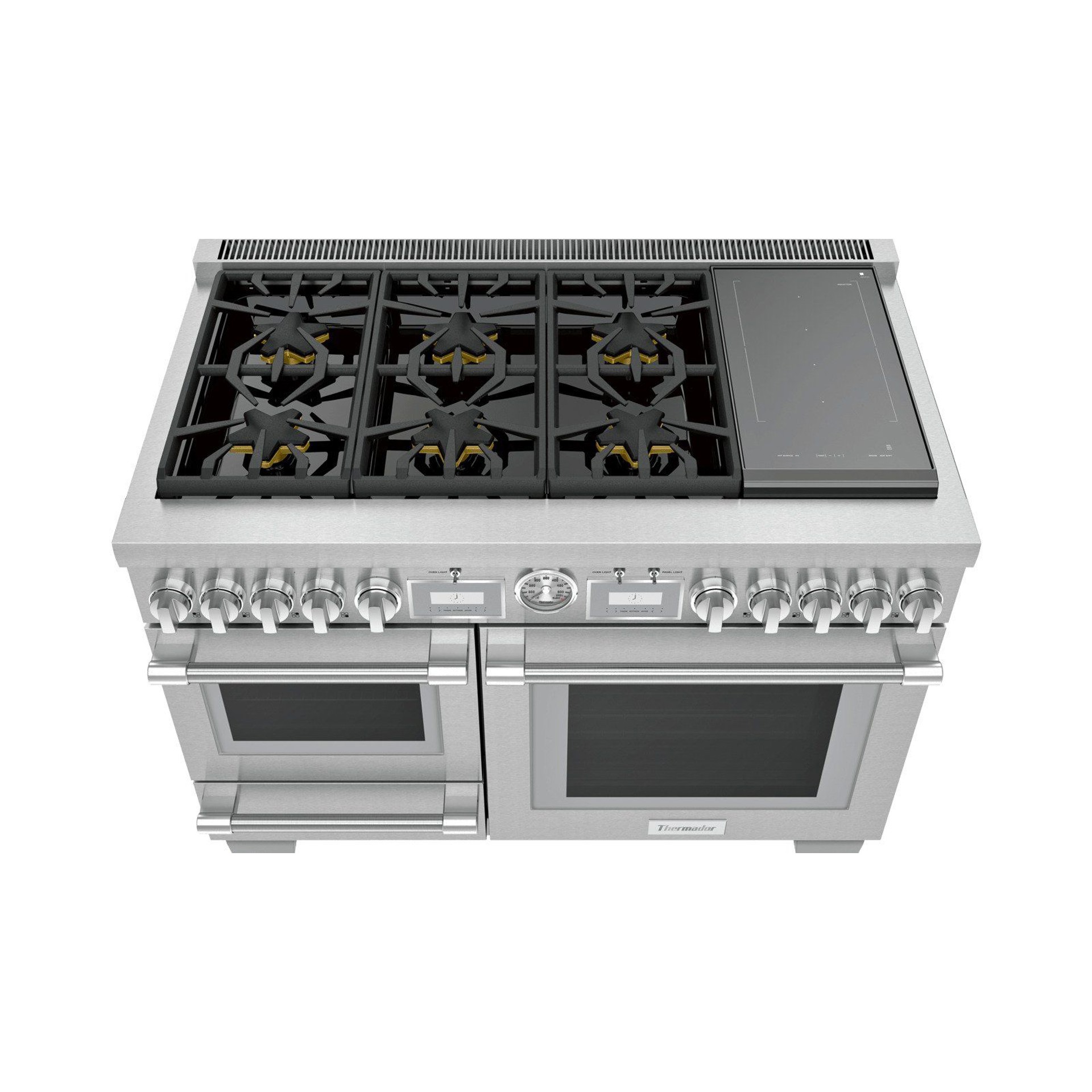 This 48" dual energy range from Thermador features six burners and a 12" induction surface.