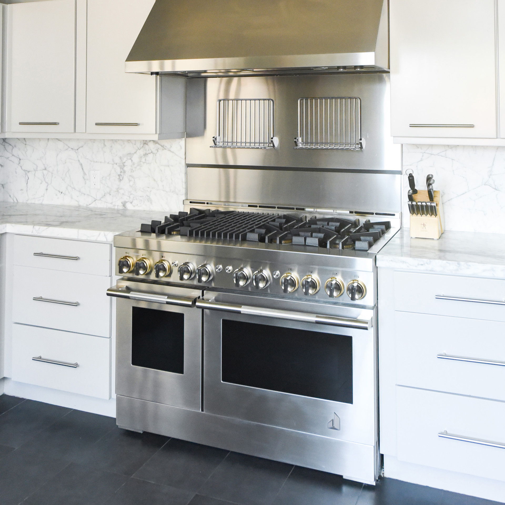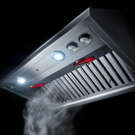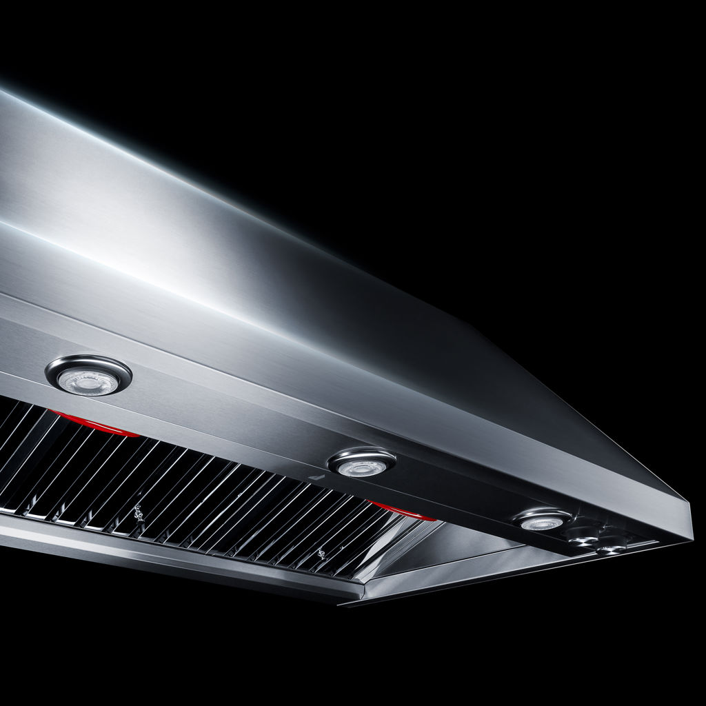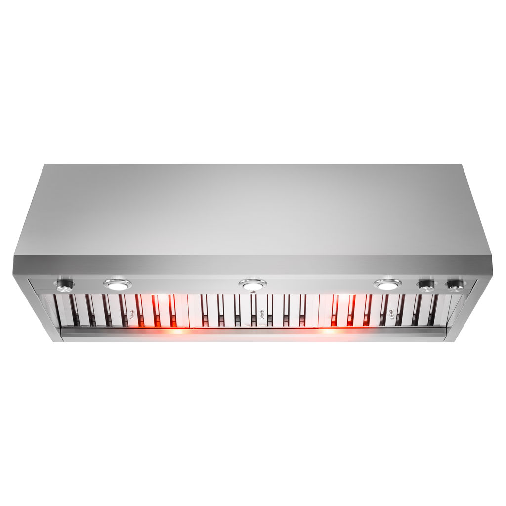 This powerful JennAir wall-mounted range hood eliminates cooking fumes, vapors, and odours. With its exceptional 1200 cfm fan, this deluxe model is designed to work with commercial-style, high-heat cooking appliances.