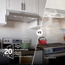 The durable hood vent is up to 20% more effective at removing pollutants than the leading competitor with power ventilation at 350 Max Blower CFM to capture and remove smoke and odors from the kitchen.