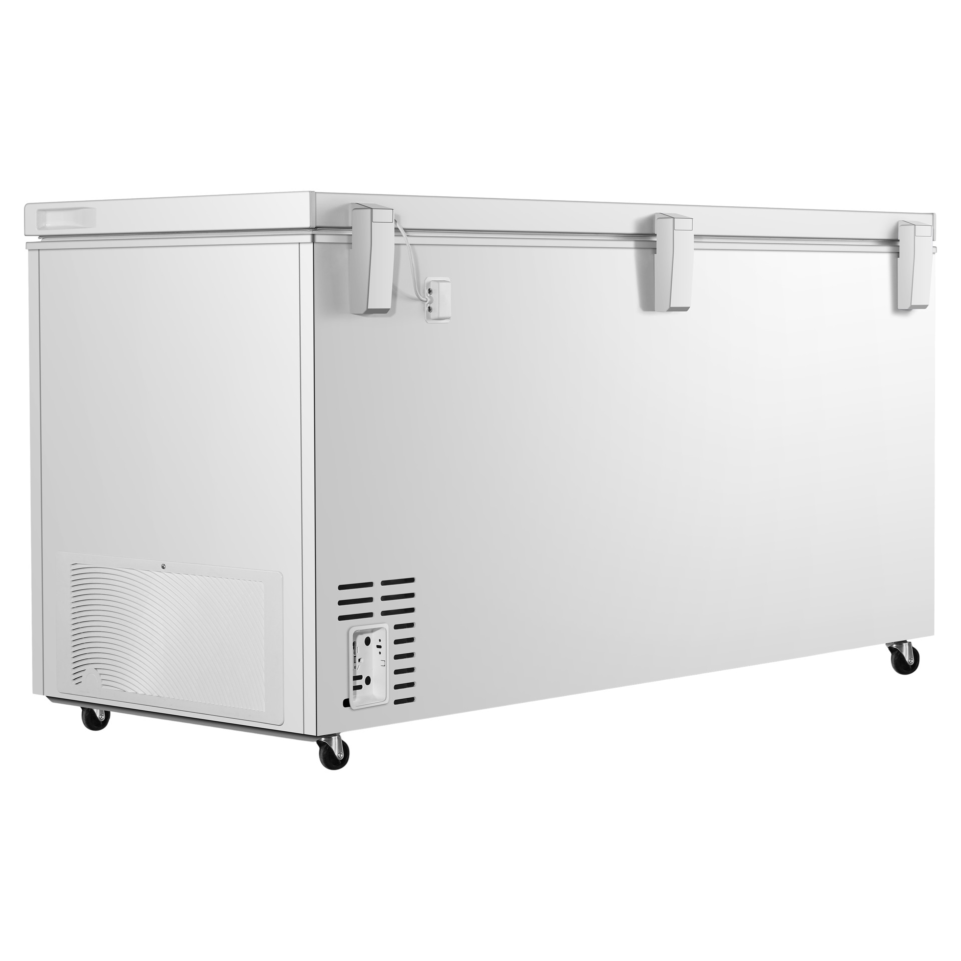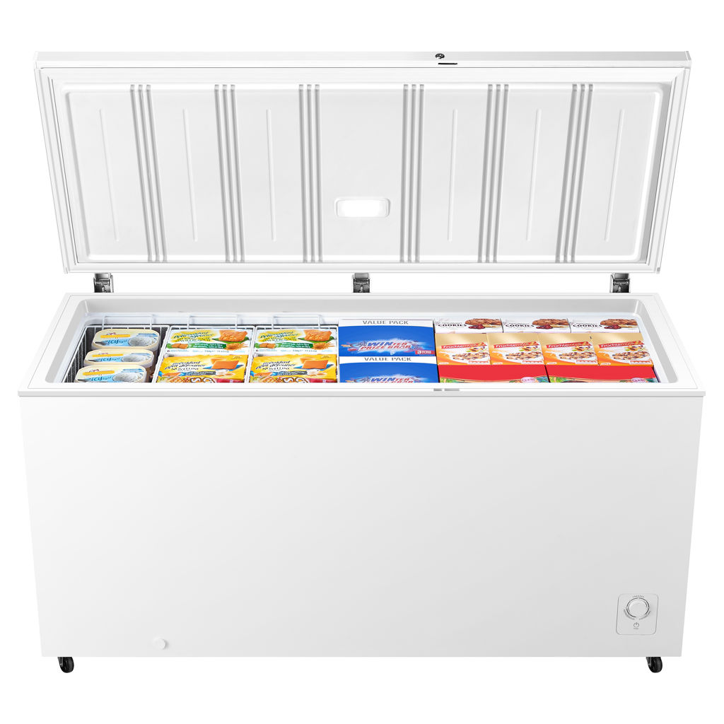With an enormous capacity of 17.7 cubic feet, this Hisense chest freezer has the capacity to meet the needs of your whole family. Featuring adjustable temperature on the outside and equipped with LED lighting for visibility inside. The multi-seal door design and aluminum interior lining make cleaning easy.